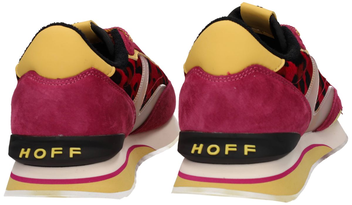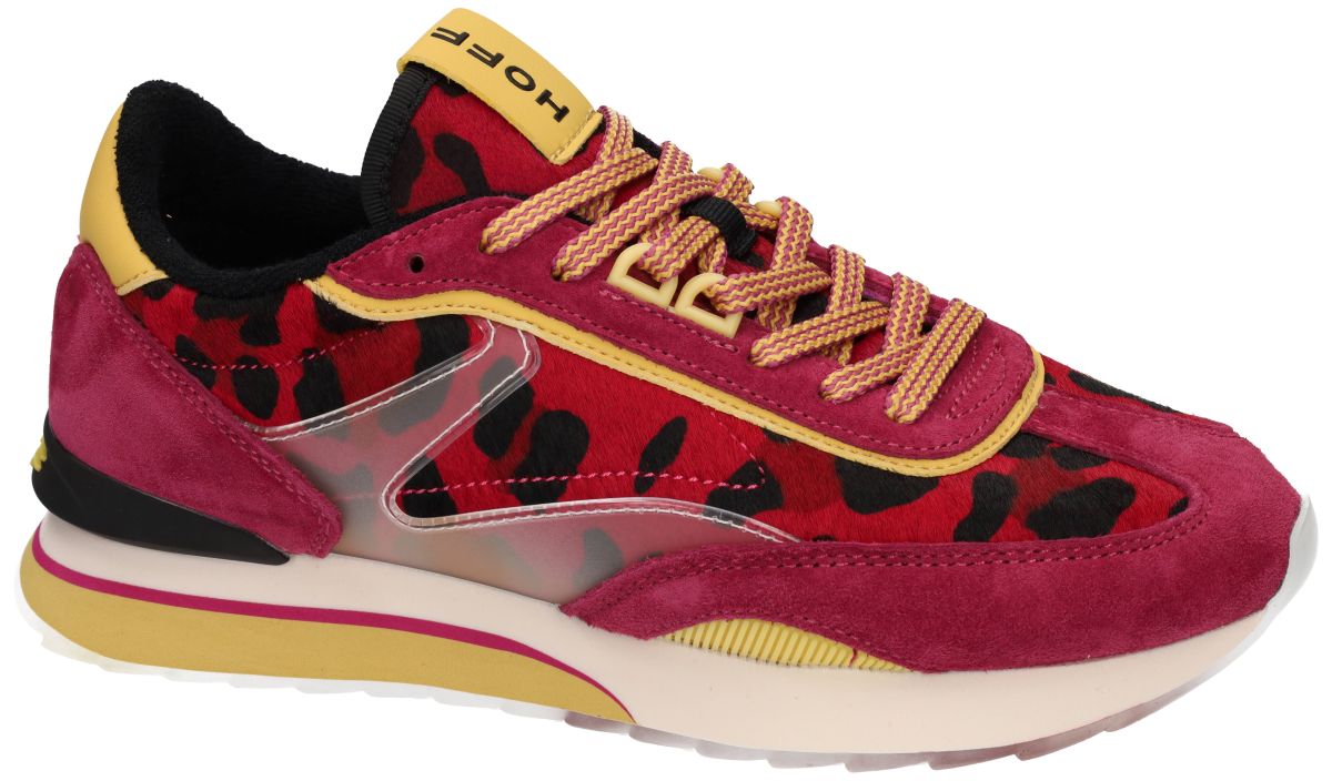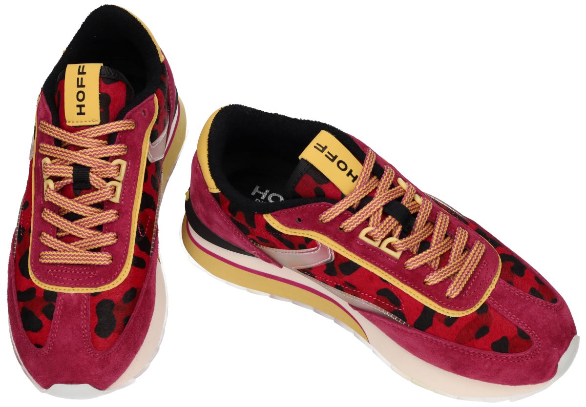 Ontdek de nieuwe Hoff Pink Lady damessneakers, een zeer opvallend en stijlvol paar schoenen uit de herfst/wintercollectie van 2024. Deze sneakers zijn een perfecte mix van comfort en trendy design, ideaal voor de modebewuste vrouw die durft opvallen. De Pink Lady sneakers zijn ontworpen met een levendige kleurencombinatie die direct in het oog springt. Het bovenwerk combineert rijk fuchsia donkerroze nubuck met een gedurfde rood-zwarte dierenprint, waardoor een dynamisch en speels patroon ontstaat. Een van de opvallendste kenmerken is de rood met zwarte vlekken luipaardprint op imitatie pels, die deze sneakers een wilde en gedurfde uitstraling geeft. De gele details bij de hiel en veters geven een extra vleugje flair en maken het geheel compleet. Het eigenzinnige ontwerp van deze sneakers wordt verder benadrukt door de iconische zool met kunstzinnige print. Deze zool biedt niet alleen visuele aantrekkingskracht, maar ook uitstekende grip en duurzaamheid. De hoge kwaliteit materialen en de zorgvuldige afwerking zorgen voor een luxe uitstraling en ultiem draagcomfort. Met de Hoff Pink Lady sneakers voeg je een vleugje kleur en persoonlijkheid toe aan elke outfit. Of je nu gaat voor een casual look met jeans of een meer gedurfde stijl met een jurk, deze sneakers maken elke outfit compleet. Stap in stijl de herfst en winter in met de onmiskenbare charme en het comfort van de Hoff Pink Lady damessneakers. De nieuwste Hoff schoenen collectie vindt men in onze schoenenwinkel regio Aalst, Ninove, Geraardsbergen, Zottegem, Liedekerke of kan men online bestellen in onze webshop.