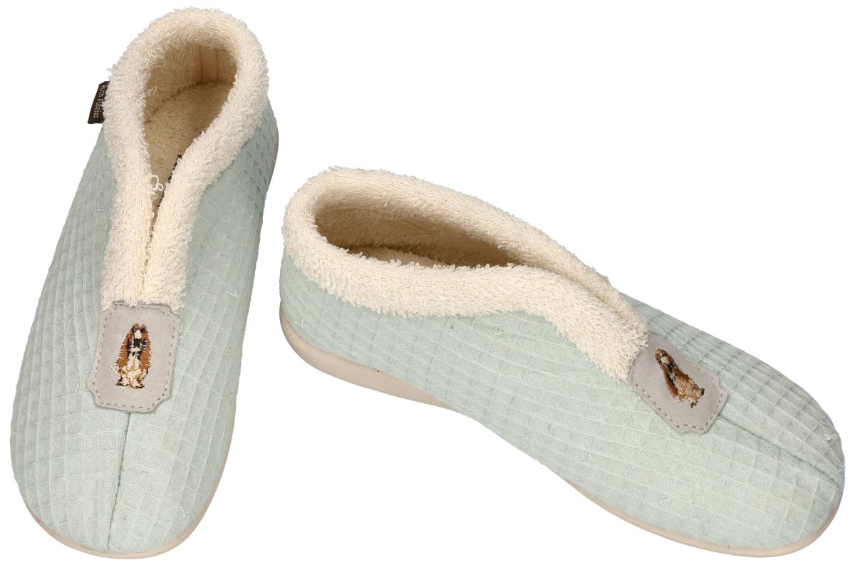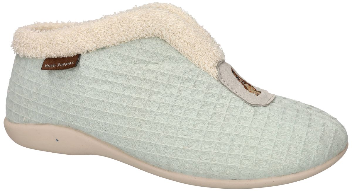 Deze gesloten damespantoffels of sloffen van Hush Puppies, model 1.OISIM in de uitvoering Wafel Aqua, zijn ontworpen als een lichte en frisse lente/zomer pantoffel die comfort en luchtigheid perfect combineert. Ideaal voor wie ook binnenshuis houdt van een verzorgd en aangenaam draaggevoel tijdens warmere dagen. De upper is uitgevoerd in licht turquoise tot aquamarijn textiel met een fijne wafelstructuur, wat niet alleen voor een zomerse uitstraling zorgt maar ook bijdraagt aan een goede ventilatie. De subtiele structuur geeft deze pantoffel een verzorgde, eigentijdse look die verder gaat dan de klassieke slof. Binnenin werd gekozen voor een zachte badstof textielvoering, die ook doorloopt in de comfortabele boord rond de enkel. Dit zorgt voor een aangenaam, absorberend en huidvriendelijk gevoel, ideaal voor blote voeten in de lente en zomer. De licht verhoogde instap en gesloten hiel bieden extra stabiliteit zonder zwaar aan te voelen. De rubberen zool is soepel en licht, en is bovendien voorzien van antislip eigenschappen, waardoor u ook op gladde vloeren verzekerd bent van een stabiele tred. Opvallend detail is het iconische Hush Puppies-label en het geborduurde hondje op de wreef, wat deze pantoffel een herkenbare en charmante afwerking geeft. Kortom, de Hush Puppies 1.OISIM Wafel Aqua is een ideale keuze voor dames die op zoek zijn naar een luchtige zomerpantoffel, met een zachte badstofvoering, een frisse kleurstelling en een comfortabele antislipzool – perfect voor dagelijks comfort binnenshuis. Hush Puppies pantoffels vindt men in onze schoenenwinkel regio Aalst, Ninove, Geraardsbergen, Zottegem, Liedekerke of kan men online bestellen op onze webshop.
