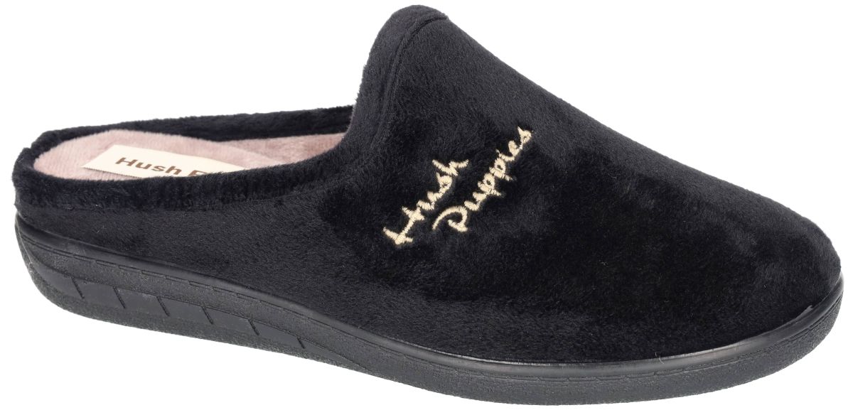 Hush Puppies – 45.DEL Negro Grenoble. De Hush Puppies 45.DEL in de uitvoering Negro Grenoble is een stijlvolle en comfortabele damespantoffel die huiselijk comfort combineert met een verfijnde, geklede look. Deze zwarte versie straalt tijdloze elegantie uit en voelt dankzij het zachte materiaal als een warme omhelzing voor uw voeten. De upper is vervaardigd uit fluweelzacht zwart molton textiel, dat aangenaam warm aanvoelt en zich soepel rond de voet vormt. Op de wreef prijkt het Hush Puppies-logo in goudkleurig borduursel, wat de pantoffel een luxueuze uitstraling geeft. De zwarte rubberen zool is licht, flexibel en voorzien van een antislip loopvlak dat extra stabiliteit biedt op gladde vloeren. Binnenin zorgt het malse memory kussen-voetbed voor een zacht en dempend loopgevoel. De lichte hiel-lift van 2 cm ondersteunt de natuurlijke houding en verhoogt het comfort bij langdurig dragen. De fijne boordafwerking rond de instap maakt het geheel niet alleen comfortabel maar ook keurig afgewerkt. Deze pantoffels worden gemaakt in Spanje, waar vakmanschap en comfort al decennialang hand in hand gaan — een garantie voor kwaliteit en duurzaamheid. Wie houdt van tijdloze elegantie en zacht comfort. De Hush Puppies 45.DEL Negro is een luxueuze winterpantoffel die warmte, steun en stijl combineert – ideaal voor wie zich ook thuis graag comfortabel én verzorgd voelt. Hush Puppies pantoffels vindt men in onze schoenenwinkel regio Aalst, Ninove, Geraardsbergen, Zottegem, Liedekerke of kan men online bestellen op onze webshop.