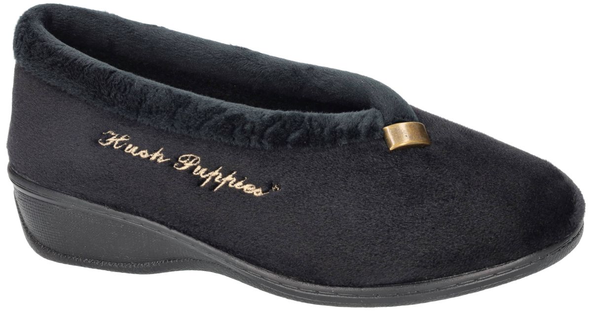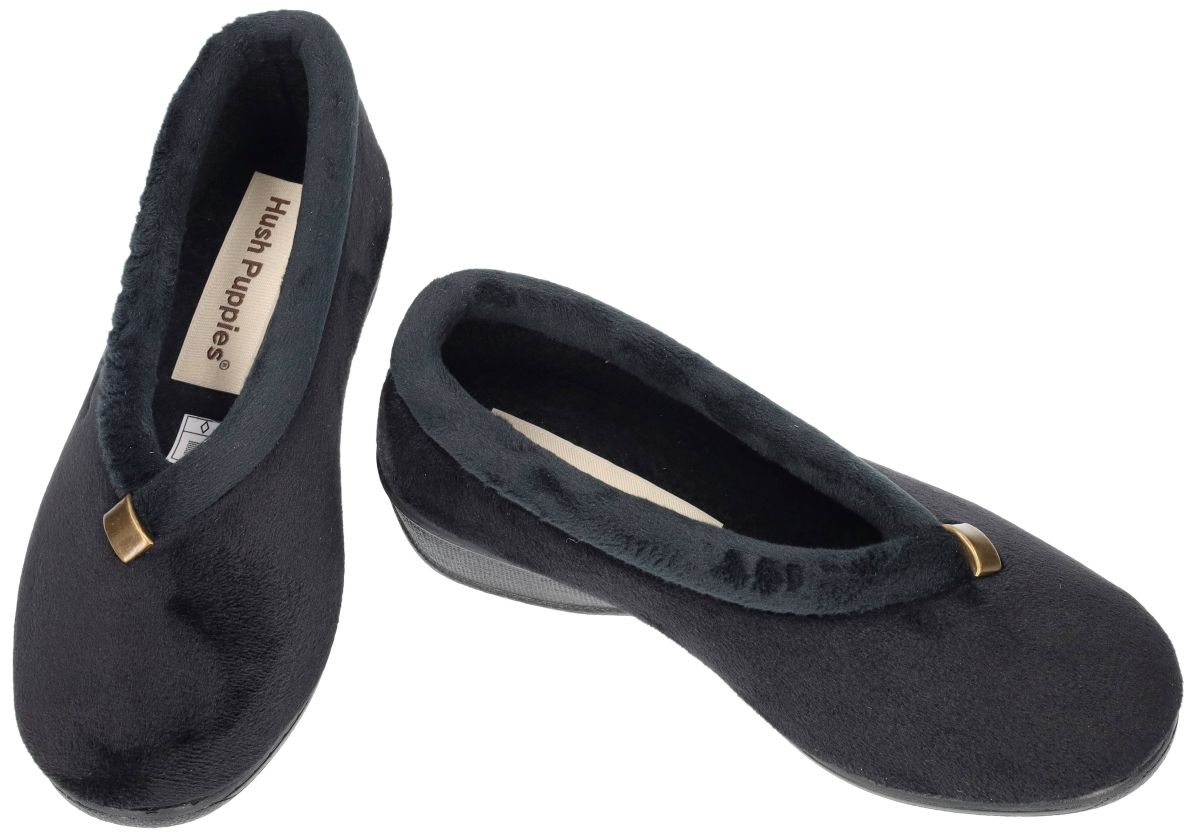 Hush Puppies damespantoffels – model Dilto Negro. Ontdek het ultieme comfort met deze gesloten pantoffels voor dames van Hush Puppies, ontworpen voor warme en ontspannen momenten binnenshuis. De zool is vervaardigd uit duurzaam natuurrubber, waardoor ze niet alleen flexibel maar ook slipvast en slijtvast zijn – ideaal voor gebruik op gladde vloeren. De diep zwarte, fluweelzachte textiel upper voelt aangenaam aan en zorgt voor een luxueuze uitstraling. De zachte, gewatteerde boord sluit mooi rond de voet aan, zodat de pantoffels perfect blijven zitten zonder te knellen. Het subtiele koperkleurige detail aan de voorzijde en de goud gestikte merknaam in geschreven karakters geeft het ontwerp een verfijnde en stijlvolle toets. De lichte sleehak van 2,5 cm biedt een zachte hielverhoging die het draagcomfort nog verhoogt en de druk op de voeten vermindert. Dankzij de gevoerde binnenkant voelen deze sloffen heerlijk warm aan tijdens koude dagen. Perfect voor wie houdt van stijlvol comfort in huis, met de gekende kwaliteit van Hush Puppies. Hush Puppies pantoffels vindt men in onze schoenenwinkel regio Aalst, Ninove, Geraardsbergen, Zottegem, Liedekerke of kan men online bestellen op onze webshop.