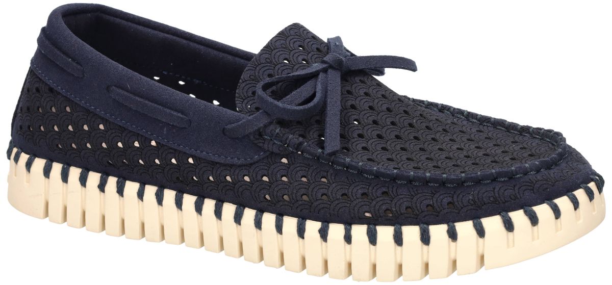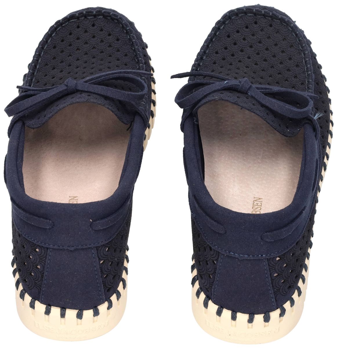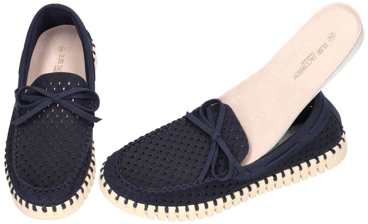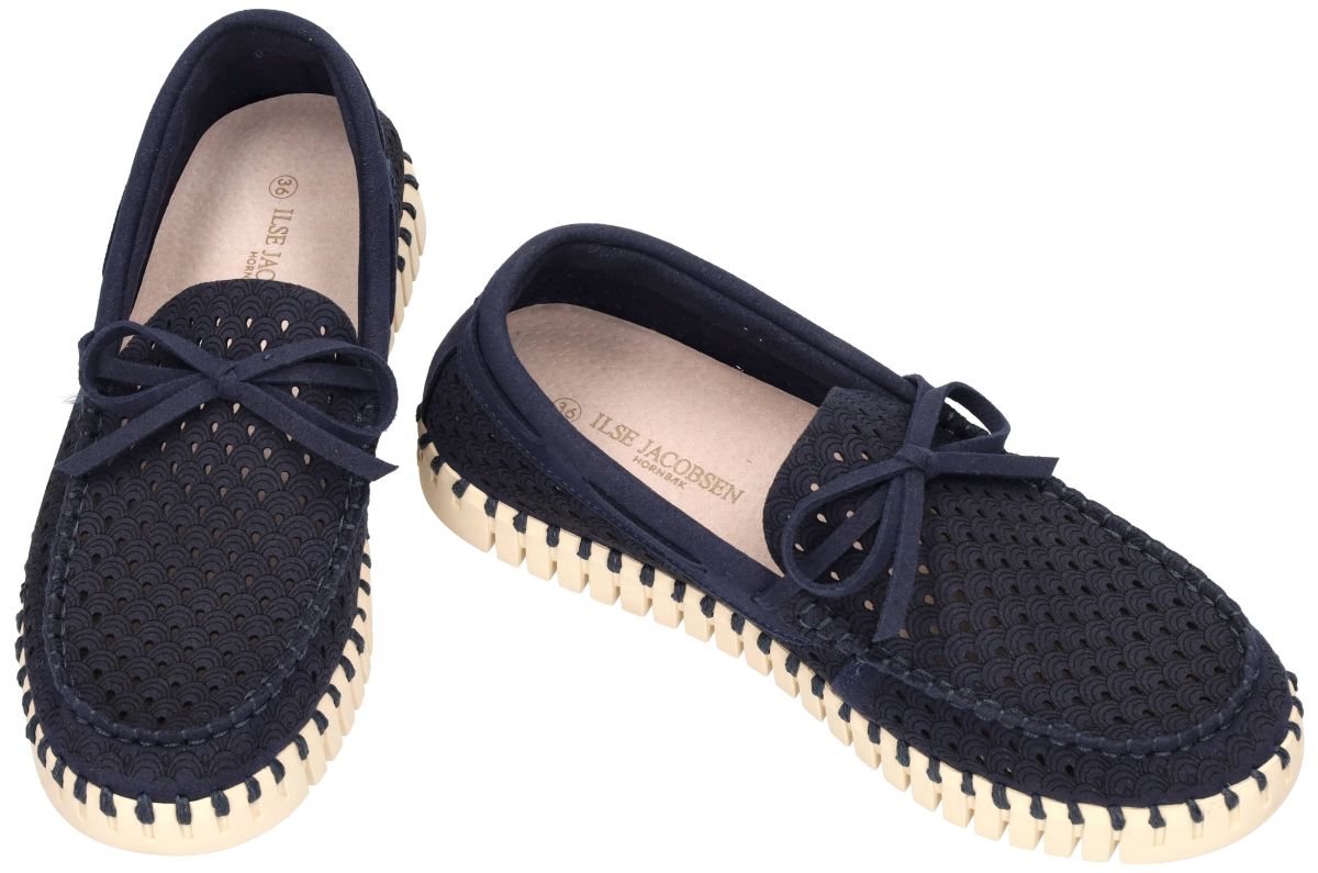 Ilse Jacobsen Tulip Sailor Shoe – TULIP3074 – Dark Indigo Pearled Ivory. Deze stijlvolle Tulip Sailor Shoe uit de nieuwe collectie van Ilse Jacobsen combineert het typische Scandinavische design met uitzonderlijk comfort en duurzaamheid. Model TULIP3074 in de uitvoering Dark Indigo Pearled Ivory (660111) is een elegante bootschoen geïnspireerd op het maritieme mocassinmodel, maar uitgevoerd in de kenmerkende Tulip-technologie van Ilse Jacobsen. Het bovenwerk is vervaardigd uit duurzame gerecycleerde microvezel in een donkerblauwe of donker indigo tint. De schoen is afgewerkt met een verfijnd laser-cut patroon met kleine perforaties in een decoratief tulp - of waaiermotief. Dit patroon zorgt niet alleen voor een stijlvolle uitstraling, maar maakt de schoen ook extra luchtig en ademend tijdens warme dagen. Het ontwerp is geïnspireerd op klassieke bootschoenen met een decoratieve mocassinbelijning en een strikje op de wreef, wat het model een elegante en zomerse uitstraling geeft. Rond de schoen loopt een kenmerkende gestikte randconstructie, waarbij de bovenkant van de schoen met een stevige draad aan de zool wordt bevestigd. Deze genaaide constructie gebeurt zonder gebruik van lijm, wat niet alleen duurzamer is maar ook zorgt voor een grotere flexibiliteit. Zoals alle Tulip schoenen staat ook dit model op een lichte en volledig flexibele zool van natuurlijk rubber. De zool heeft een uitgesproken profiel en een karakteristieke ribstructuur, waardoor ze zowel comfortabel als slipvast is. Dankzij deze flexibele zool volgt de schoen moeiteloos de natuurlijke beweging van de voet. Binnenin zorgt een zacht gepolsterd voetbed voor extra comfort en ondersteuning tijdens het wandelen. De combinatie van het lichte gewicht, de zachte materialen en de flexibele zool maakt deze schoen ideaal voor dagelijks gebruik, citytrips of vakantie. De dark indigo Tulip Sailor Shoe TULIP3074 past perfect binnen de Scandinavische lifestyle van Ilse Jacobsen: minimalistisch, stijlvol en functioneel. Deze schoen laat zich moeiteloos combineren met zowel casual zomerse outfits als een elegante vrijetijdslook. Ilse Jacobsen schoenen kan men aanschaffen in onze schoenenwinkel regio Aalst, Ninove, Geraardsbergen, Zottegem, Liedekerke of online bestellen op onze webshop.