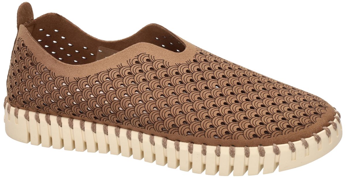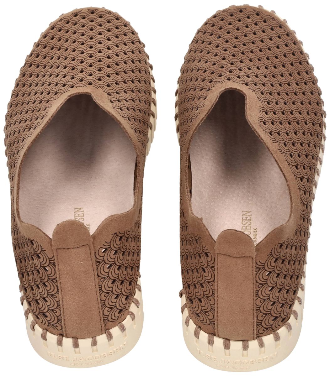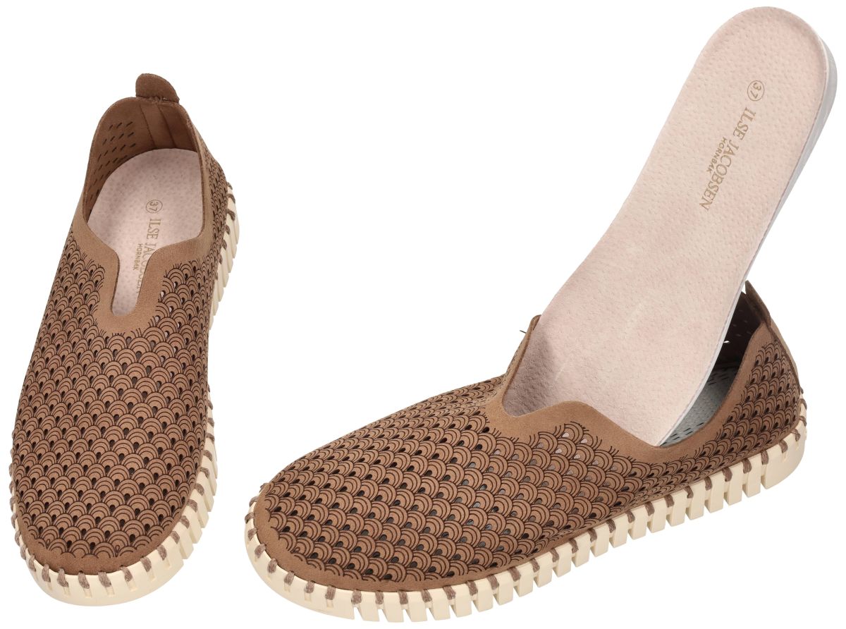 Ilse Jacobsen Tulip – TULIP3275 – Mocca (248). Deze stijlvolle en uiterst comfortabele instapschoenen uit de nieuwe collectie van Ilse Jacobsen combineren Scandinavisch minimalisme met het kenmerkende comfort van de Tulip-serie. Model TULIP3275 in de uitvoering Mocca (248) is een elegante loafer of mocassin die perfect past bij zowel casual outfits als een meer verzorgde vrijetijdslook. Het bovenwerk is vervaardigd uit duurzame gerecycleerde microvezel in een warme mocca-bruine tint. Over het volledige oppervlak loopt een verfijnd laser-cut patroon in een decoratief waaier- of tulpenmotief, dat zorgt voor een subtiele textuur en een stijlvolle uitstraling. De fijne perforaties maken de schoen bovendien luchtig en ademend, waardoor hij bijzonder aangenaam is om te dragen tijdens warmere dagen. Het model heeft een minimalistische instapvorm met een elegante uitsnijding aan de wreef, waardoor de schoen gemakkelijk aan en uit te trekken is. De licht golvende opening volgt de natuurlijke vorm van de voet en geeft het ontwerp een verfijnde, vrouwelijke belijning. Zoals typisch voor de Tulip-collectie wordt het bovenwerk met een sterke draad rondom aan de zool genaaid "geknoopt", een duurzame constructie die zonder gebruik van lijm wordt vervaardigd. Deze techniek zorgt voor extra flexibiliteit en draagt bij aan het lichte en soepele draaggevoel. De schoen staat op de karakteristieke Tulip-zool in licht crème, vervaardigd uit natuurlijk rubber. Deze zool is uitzonderlijk licht, flexibel en schokdempend en heeft een opvallende ribstructuur die extra grip en stabiliteit biedt tijdens het lopen. Binnenin zorgt een met leder bekleed latex voetbed voor een comfortabel en ondersteunend gevoel bij elke stap. Dankzij het lichte gewicht en de soepele constructie zijn deze schoenen ideaal voor dagelijks gebruik, wandelingen, reizen of een ontspannen dag in de stad. Met zijn warme mocca-bruine kleur, verfijnde perforatiepatroon en het typische Scandinavische design vormt deze Ilse Jacobsen Tulip TULIP3275 een perfecte combinatie van stijl, comfort en duurzaamheid. Een lichte, ademende en uiterst comfortabele instapschoen die perfect aansluit bij de ontspannen Scandinavische lifestyle waar Ilse Jacobsen om bekendstaat. Ilse Jacobsen schoenen kan men aanschaffen in onze schoenenwinkel regio Aalst, Ninove, Geraardsbergen, Zottegem, Liedekerke of online bestellen op onze webshop.
