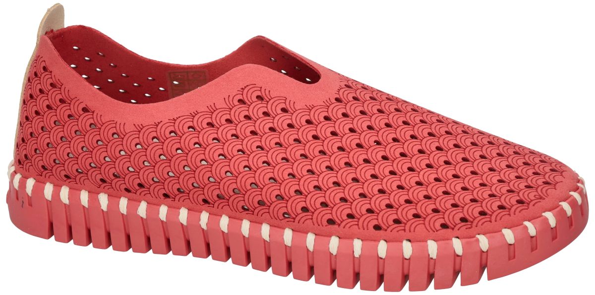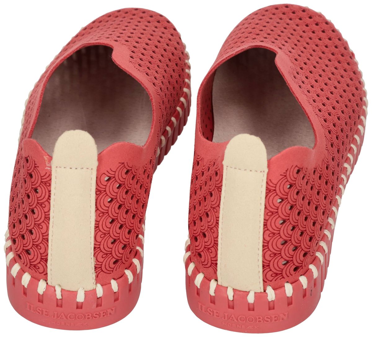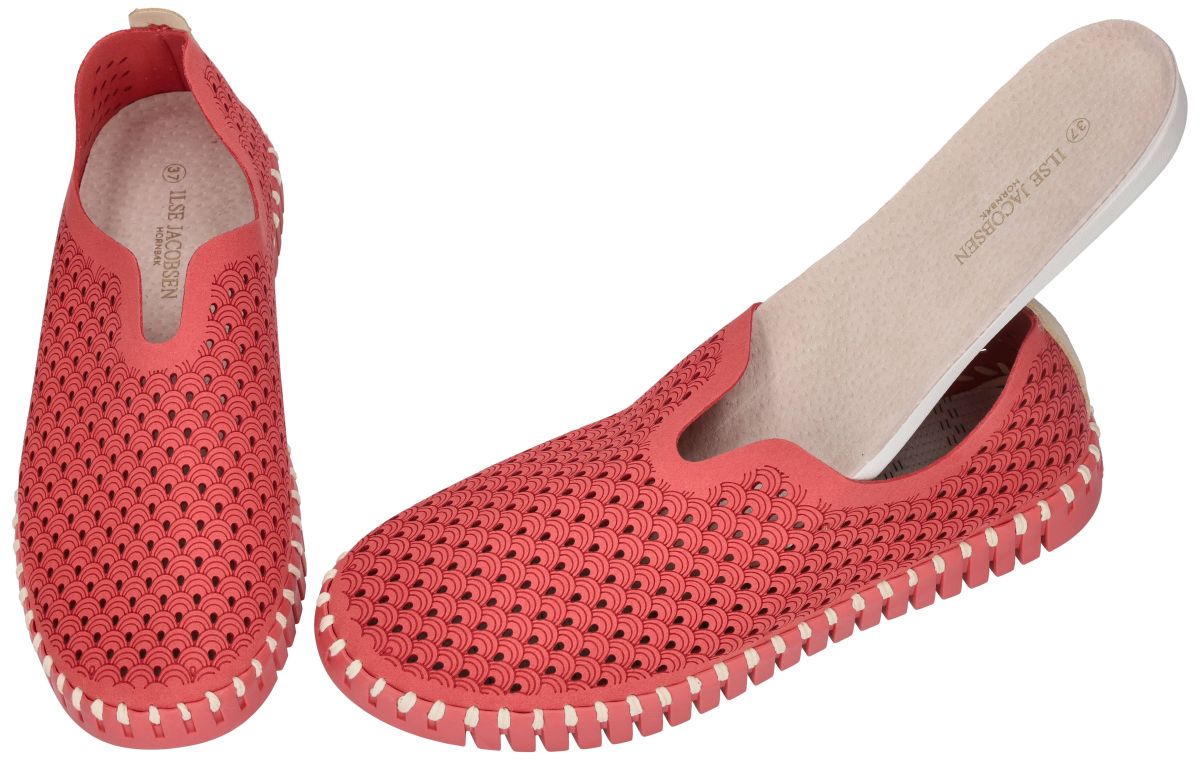 Ilse Jacobsen Tulip Slip-In – TULIP3977 – Baked Apple (308308). Deze frisse en comfortabele instapschoenen uit de iconische Tulip-collectie van Ilse Jacobsen combineren Scandinavisch design met een uitzonderlijk licht draagcomfort. Het model Tulip Slip-In TULIP3977 in de opvallende koraalrode kleur Baked Apple (308308) is een moderne en luchtige loafer die perfect past bij een casual zomerse garderobe. Het bovenwerk is vervaardigd uit soepel en licht microvezelmateriaal in een levendige rood-koraal tint die door Ilse Jacobsen wordt omschreven als Baked Apple. Over het volledige bovenwerk loopt een verfijnd laser-gesneden schub- of waaierpatroon, dat niet alleen een speelse en elegante uitstraling geeft, maar ook zorgt voor een ademend en luchtig effect. De kleine perforaties laten lucht circuleren zodat de voeten fris blijven tijdens warme dagen. Het model heeft een minimalistische slip-in vorm met een subtiele uitsparing aan de wreef, waardoor de schoen elegant rond de voet aansluit en eenvoudig aan te trekken is. Achteraan bevindt zich een contrasterende aantreklus in licht beige, die het instappen nog gemakkelijker maakt en tegelijk een mooi detail vormt in het design. Kenmerkend voor de Tulip-serie is de handgestikte constructie, waarbij het bovenwerk met een stevige draad rondom aan de zool wordt bevestigd . Deze constructie gebeurt zonder gebruik van lijm, wat de schoen niet alleen duurzamer maakt maar ook extra flexibel en comfortabel. De schoen rust op de typische Tulip-zool in dezelfde kleur Baked Apple, vervaardigd uit licht en flexibel natuurlijk rubber. De uitgesproken ribstructuur van de zool zorgt voor een goede grip en demping, terwijl de flexibiliteit ervoor zorgt dat de schoen perfect meebeweegt met de natuurlijke afwikkeling van de voet. Binnenin zorgt een zacht met leer bekleed latex voetbed voor langdurig comfort. Dankzij het lage gewicht, de flexibele zool en het ademende ontwerp zijn deze instappers ideaal voor dagelijks gebruik, reizen of lange zomerse wandelingen. Met zijn frisse kleur, luchtige perforaties en iconisch Tulip-comfort is deze Ilse Jacobsen Tulip Slip-In een perfecte mix van functionaliteit, design en Scandinavische eenvoud. Een lichte, ademende en opvallend stijlvolle instapschoen die het kenmerkende comfort van de Tulip-lijn combineert met een levendige zomerkleur. Ilse Jacobsen schoenen kan men aanschaffen in onze schoenenwinkel regio Aalst, Ninove, Geraardsbergen, Zottegem, Liedekerke of online bestellen op onze webshop.