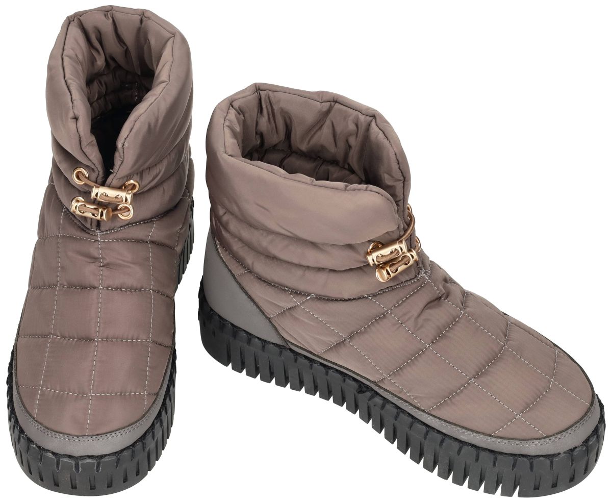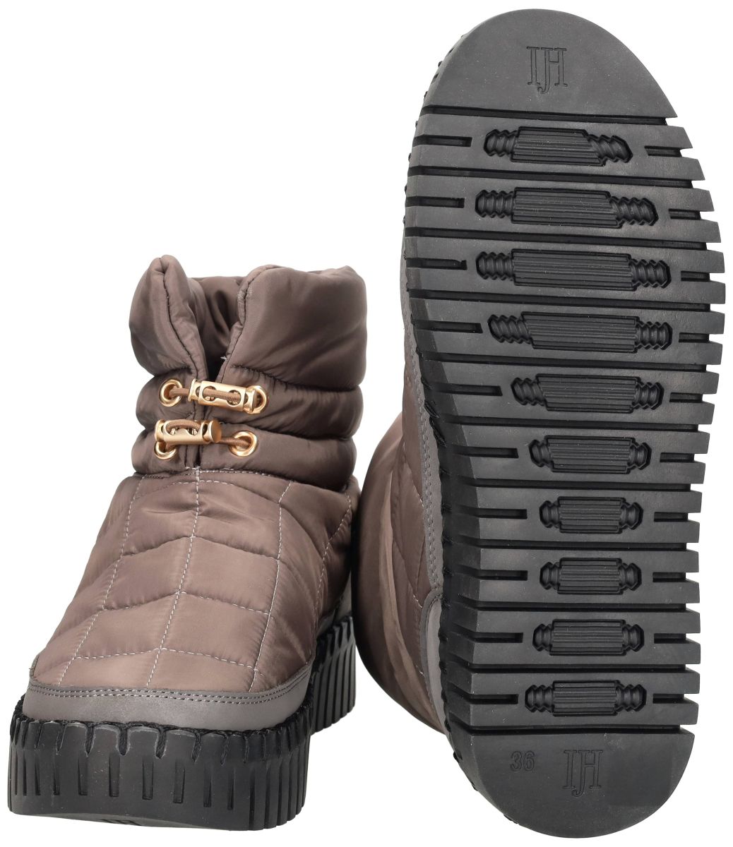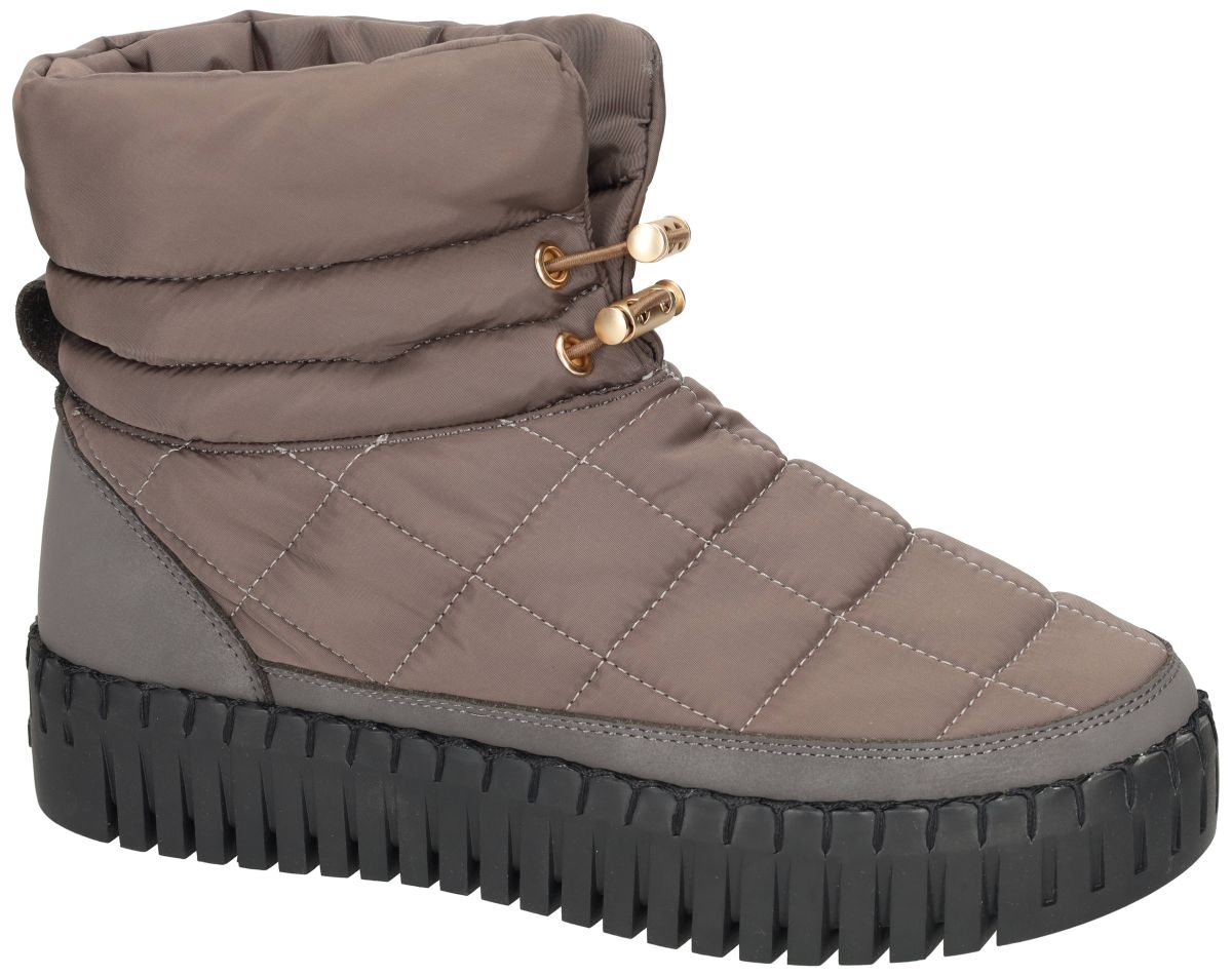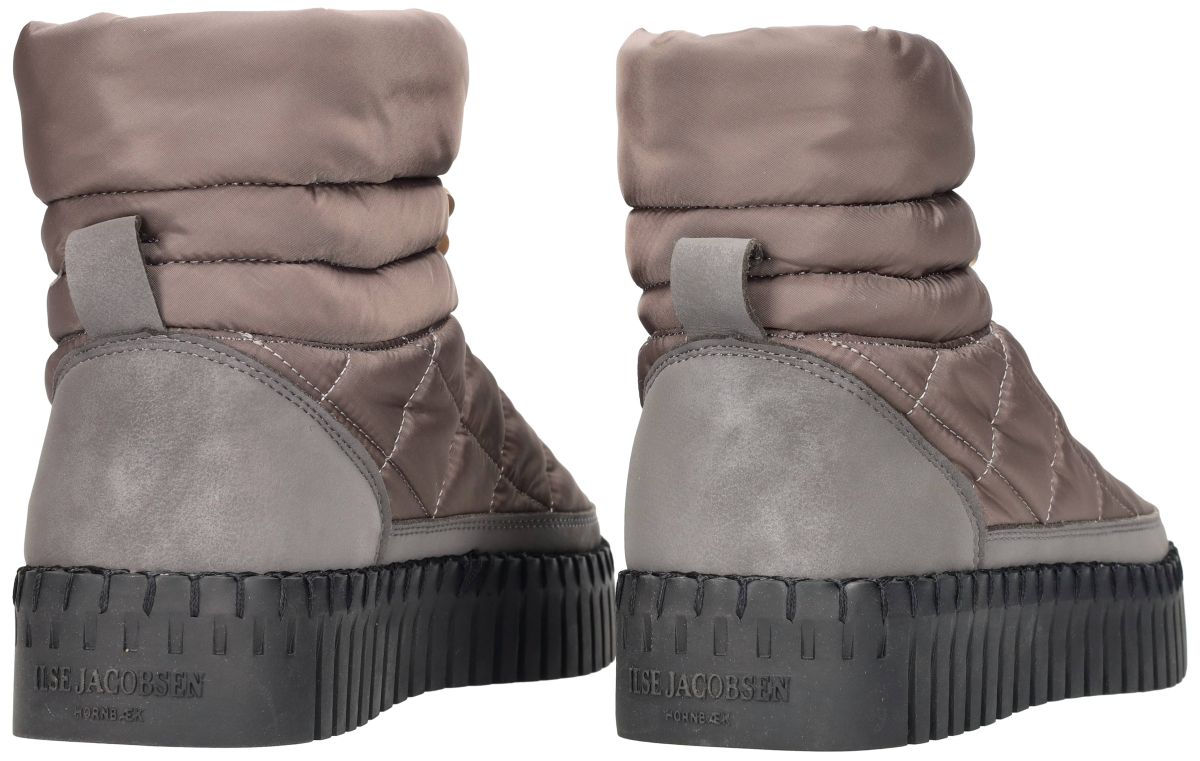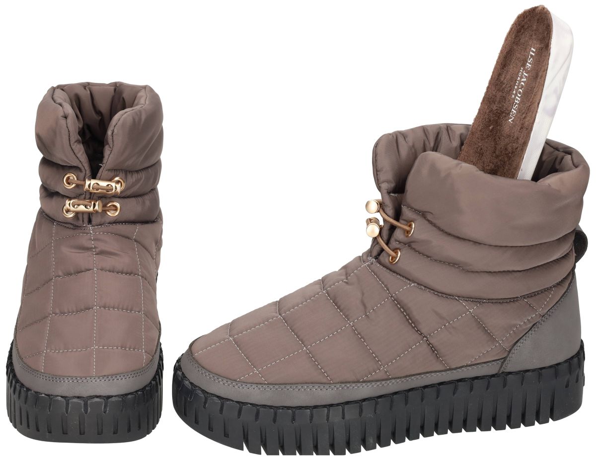 Ilse Jacobsen Hornbæk – Tulip6082 Grey Black. Deze Ilse Jacobsen Hornbæk Tulip6082 is een trendy met parachuttestof gewatteerde winterboot die Scandinavisch design combineert met duurzame kwaliteit en optimaal draagcomfort. In de Grey Black-uitvoering straalt hij moderne elegantie uit, ideaal voor koude, vochtige of winderige dagen. De bovenkant is vervaardigd uit gemattelaseerd doorgestikt, waterafstotend nylon met zachte isolerende voering. De quilted structuur geeft de laars een luxueuze winterlook en houdt de voeten aangenaam warm. De koordsluiting met goudkleurige metalen snelsluiting maakt het geheel verfijnd én zorgt ervoor dat de schacht mooi aansluit rond de enkel. Wat deze Tulip-boots onderscheidt, is de duurzame constructie: de upper is volledig aan de zool genaaid (gehaakt) met gerecycleerde stikdraad (recycled stitching) en zonder gebruik van lijm. Dit milieubewuste productieproces maakt de schoen niet alleen sterker en flexibeler, maar ook beter recycleerbaar aan het einde van zijn levenscyclus. De Tulip-loopzool, gemaakt van 75 % natuurlijk rubber en 25 % gerecycled rubber, heeft een robuust profiel en biedt uitstekende grip. Met een zooldikte van circa 4 cm geniet je bovendien van extra isolatie en een subtiele verhoging die de voeten droog en comfortabel houdt. De uitneembare, dempende inlegzool en de zachte microfiber-binnenvoering zorgen voor een heerlijk warm en licht draaggevoel. Deze Ilse Jacobsen Tulip6082 Grey Black is ideaal voor wie houdt van duurzaam Scandinavisch design met een luxueuze, winterproof uitstraling. Combineer moeiteloos met een pufferjas, een wollen mantel of casual vrijetijdskledij voor een warme, modieuze look tijdens koude dagen in de stad of aan zee. Ilse Jacobsen schoenen kan men aanschaffen in onze schoenenwinkel regio Aalst, Ninove, Geraardsbergen of online bestellen op onze webshop.