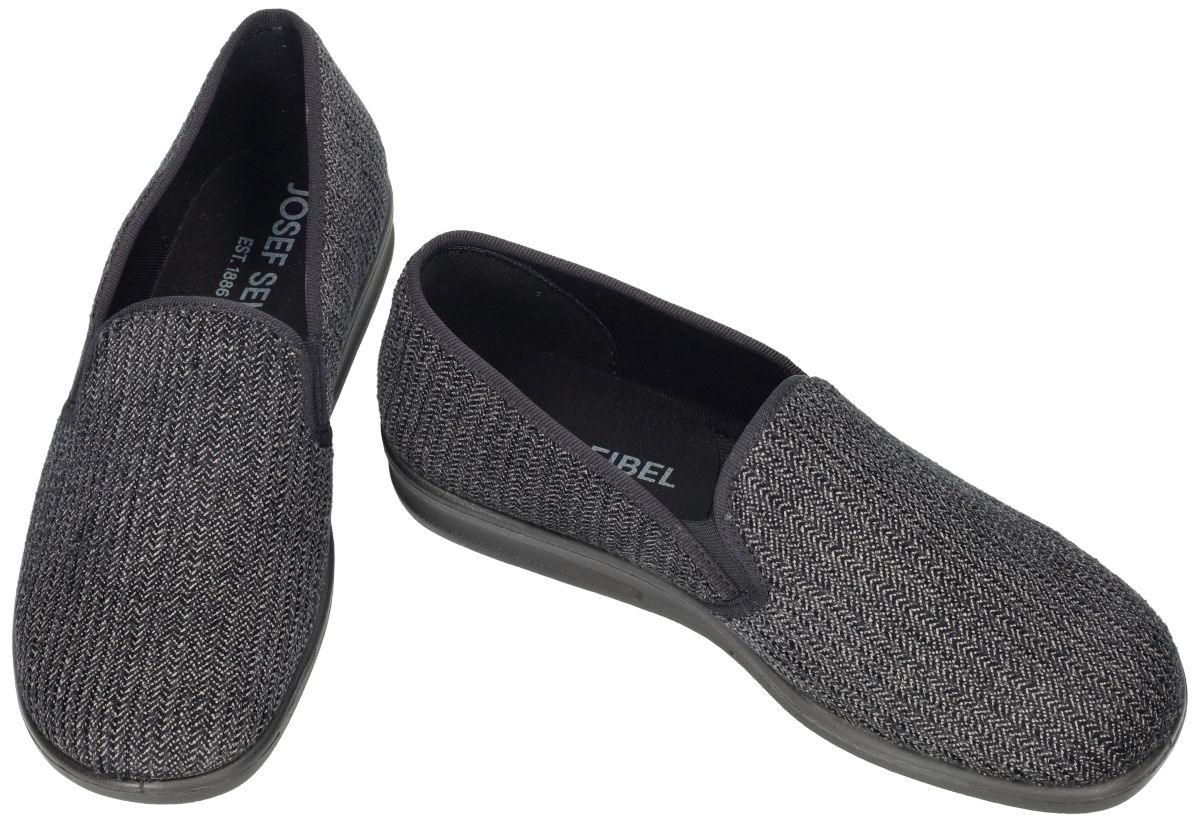 Deze Josef Seibel herenpantoffel Belfort 122 in zwart/grijs is een comfortabele en tijdloze instapper met een lange traditie. Dit model kent zijn oorsprong bij Romika als model Präsident, werd later verkocht als Westland Belfort 122 en maakt vandaag deel uit van de collectie van Josef Seibel. Net als zijn voorgangers wordt ook deze pantoffel nog steeds op dezelfde wijze vervaardigd in dezelfde fabriek in Trier, wat garant staat voor constante kwaliteit en vakmanschap. De Belfort 122 is ontworpen als een lichte, gesloten herenslof die het hele jaar door gedragen kan worden. De textiele upper is uitgevoerd in zwart/grijs ribfluweel met een subtiel kabelmotief, wat zorgt voor een verzorgde en warme uitstraling zonder zwaar aan te voelen. De binnenvoering in zwart jeans-textiel draagt bij aan een aangenaam, fris draaggevoel, ideaal voor dagelijks gebruik. De slijtvaste PU-zool is naadloos aan de upper aangegoten, wat niet alleen de levensduur verlengt maar ook zorgt voor extra stabiliteit en comfort. Dankzij deze stevige zool zijn de pantoffels geschikt voor zowel binnen- als buitenshuis gebruik, bijvoorbeeld voor korte verplaatsingen rond het huis. Met zijn ruime G-wijdte leest biedt de Belfort 122 voldoende plaats aan de voet, terwijl de elastische inkepingen aan de wreef ervoor zorgen dat deze pantoffel vlot aan en uit te trekken is. Dit maakt hem bijzonder geschikt voor mannen die op zoek zijn naar een makkelijke, frisse instapper die comfort en praktisch gebruik combineert. Kortom, de Josef Seibel Belfort 122 schwarz is een betrouwbare herenpantoffel die traditie, lichtheid en draagcomfort perfect samenbrengt. Een ideale keuze voor mannen die zomer en winter willen genieten van een comfortabele instapslof die niet te warm aanvoelt voor dagelijks gebruik binnen én buiten. Schoenen van Josef Seibel (voorheen Romika en Westland) vindt men in onze schoenenwinkel regio Aalst, Ninove, Geraardsbergen, Zottegem, Liedekerke of kan men online bestellen op onze webshop.