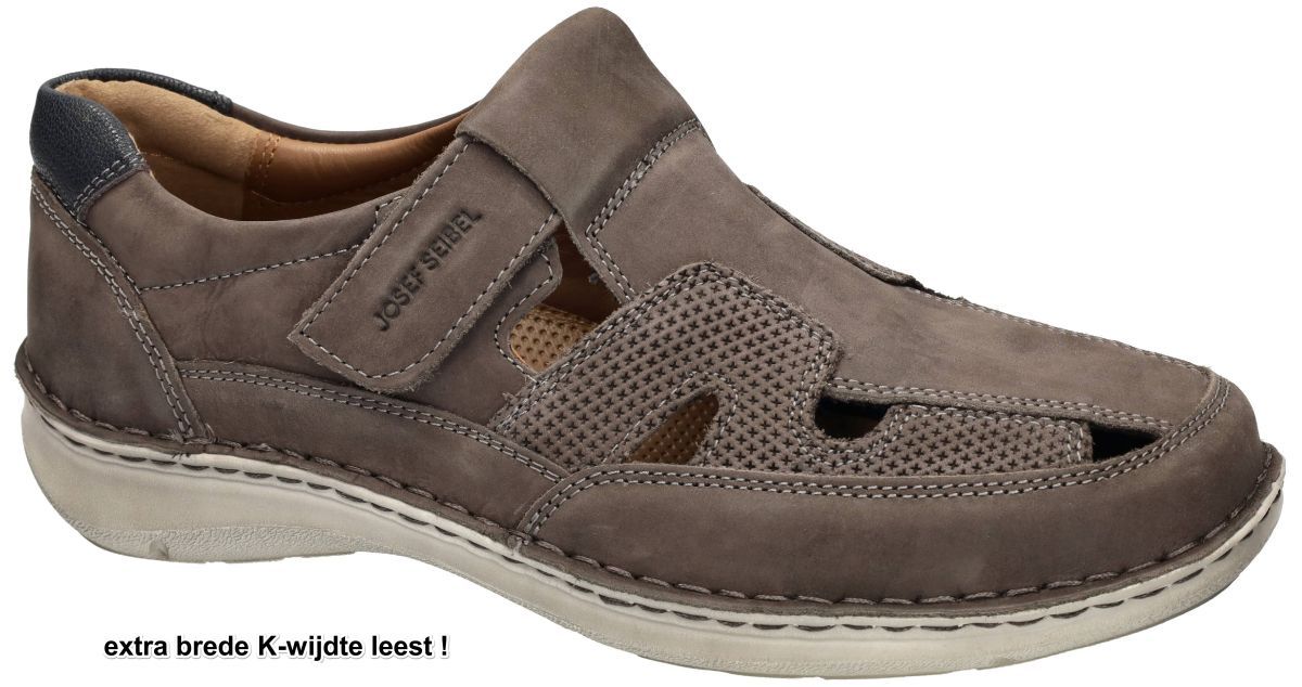 Josef Seibel New Anvers 81 - Extra brede herensandalen met ultiem comfort. De Josef Seibel New Anvers 81 in de uitvoering Kerala nubuck granit is de ideale keuze voor heren die op zoek zijn naar maximaal comfort en een ruime pasvorm. Deze gesloten sandaal is uitgevoerd in een extra brede K-wijdte leest, wat zorgt voor een ongeëvenaarde pasvorm voor brede en volumineuze voeten. Kenmerken van de Josef Seibel New Anvers 81: Extra brede K-wijdte: Perfect voor heren die extra ruimte nodig hebben in hun schoeisel. Donker taupe nubuck upper: hoogkwalitatief en stijlvol nubuckleer dat zacht en duurzaam is. Uitneembaar latex voetbed: Een malse, schokabsorberende binnenzool voor optimaal loopcomfort. Geschikt voor steunzolen: Het voetbed is eenvoudig te vervangen door eigen orthopedische inlegzolen. Klittenbandsluiting: Voor een makkelijke instap en perfecte pasvorm. Kalfslederen binnenvoering: Voelt zacht aan de voet en verhoogt het draagcomfort. Schokabsorberende loopzool: Vermindert de impact van uw gewicht en op de gewrichten en zorgt voor stabiliteit bij elke stap. Comfort en functionaliteit in één! De Josef Seibel New Anvers 81 is ontworpen voor lange dagen op de been, of dat nu thuis, op vakantie of tijdens een wandeling is. De combinatie van hoogwaardige materialen en een verfijnd ontwerp maakt deze schoen een betrouwbare keuze voor heren die zowel stijl als functionaliteit waarderen. Waarom kiezen voor Josef Seibel New Anvers 81? Deze herensandalen zijn de perfecte balans tussen luchtige openingen en een beschermende gesloten constructie, waardoor ze ideaal zijn voor warmere dagen zonder in te boeten op stevigheid. Dankzij de flexibele zool en ruime pasvorm ervaart de drager een natuurlijke afwikkeling van de voet, terwijl het schokabsorberende vermogen zorgt voor een soepele tred. Upgrade je zomergarderobe met de Josef Seibel New Anvers 81 en ervaar het ultieme comfort van een extra brede pasvorm, een zacht voetbed en een duurzaam design! Josef Seibel herenschoenen vindt men in onze schoenenwinkel regio Aalst, Ninove, Geraardsbergen, Zottegem, Liedekerke of kan men online bestellen op onze webshop.