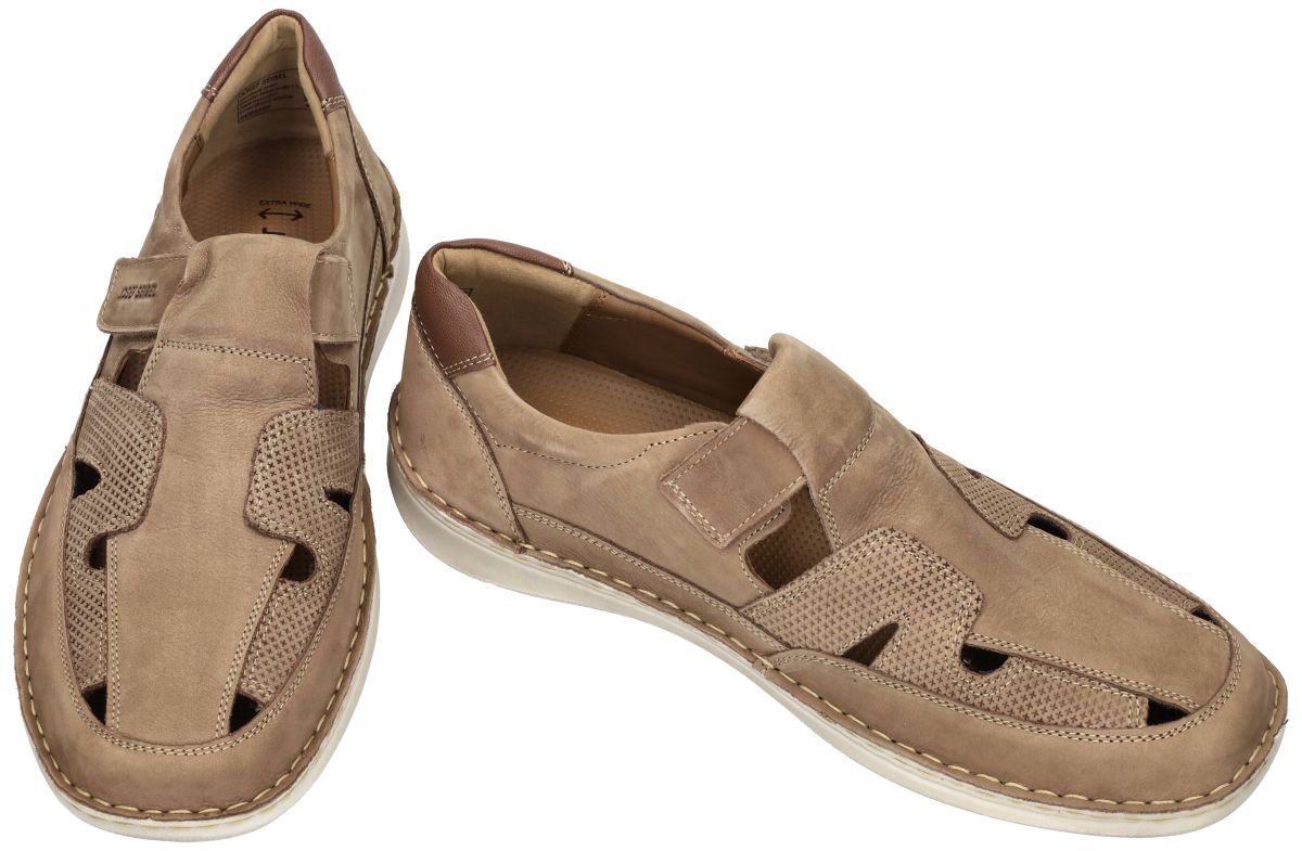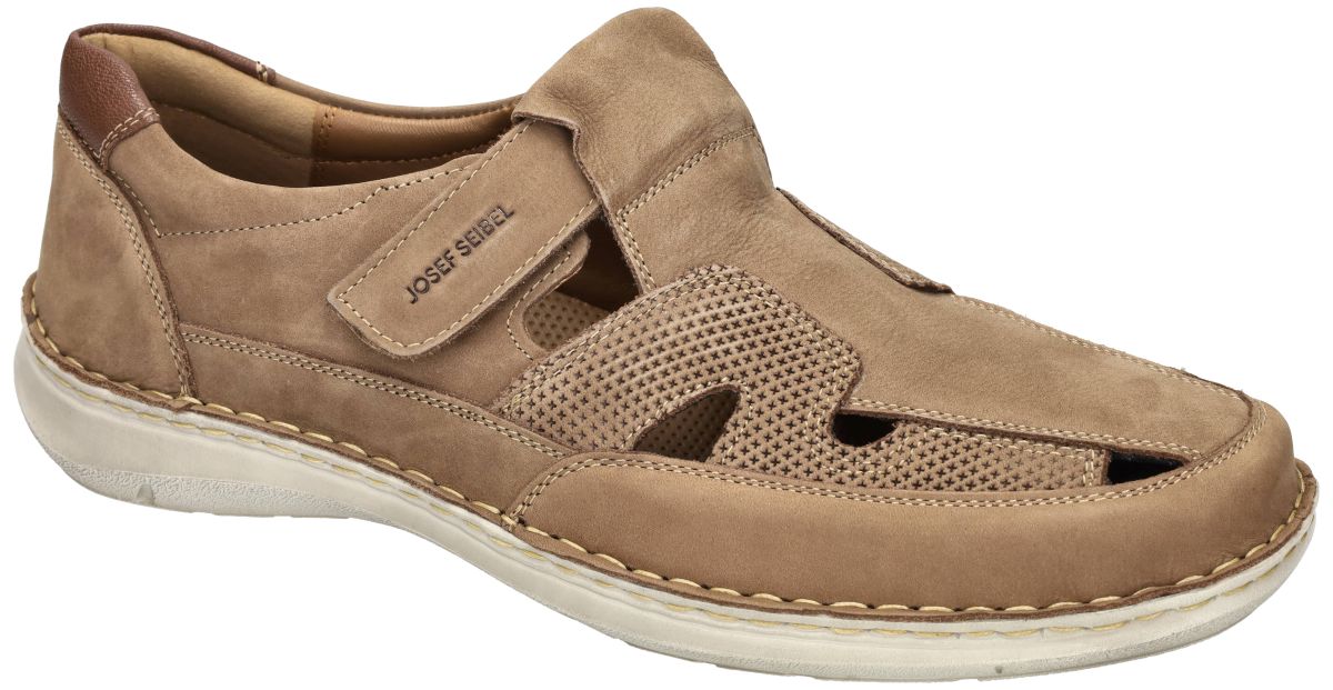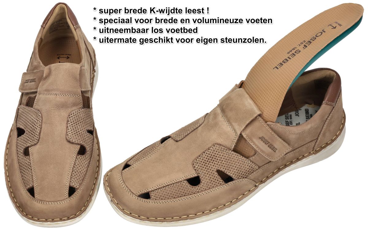 Deze extra brede gesloten herensandalen van Josef Seibel, model New Anvers 81 (artikel 44981) in de uitvoering sand, zijn dé ideale keuze voor wie maximaal comfort en ruimte zoekt. Dankzij de super brede K-wijdte leest zijn ze perfect geschikt voor zeer brede en volumineuze voeten. Het bovenwerk in soepel, licht opgeruwd nubuckleder in warme zandkleur zorgt voor een natuurlijke uitstraling en aangenaam draaggevoel. De strategisch geplaatste uitsparingen en geperforeerde zijpanelen zorgen voor ventilatie op warme dagen, terwijl de gesloten neus extra bescherming biedt. Binnenin bevindt zich een uitneembaar, mals en dik latex voetbed dat uitstekende demping en ondersteuning biedt en eenvoudig vervangen kan worden door eigen steunzolen. De klittenbandsluiting maakt het instappen eenvoudig en zorgt voor een verstelbare pasvorm. De lichtgewicht, flexibel afgewerkte zool met rondom stikrand onderstreept het ambachtelijke karakter en biedt stabiliteit bij elke stap. Perfect voor dagelijks comfortabel wandelen. Josef Seibel herenschoenen vindt men in onze schoenenwinkel regio Aalst, Ninove, Geraardsbergen, Zottegem, Liedekerke of kan men online bestellen op onze webshop.