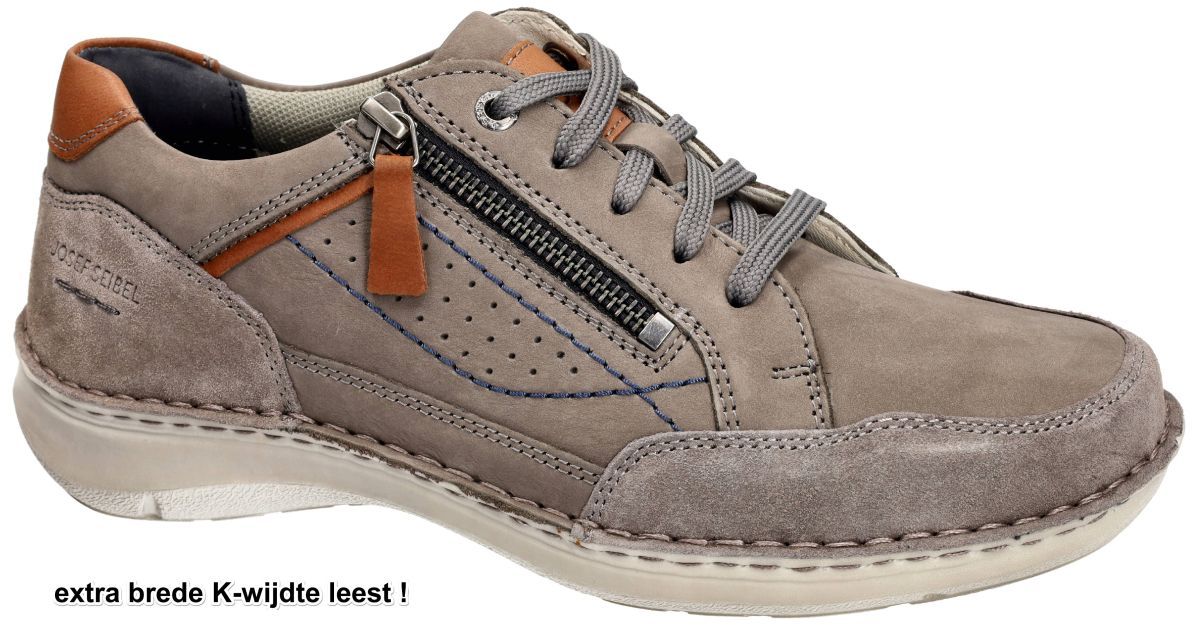 JOSEF SEIBEL artikel/model 44911 New Anvers 11 asphalt-kombi zijn super brede K-wijdte leest in taupe nubuck comfort casual herenschoenen comfort sneakes of veter-rits schoenen met een uitneembaar dik mals latex voetbed. Uitermate geschikt voor mannen met zeer brede of zware voeten en/of hoge wreef. Het los latex voetbed kan indien gewenst ook vervangen worden door eigen steunzolen. Door de combinatie van de super brede K-wijdte leest, de verstelbare vetersluiting en de ritssluiting zijn deze sportieve Josef Seibel casual taupe sneaker-schoenen uitermate geschikt voor mannen met zware, brede voeten en hoge wreef. De ritssluiting zorgt voor een comfortabele instap en zorgt met de lichtgewicht comfortabele buitenzool voor een goede grip. Josef Seibel schoenen vindt men in onze schoenenwinkel regio Aalst, Ninove,Geraardsbergen, Liedekerke of kan men online bestellen op onze webshop.