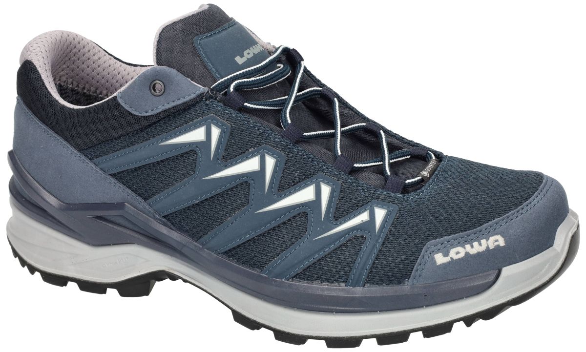 LOWA artikel/model 311709 INNOX PRO GTX LO 7910 stahlblau/offwhite zijn donkerblauw met ecruwitte details herenschoenen lichtgewicht lage professional wandelschoenen/sportschoenen uit de nieuwe All Terrain Sport collectie van het wereldwijde bekende schoenenmerk LOWA. Dit Lowa Innox Pro model voor de nieuwe generatie is licht, snel, multifunctioneel en dus bijzonder geschikt voor sportieve activiteiten in de natuur zoals wandelen, fietsen, mountainbiken. Gegarandeerde bescherming tegen weersinvloeden, zelfs bij hevige regen en sneeuw: de innovatieve GORE-TEX-technologie garandeert optimale waterdichtheid en ademend vermogen. De LOWA RUBBER OUTSOLE is een door LOWA ontworpen rubberen buitenzool met een geoptimaliseerd loopvlakpatroon van een optimale rubbermelange. Het voordeel van een rubberen buitenzool ligt in de goede grip op verschillende oppervlakken. De sportieve genen van de halfhoge modellen INNOX PRO GTX LO vallen meteen op. De flexibele multifunctionele schoenen zijn gemaakt van een robuuste kunststofmelange, die meebeweegt met elke beweging en maximaal draagcomfort biedt. De direct aangegoten tussenzool van LOWA DynaPU® zorgt voor een optimale demping en de innovatieve LOWA MONOWRAP®-zoolopbouw en de soft stabilizer stabiliseren elke stap in het middenvoetgebied. LOWA INNOX wandelschoenen kan men kopen in onze schoenenwinkel regio Aalst, Ninove, Geraardsbergen, Zottegem, Liedekerke of online bestellen op onze webshop. Is uw maat niet voorradig, contacteer ons en we trachten u alsnog te helpen.