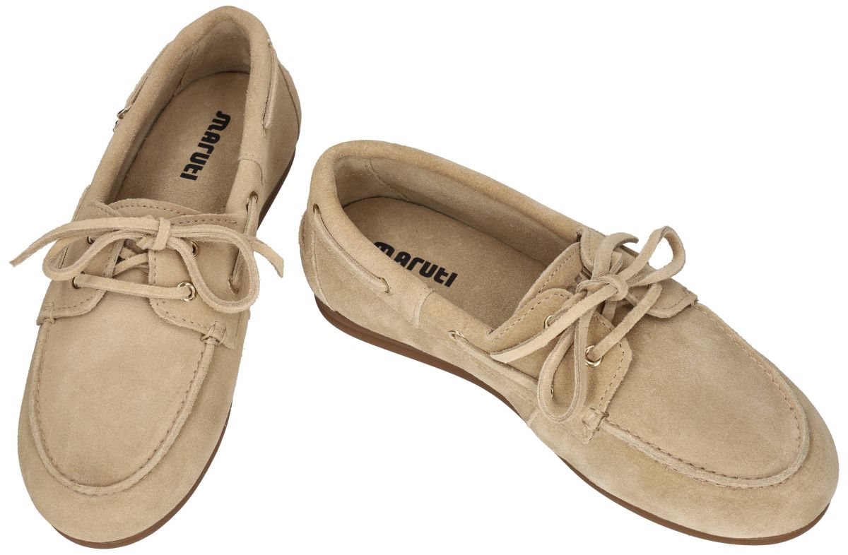 Deze bootschoenen uit de nieuwste lente/zomercollectie van Maruti combineren een tijdloos nautisch design en kust fashion design met modern draagcomfort. Model Eliza met artikelnummer 66.1883.01-S17 is uitgevoerd in Suède sand (beige) en straalt een frisse, zomerse elegantie uit. Het ontwerp van deze loafers is trouw aan het klassieke bootschoenenconcept, met de kenmerkende belijning, de lederen koordjes rond de boord van de schoen en de strik en de fijne stiknaden langs de neus. De uitvoering in zacht beige zandkleur suède geeft deze schoen een lichte, luchtige uitstraling die perfect past bij het lente- en zomerseizoen. Binnenin is de schoen afgewerkt met een kussenzacht, met leder bekleed voetbed, wat zorgt voor aangenaam comfort bij dagelijks gebruik. De soepele rubberen loopzool biedt voldoende grip en flexibiliteit, ideaal voor zowel stadsgebruik als ontspannende wandelmomenten. Deze Maruti Eliza bootschoen is bijzonder veelzijdig te combineren. Draag hem casual met een linnen broek, chino of jeans, of combineer hem stijlvol met een zomerse jurk of rok voor een nonchalante maar verzorgde look. Perfect voor vakanties, citytrips, terrasjes, strandwandelingen of casual werkdagen waarbij comfort en stijl hand in hand gaan. Een frisse, elegante bootschoen die moeiteloos past in een moderne zomergarderobe. De Eliza loafers in blauw geven je schoenencollectie een ultieme casual chique uitstraling. Deze instapschoen is gemaakt van een zachte suède-look stof. De speelse veters en het subtiele Maruti-logo geven de schoen een unieke twist. Dankzij de flexibele zool en het zachte voetbed ziet de Eliza er niet alleen stijlvol uit, maar biedt hij ook comfort de hele dag door. Combineer deze blikvanger met een comfortabele jeans of een zomerjurk voor een moeiteloos modieuze look. De perfecte balans tussen comfort en stijl! Maruti bootschoenen en loafers vindt men in onze schoenenwinkel regio Aalst, Ninove, Geraardsbergen, Zottegem, Liedekerke of kan men online bestellen op onze webshop.