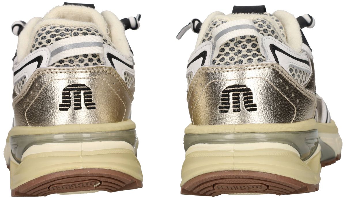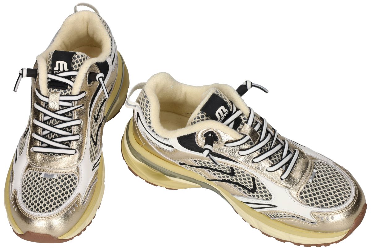 Maruti Riva Leather 66.1893.01-P00 Gold – Chunky dames sneakers. Op zoek naar trendy runners met een luxe uitstraling? Deze Maruti Riva Leather sneakers uit de nieuwste lente/zomer collectie zijn dé eyecatchers van het seizoen. Het Nederlandse merk Maruti staat bekend om originele ontwerpen en hoogwaardige materialen, en dat zie je duidelijk terug in dit model. De upper is een stijlvolle combinatie van beige en zwart mesh, wit gladleder met goud metallic leder, wat de sneakers een dynamische en glamoureuze look geeft. De uitgesproken chunky zool met golvende belijning zorgt niet alleen voor een moderne uitstraling, maar ook voor een uitzonderlijke schokdemping en loopcomfort. Binnenin is gekozen voor een luchtige textielvoering die de voeten fris houdt, ideaal om de hele dag te dragen. Het uitneembaar voetbed is handig voor wie steunzolen wil gebruiken of wat meer ruimte nodig heeft. Aan de achterkant prijkt het herkenbare Maruti-logo op een stevige hielkap met treklus, wat het aan- en uittrekken vergemakkelijkt. De beige veters en opvallende belijning in het design geven deze sneakers bovendien een sportief en speels karakter. Maruti sneakers vindt men in onze schoenenwinkel regio Aalst, Ninove, Geraardsbergen, Zottegem, Liedekerke of kan men online bestellen op onze webshop.