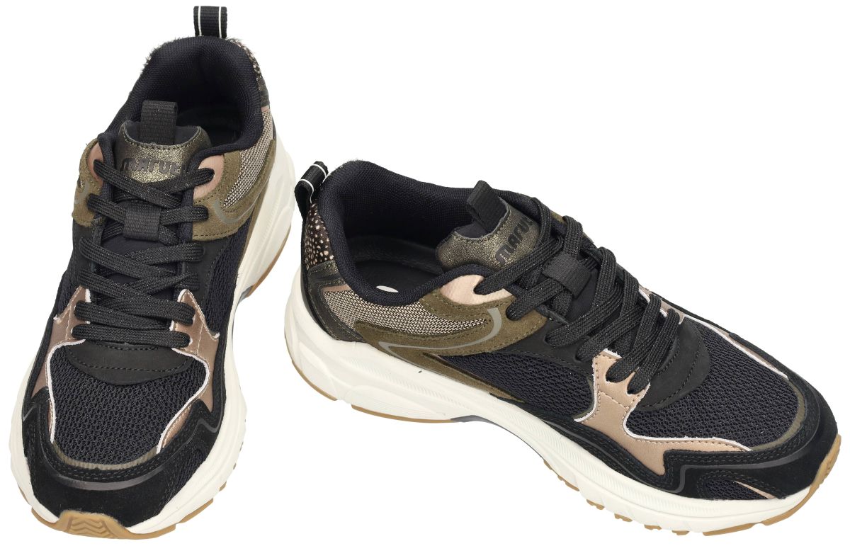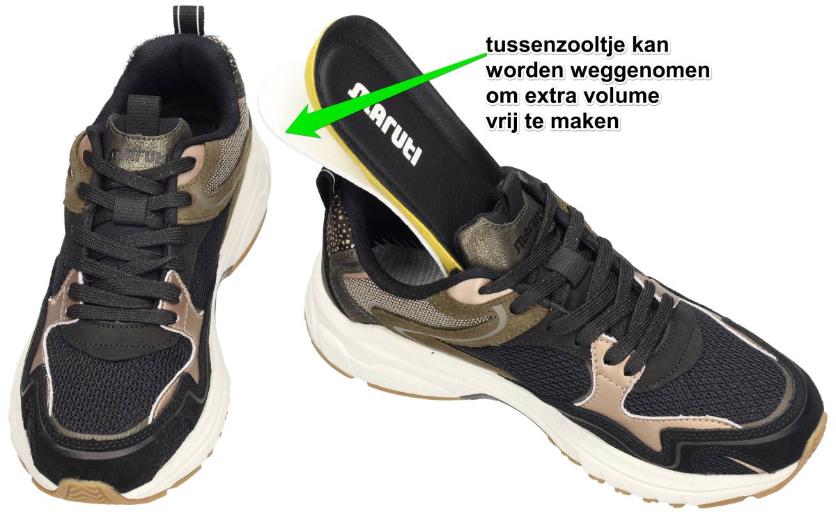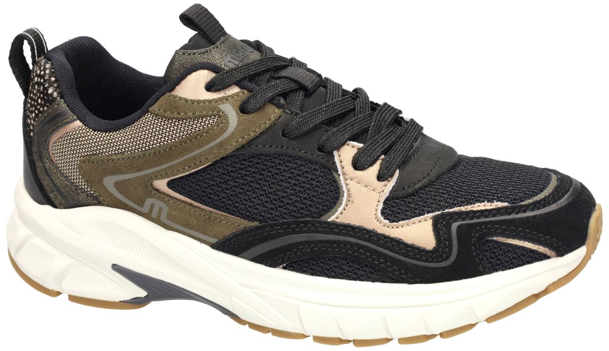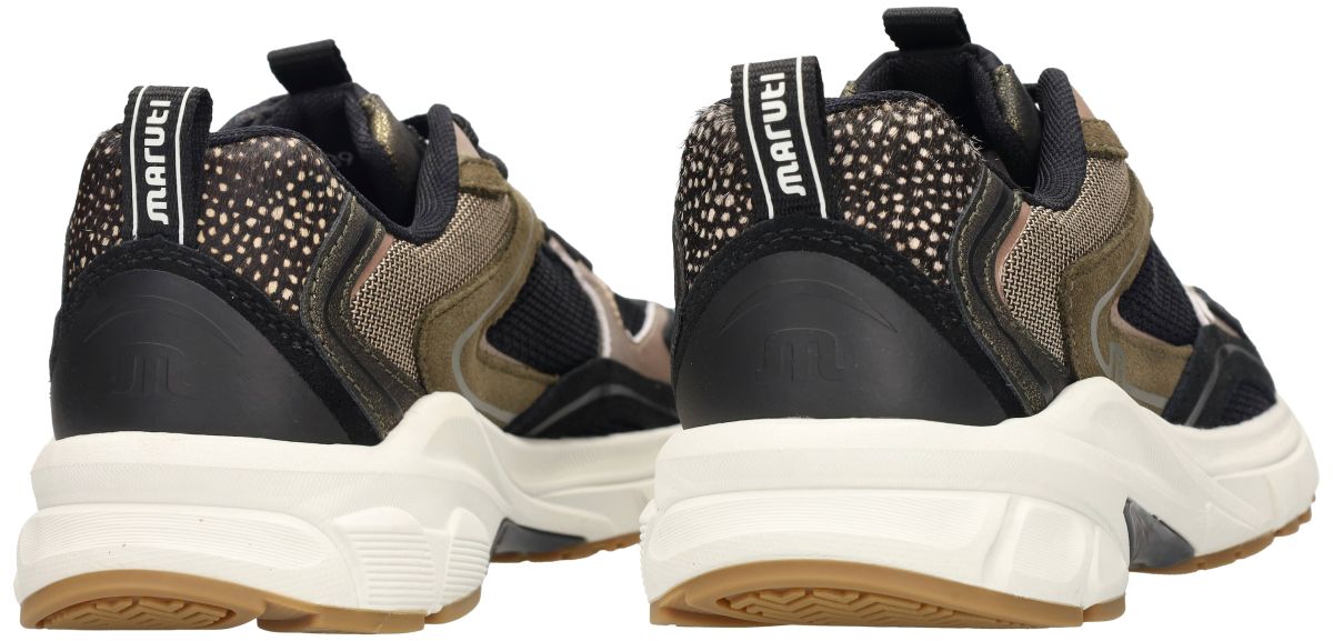 Maruti Novi Leather/Textile 66.1810.01-AHF Black – Bronze – Green – Chunky dames sneakers . Met deze Maruti Novi Leather/Textile Black – Bronze – Green zet je dit seizoen een krachtig mode-statement. Deze hippe runner sneakers uit de nieuwste herfst/winter collectie combineren stoere kleuren en een sportief design met het vertrouwde comfort van Maruti. De upper bestaat uit een dynamische mix van zwart mesh, groentinten in suède en metallic bronze details. De rijke materialen en uitgesproken belijning zorgen voor een eigentijdse urban look. De stevige chunky zool in wit met een caramelkleurig loopvlak biedt niet alleen uitstekende grip, maar ook uitzonderlijke schokabsorptie voor langdurig comfort. Binnenin geniet je van een luchtige textielvoering en een uitneembaar voetbed met extra tussenzool. Dit tussenzooltje kan eenvoudig worden verwijderd om extra volume te creëren, waardoor deze sneakers ook ideaal zijn voor bredere voeten of het gebruik van eigen steunzolen. Aan de achterzijde springt de hielkap in het oog, afgewerkt met een opvallende animalprint accent en het iconische Maruti-logo. De praktische treklus maakt instappen extra gemakkelijk. Het kleurenpalet van zwart, brons en groen geeft de sneaker een veelzijdige en stoere uitstraling, perfect te combineren met jeans, cargobroeken of casual jurken. Met deze Maruti Novi Black – Bronze – Green sneakers kies je voor een trendy, sportieve en comfortabele schoen die jouw dagelijkse outfit een krachtige boost geeft. Maruti sneakers vindt men in onze schoenenwinkel regio Aalst, Ninove, Geraardsbergen, Zottegem, Liedekerke of kan men online bestellen op onze webshop.