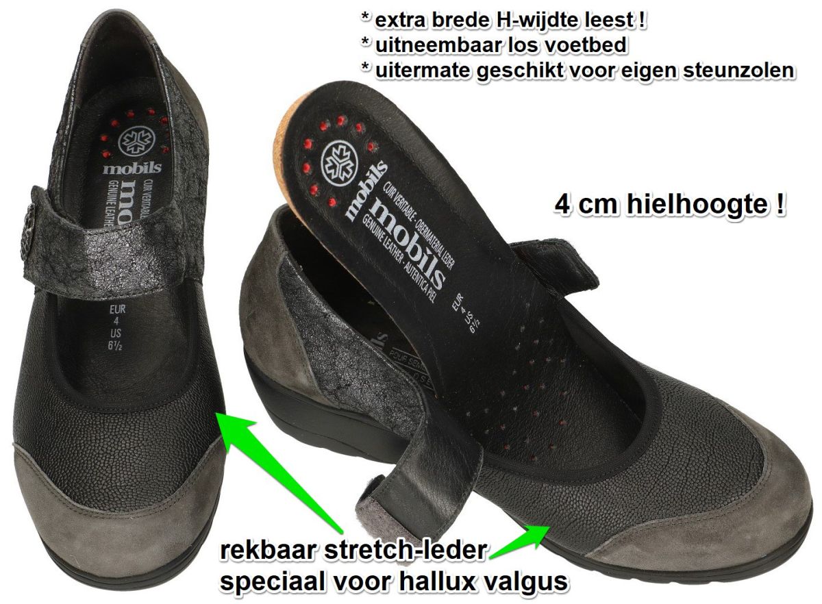 MOBILS ergonomic artikel/model BATHILDA carbon zijn zwart met donkergrijs damesschoenen hoogcomfort orthopedische ergonomische sleehak bandschoenen of ballerina's met klittenband uit de nieuwe herfst/winter 2023 collectie van het het schoenenmerk Mobils ergonomic van de Franse schoenenfabrikant MEPHISTO. Deze super comfortabele wedge comfort bandschoenen zijn voorzien van een gemakkelijke klittenbandsluiting (velcro) en staan op een veerkrachtige en schokabsorberende 4 cm hoge sleehak en hebben een anatomisch voorgevormd uitneembaar los kurk voetbed met leder bekleed dat kan vervangen worden door uw eigen steunzolen. Het bovenwerk boven de wreef en zijkant van de voeten is vervaardigd in zwart generfd stetch leder gecombineerd met donkergrijs nubuck en glanzend antraciet glinsternubuck. De binnenvoering uit rekbaar lycra stof speciaal voor hallux valgus en andere knobbels. Hoogcomfortabele modieuze schoenen met ruime H-wijdte leest, draagbaar ook voor vrouwen met wat moeilijke voeten. Aangeraden door orthopedisten, podologen. Mobils en Mephisto schoenen en sandalen kan men kopen in onze schoenenwinkel regio Aalst, Ninove, Liedekerke, Geraardsbergen, Zottegem of online bestellen op onze webshop.