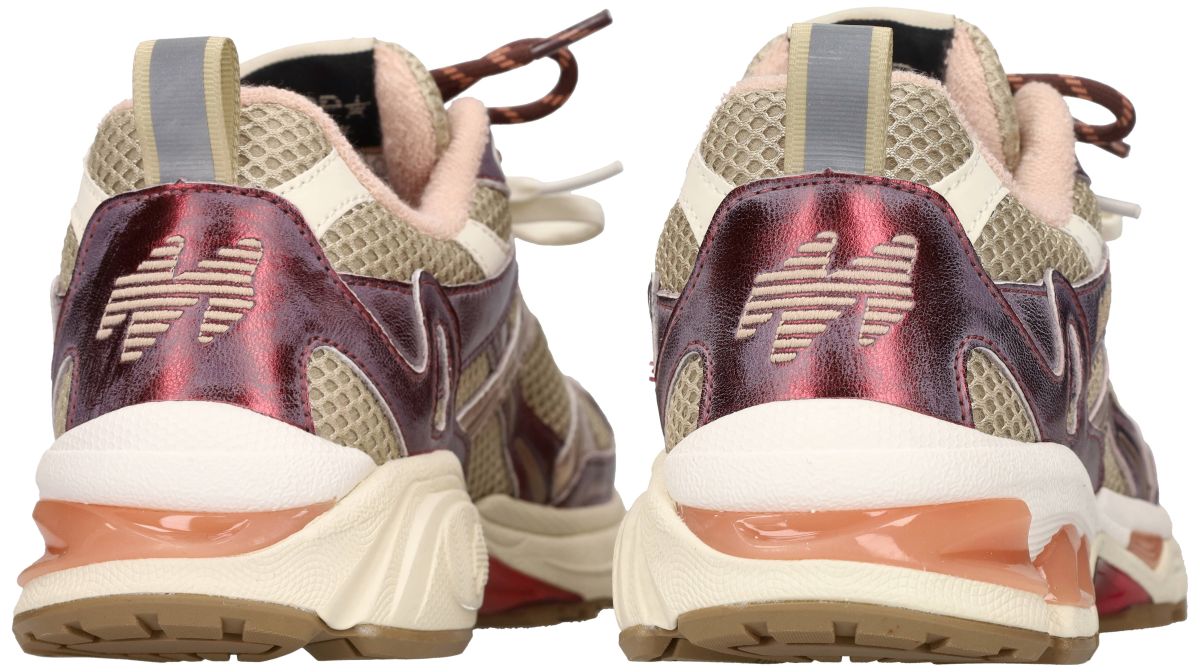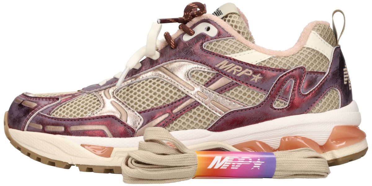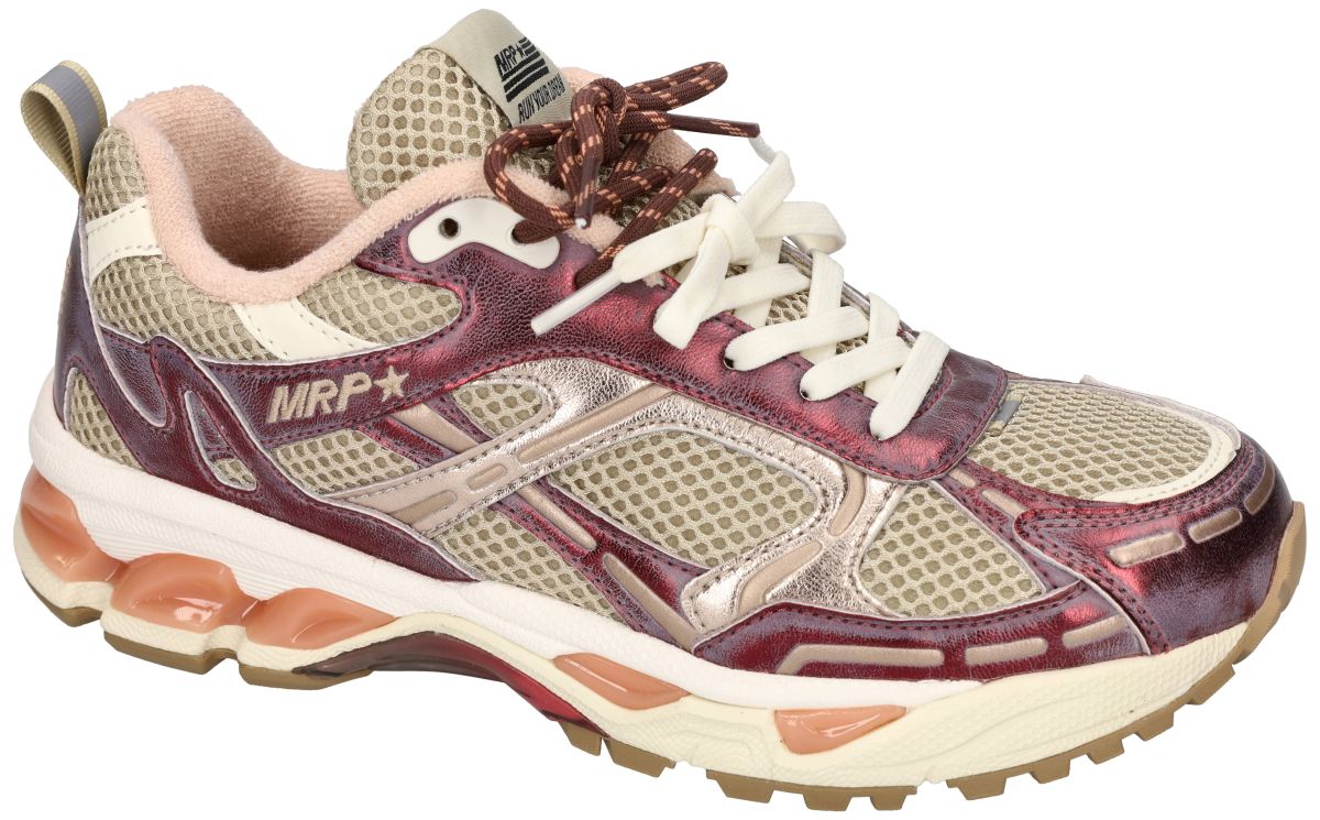 De MRP (Maripé) Melrose V.5 damessneakers in de uitvoering Marsala / Ivory zijn een uitgesproken fashion runner waarin sportieve dynamiek en Italiaanse designinvloeden samenkomen. Dit model uit de Melrose-lijn combineert een technische sneakerlook met verfijnde materialen en warme, modieuze kleuren. De basis van de upper bestaat uit ademend ivoor-kleurig mesh, wat zorgt voor ventilatie en een licht draagcomfort. Over dit luchtige materiaal lopen vloeiende panelen die het karakter van deze sneaker bepalen. De opvallende overlays zijn uitgevoerd in marsala metallic, een diepe wijnrode tint met een subtiel glanzende en licht verweerde uitstraling. Deze warme kleur geeft de sneaker een modieuze en luxueuze toets. Tussen deze marsala accenten bevinden zich panelen in champagnekleurig of lichtgoud metallic leder, die het design extra diepte geven. Samen met het ivoor mesh ontstaat een harmonieus kleurenpalet van zachte naturals en warme metallics. De Melrose V.5 beschikt over een origineel vetersysteem met klassieke elastische platte off-white veters. Daarboven ligt een tweede ronde sportveter in bruin met lichte accenten, die het technische runner-karakter extra benadrukt. De zachte voering rond de enkel in licht rosé-beige textiel verhoogt het comfort en geeft de sneaker bovendien een subtiele vrouwelijke uitstraling. De dynamische zoolconstructie maakt deze sneaker bijzonder comfortabel. De lichtgewicht tussenzool bevat transparante schokabsorberende dempingselementen in een warme perzik- of zalmtint, die elke stap extra soepel laten aanvoelen. Het profielrijke rubberen loopvlak onderaan zorgt voor stabiliteit en grip, zowel in de stad als tijdens langere wandelmomenten. Voor de modebewuste sneakerliefhebber De MRP Melrose V.5 Marsala / Ivory is een perfecte sneaker voor de vrouw die houdt van een sportieve maar stijlvolle look. Dankzij de warme marsala tint laat dit model zich prachtig combineren met: beige, crème en zandkleurige outfits , denim of casual citylooks, zachte aardetinten zoals taupe en camel herfstige kleuren zoals bordeaux en roest. Deze Melrose V.5 brengt comfort, karakter en een uitgesproken fashionuitstraling samen — een modieuze runner die moeiteloos sportiviteit en elegantie combineert. MRP sneakers vindt men in onze schoenenwinkel regio Aalst, Ninove, Geraardsbergen, Zottegem, Liedekerke of kan men online shoppen op onze webshop.