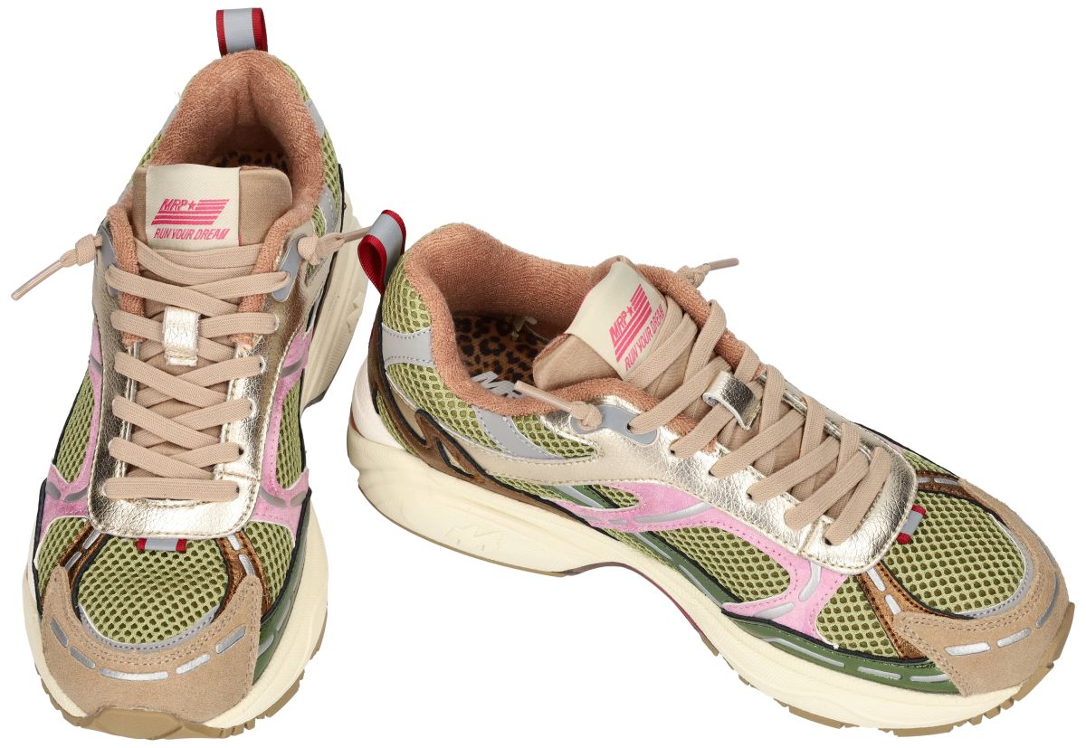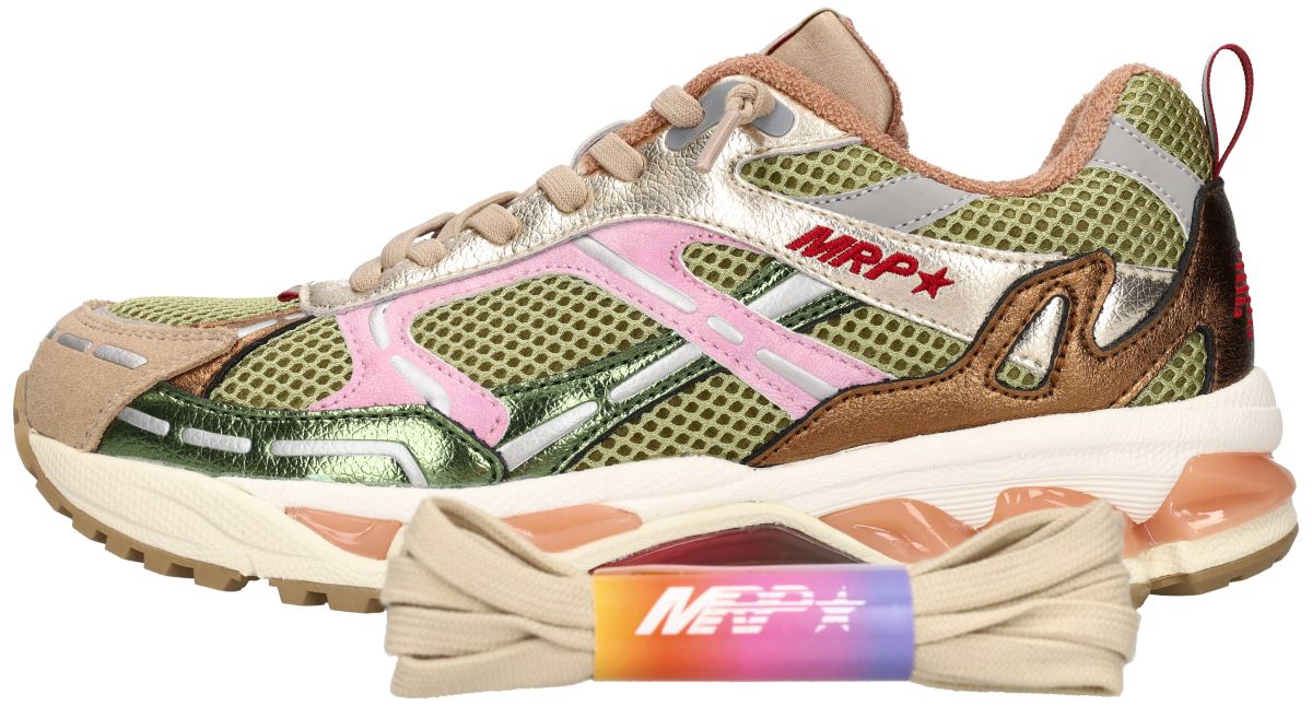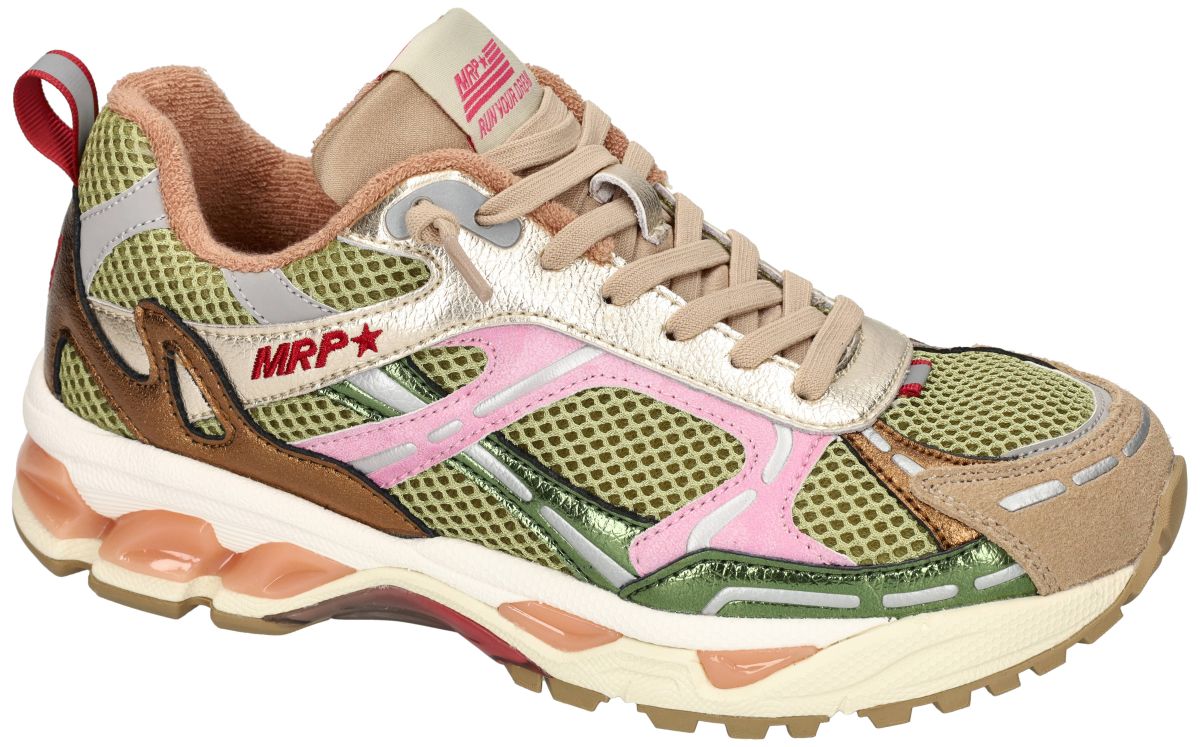 Maak een statement met deze opvallende damesrunner van MRP (Maripé), model MELROSE V.17 in de uitvoering Flower Bouquet. Deze sneaker combineert high-end fashion met een sportieve streetwear uitstraling, geïnspireerd op de levendige sfeer van Melrose Place in Los Angeles. De upper bestaat uit een dynamische mix van ademend mesh, suède en metallic accenten, afgewerkt in een speels kleurenpalet van groen, roze, goud en beige. Dit zorgt niet alleen voor een unieke look, maar ook voor een licht en comfortabel draaggevoel. De chunky zool met transparante dempingsdelen biedt uitstekende schokabsorptie en geeft de sneaker een moderne, trendy uitstraling. Dankzij de combinatie van veters en extra set lintveters personaliseert u eenvoudig uw stijl. De zachte binnenvoering en stevige hielstructuur zorgen voor ondersteuning bij elke stap. Een echte eyecatcher voor wie durft te kiezen voor kleur, comfort en een uitgesproken fashion look. MRP sneakers vindt men in onze schoenenwinkel regio Aalst, Ninove, Geraardsbergen, Zottegem, Liedekerke of kan men online shoppen op onze webshop.