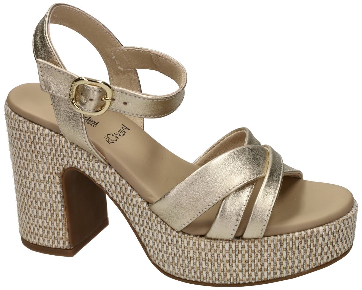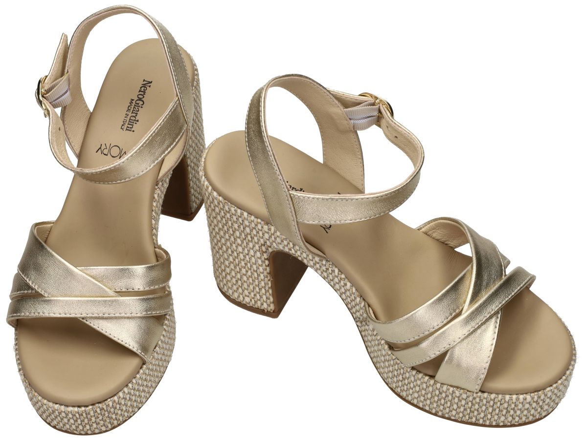 Deze elegante high heel plateau sandalen van het Italiaanse merk NeroGiardini (artikel E616071D) in de uitvoering Etoile Sand Col. Miel stralen pure zomerse luxe uit. De gekruiste bandjes in zacht goud metallic leder geven een verfijnde, vrouwelijke look en zorgen tegelijk voor een mooie omsluiting van de voorvoet. De plateauzool van 3 cm in gevlochten raffia-look creëert een modieuze, natuurlijke uitstraling en biedt extra comfort. In combinatie met de hak van 10 cm wordt de effectieve hielhoogte herleid tot ca. 7 cm, wat zorgt voor een stabiel en aangenaam draaggevoel. De enkelband met verstelbare gesp garandeert een perfecte pasvorm. Het lederen voetbed en de hoogwaardige afwerking maken deze sandaal ideaal voor zowel feestelijke gelegenheden als stijlvolle zomeroutfits, met de typische finesse van NeroGiardini. Nero Giardini sandalen vindt men in onze schoenenwinkel regio Aalst, Ninove, Geraardsbergen, Liedekerke, Zottegem of kan men online bestellen op onze webshop.