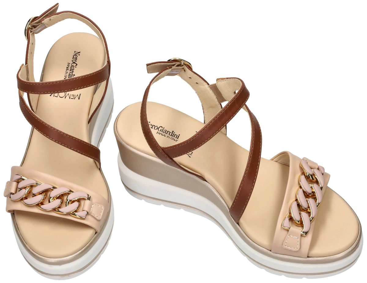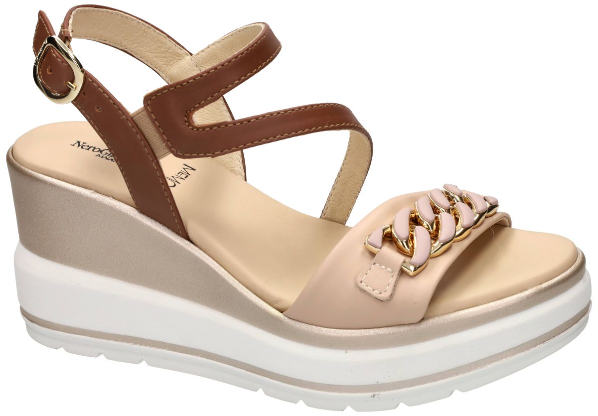 Schitter deze zomer met deze unieke, stijlvolle wedge sandalen van het Italiaanse topmerk NeroGiardini, model E615962D in een combinatie van bruin en oudroze leder. Deze eyecatchers combineren comfort, hoogte en elegantie in een modern design met natuurlijke accenten. De sandalen hebben een opvallende plateau wedge zool, die 3 cm dik is aan de tenen en oploopt tot 8 cm aan de hiel. Dit betekent dat je wel de hoogte van een hak krijgt, maar met een reëel hiel hoogtegevoel van slechts 5 cm – perfect voor wie houdt van elegantie zonder in te boeten op comfort. De upper is uitgevoerd in een combinatie van beige en cognac leder, met op de wreef een schitterende goud/roze ketting . Binnenin geniet je van het ultieme draagcomfort dankzij de leren voering en het lederen voetbed. De gespsluiting aan de enkel zorgt voor een perfecte, verstelbare pasvorm én extra steun. Met deze NeroGiardini wedgesandalen voeg je gegarandeerd flair toe aan elke outfit – of je nu kiest voor een zomerse jurk, een luchtige broek of een casual short. Schitter dit seizoen met Italiaanse klasse! Nero Giardini sandalen vindt men in onze schoenenwinkel regio Aalst, Ninove, Geraardsbergen, Liedekerke, Zottegem of kan men online bestellen op onze webshop.