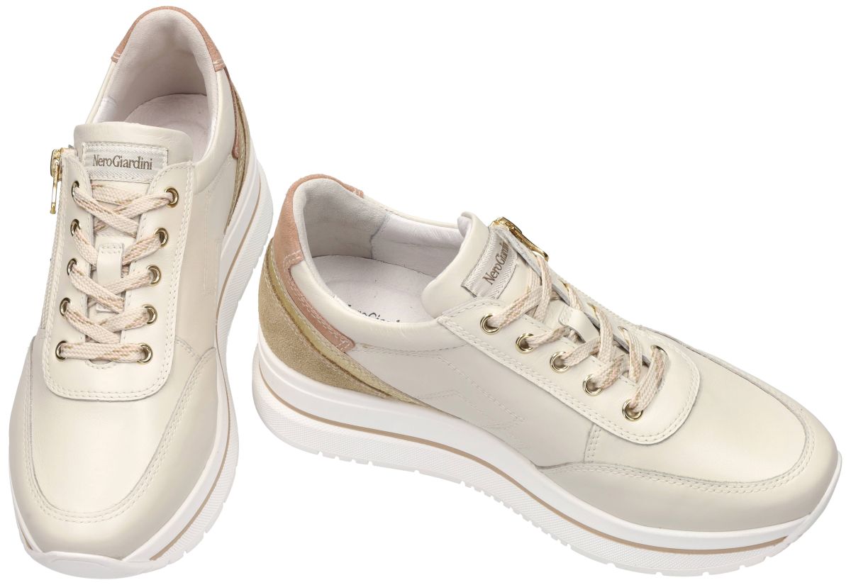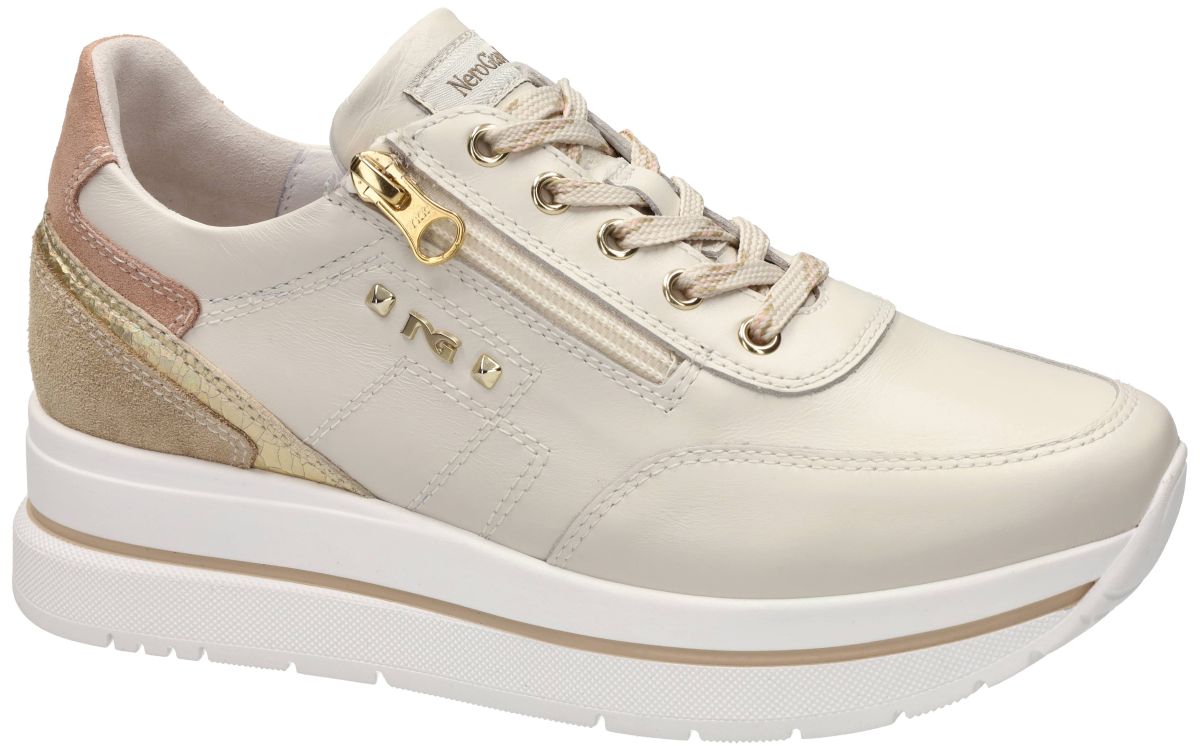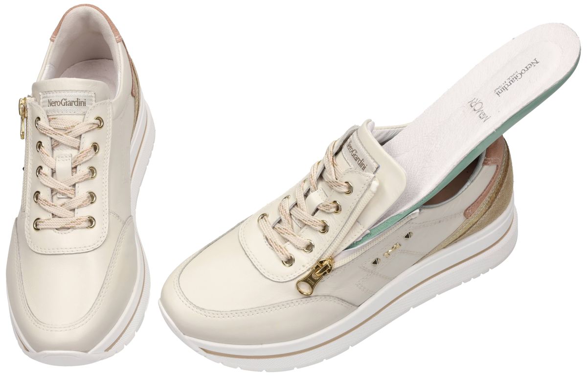 Deze luxury plateauzool sneakers uit de nieuwe lente/zomercollectie van het Italiaanse schoenenmerk NeroGiardini combineren sportieve invloeden met verfijnde high-fashion details. Dit elegante model met artikelnummer E615203D, uitgevoerd in velvet OSSO / zouk IVORY, is geïnspireerd op het silhouet van een runner, maar vertaald naar een uitgesproken modieuze en luxueuze uitvoering. Het bovenwerk bestaat uit ivoorkleurig gladleder, harmonieus gecombineerd met camel- en oudroze suède accenten aan de contrefort, afgewerkt met een subtiel craquelé goud metallic detail dat zorgt voor een verfijnde glans. Deze gelaagde materiaalkeuze geeft de sneaker diepte en karakter, terwijl het zachte kleurpalet moeiteloos aansluit bij de lente- en zomergarderobe. De plateauzool is 3 cm dik aan de voorvoet en loopt op tot 5 cm aan de hiel, waardoor de hiel subtiel 2 cm wordt opgelift. Dit zorgt voor een elegante houding en extra comfort zonder in te boeten aan stabiliteit. De zool is licht van gewicht en afgewerkt met een fijne rand in natuurtint, wat het geheel visueel verfijnt. Aan de binnenzijde biedt deze NeroGiardini sneaker een volledig lederen binnenvoering en een uitneembaar memory voetbed, dat zich naar de voet vormt en indien gewenst kan worden vervangen door eigen steunzolen. De combinatie van vetersluiting met een praktische goudkleurige ritssluiting aan de zijkant zorgt voor een perfecte pasvorm én een vlotte instap. Opvallende details zoals de zachte polstering rond de enkel, de elegante metalen oogjes en het discrete NeroGiardini-logo onderstrepen het Italiaanse vakmanschap en de luxueuze uitstraling. Deze highfashion runner-sneakers met plateauzool zijn de ideale keuze voor wie comfort, elegantie en een modieuze uitstraling wil verenigen in één stijlvol paar. Nero Giardini schoenen vindt men in onze schoenenwinkel regio Aalst, Ninove, Geraardsbergen, Liedekerke, Zottegem of kan men online bestellen op onze webshop.
