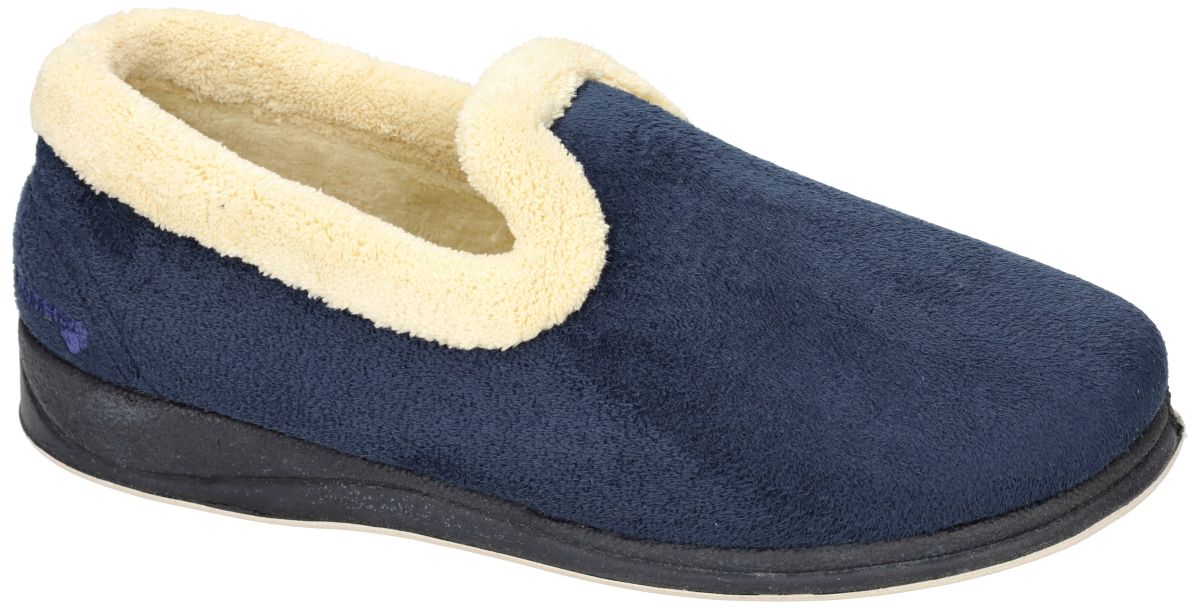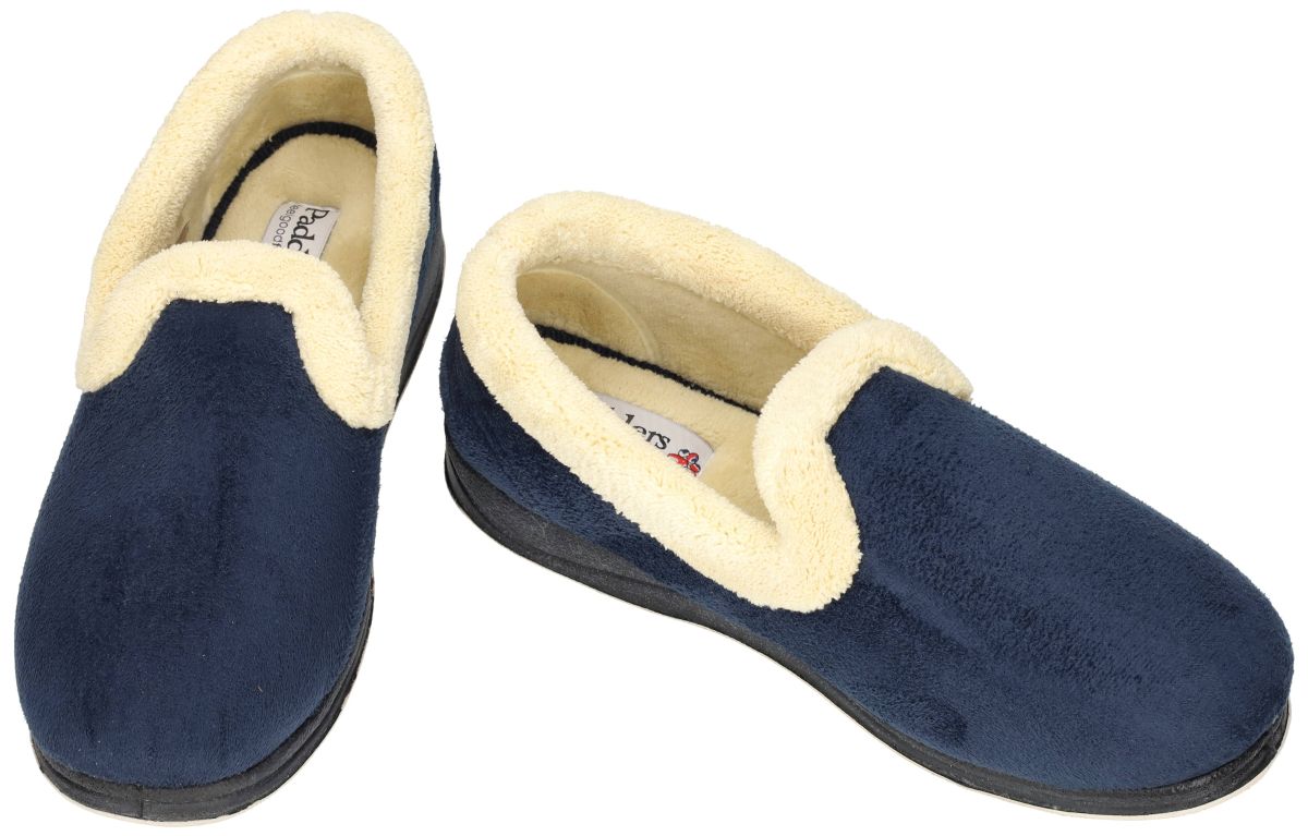 Het model REPOSE navy is een marine blauwe super comfort warme damesschoenen gesloten pantoffel van Padders feelgoodfeed. Deze Padders Repose damespantoffel is extra breed met zijn EE wijdte leest en heeft binnenin een memory foam zoolen gevoerd met katoen. De rubber antislip loopzool is met vanile extract geparfumeerd. Padders pantoffels zijn wasbaar op 30° en uitermate geschiktvoor revaliderende patienten, bejaarden met gezwollen voeten. U kan Padders pantoffels kopen in onze schoenenwinkel te Denderhoutem of online bestellen op onze webshop.