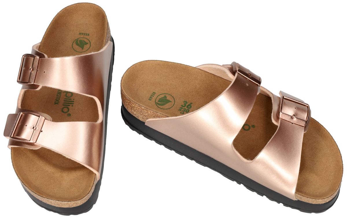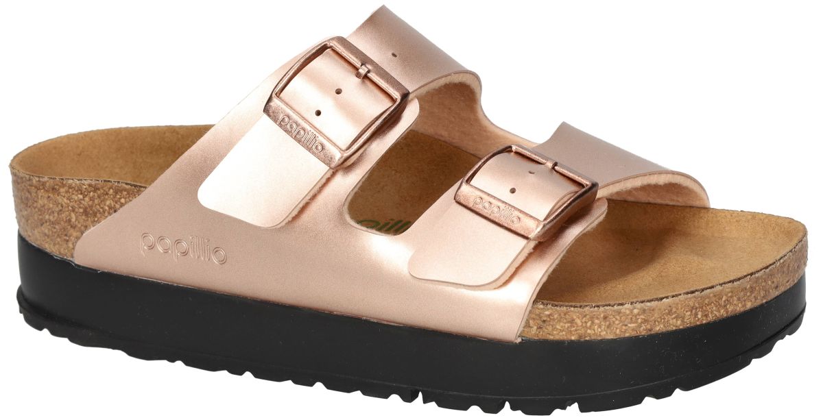 Deze Papillio Arizona Flex Platform slide slippers met artikelnummer 1031270 combineren het iconische comfort van Birkenstock met een eigentijdse, modieuze uitstraling. Dit Arizona model uit de Papillio-lijn (by Birkenstock) is uitgevoerd in schmale Weite, ideaal voor de slankere voet, en rust op een trendy plateauzool van 3 cm die subtiel hoogte toevoegt zonder in te boeten aan stabiliteit. De slippers zijn volledig vegan vervaardigd en sluiten perfect aan bij een bewuste, duurzame levensstijl. Het befaamde Birkenstock-voetbed vormt zich naar de natuurlijke anatomie van de voet en staat bekend om zijn diepe hielkuip, uitgesproken lengte- en dwarsgewelfondersteuning en actieve teenbar. Deze eigenschappen zorgen voor een gezonde houding, optimale drukverdeling en langdurig loopcomfort, zelfs bij intensief dagelijks gebruik. Wat opvalt is de luxueuze metallic roségouden of koperkleurige afwerking, die deze Arizona een verfijnde en vrouwelijke uitstraling geeft. Zoals bij elke Arizona zijn de twee brede banden zijn voorzien van toon-op-toon metalen gespen, individueel verstelbaar voor een perfecte pasvorm. Het zachte, suède-achtige voetbed in natuurlijke tint contrasteert mooi met de zwarte platformzool, wat het geheel een moderne en stijlvolle look geeft. De licht verhoogde zool oogt sportief, maar blijft elegant en uiterst draagbaar. Een ideale keuze voor wie comfort, mode en duurzaamheid wil combineren in een zomerse slipper met statement-allure. Papillio by Birkenstock vindt men in onze schoenenwinkel regio Aalst, Ninove, Geraardsbergen, Zottegem, Liedekerke of kan men online bestellen op onze webshop.