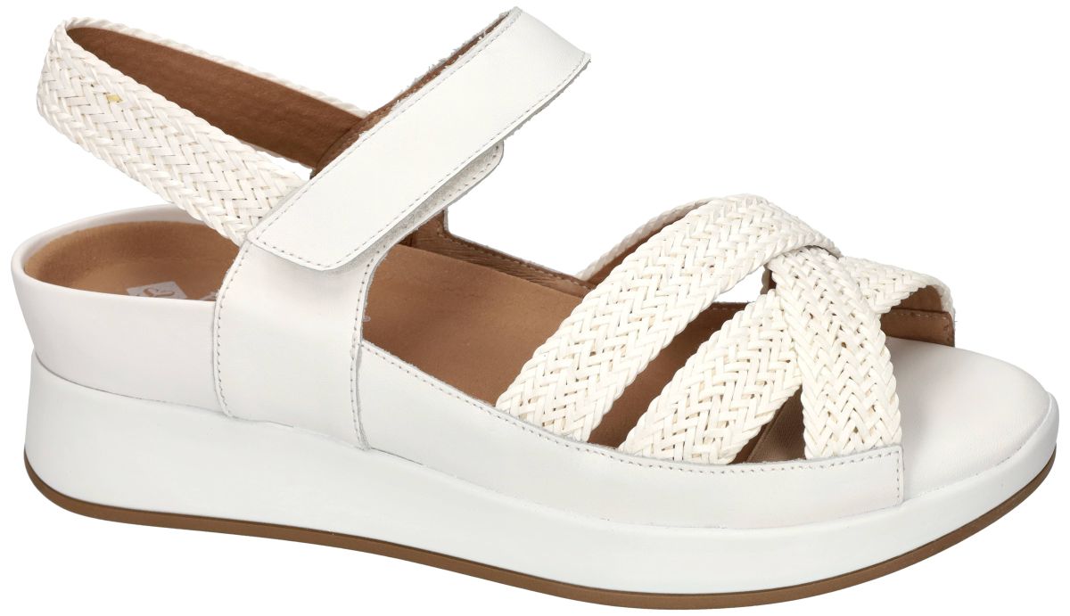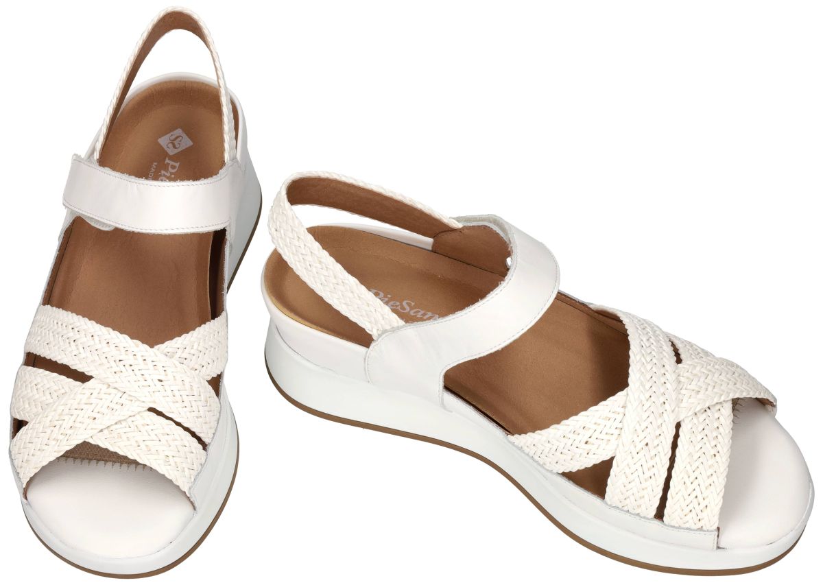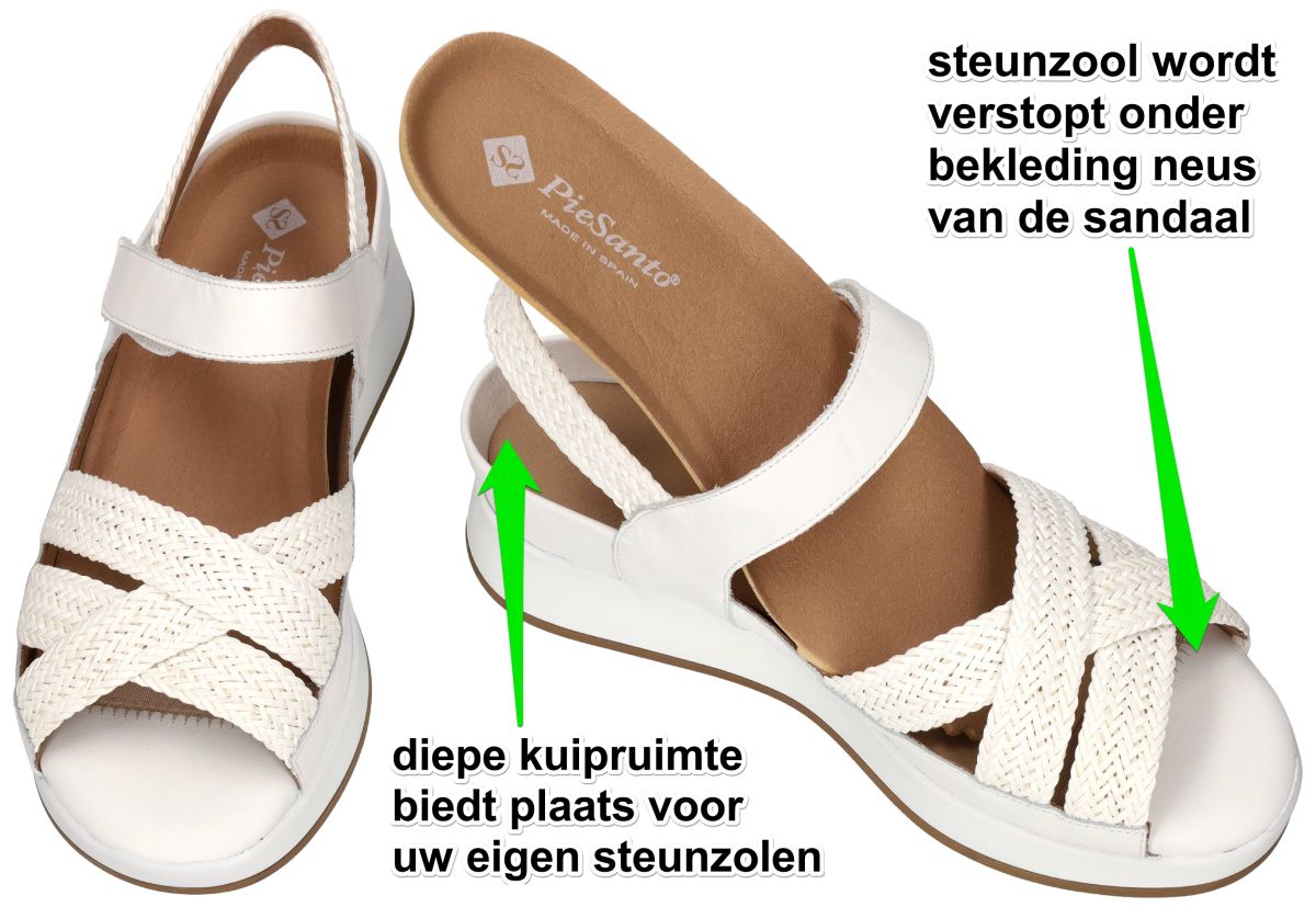 PieSanto 260425 – Trenza bianco/Natur bianco/Raval bianco . Orthopedische comfort damessandaal speciaal ontworpen voor dikke steunzolen. Deze orthopedische damessandalen van het Spaanse comfortschoenenmerk PieSanto zijn ontwikkeld met één duidelijke missie: een elegante, zomerse sandaal aanbieden voor vrouwen die genoodzaakt zijn dikke orthopedische steunzolen te dragen. Het model 260425 onderscheidt zich door een ingenieus geïntegreerd steunzoolsysteem. De sandaal beschikt over een zeer diepe, omlijnde kuipruimte waarin uw eigen steunzolen volledig verzonken kunnen worden. Hierdoor blijven ze minimaal zichtbaar, zelfs in een open sandaal. Bovendien is de voorzijde zo geconstrueerd dat de teenpartij van uw steunzool discreet onder de bovenconstructie wordt verborgen. Dankzij deze slimme overtrekconstructie oogt de sandaal verfijnd en vrouwelijk, zonder dat de orthopedische functionaliteit zichtbaar is. De kuipvorm en zijwanden zorgen ervoor dat de steunzool stabiel gefixeerd blijft en niet kan schuiven tijdens het stappen – een cruciaal detail voor comfort en correcte ondersteuning. Het model 260425 Trenza-Natur-Raval bianco zijn witte sandalen uitgevoerd in wit gladleder en mooie witte vlechtwerk banden. Deze combinatie van wit gladleder en ecru wit tressé geeft de sandaal een moderne, zomerse uitstraling. De over elkaar gekruiste bandjes in wit raffia vlechtwerk zorgt voor extra karakter, terwijl de wit leder enkelband met klittenbandsluiting een perfecte individuele pasvorm mogelijk maakt. De upper is geplaatst op een stugge witte plateauzool die niet plooibaar of torsbaar is – precies zoals geadviseerd door podologen en orthopedisten. Deze vaste zoolconstructie biedt: Maximale stabiliteit. Correcte drukverdeling . Ontlasting van voorvoet en gewrichten. Een veilige, gecontroleerde afwikkeling . De lichte plateauhoogte zorgt bovendien voor extra comfort zonder instabiliteit. PieSanto 260425 is de ideale sandaal voor dames die geen compromis willen sluiten tussen orthopedische noodzaak en esthetiek. Een verfijnde, modieuze oplossing waarbij dikke steunzolen discreet geïntegreerd worden in een stabiele en elegante zomersandaal. PieSanto damessandalen vindt men in onze schoenenwinkel regio Aalst, Ninove, Geraardsbergen, Zottegem, Liedekerke of kan men online bestellen op onze webshop.