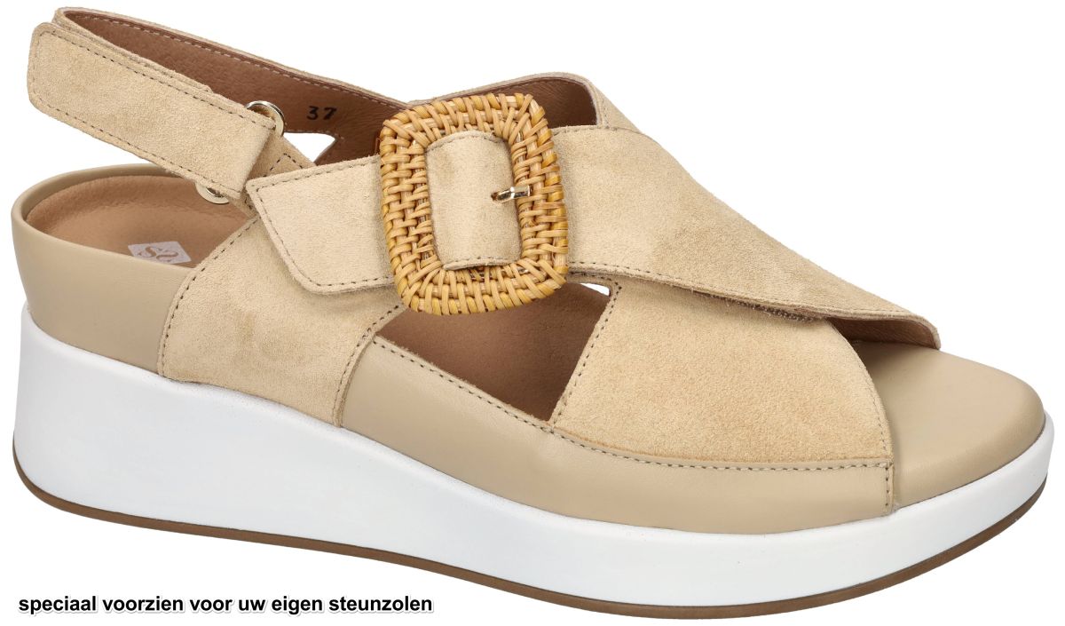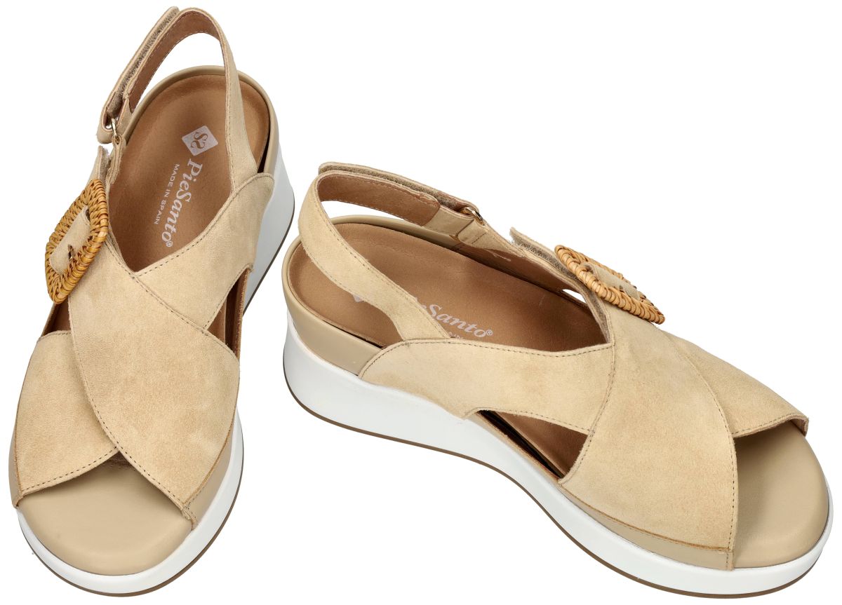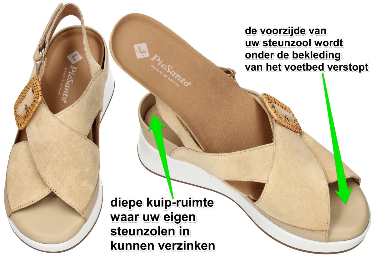 Deze orthopedische maar tegelijk bijzonder elegante damessandalen van het Spaanse comfortmerk PieSanto (Dual Comfort) combineren een verfijnde zomerse uitstraling met een technisch doordachte pasvorm. Dit model 260383 in de uitvoering suede sand / raval sand is uitgevoerd in een warme beige zandkleurige combinatie van soepel leder en zacht suède, waardoor de sandaal een natuurlijke en stijlvolle uitstraling krijgt die perfect past bij zomerse outfits. De upper bestaat uit elegant over elkaar gekruiste brede banden in zacht suède, die de voet mooi omsluiten en tegelijk een luchtige open structuur behouden. Op de wreef is een decoratieve gesp met raffia-omwikkeling aangebracht die de sandaal een verfijnd zomers accent geeft. Deze gesp is echter enkel decoratief, want de overlappende kruisband kan volledig worden losgemaakt dankzij een praktische klittenbandsluiting. Hierdoor kan de sandaal niet alleen volledig worden opengemaakt wat instappen makkelijker maakt maar ook zeer nauwkeurig worden aangepast aan elk type wreef, wat deze schoen bijzonder geschikt maakt voor zowel lage als hogere wreven. Zoals kenmerkend voor de PieSanto Dual Comfort collectie beschikt ook dit model over een uitneembaar voetbed. Wanneer dit losse voetbed wordt verwijderd ontstaat er een diepe kuipruimte waarin eigen steunzolen comfortabel kunnen verzinken, zelfs wanneer deze wat dikker zijn. Onder dit uitneembare voetbed bevindt zich bovendien nog een mals vast voetbed, waardoor de extra ruimte ook een uitstekende oplossing biedt voor meer volumineuze of licht gezwollen voeten. Aan de voorzijde van het voetbed is een slimme overtrek voorzien waarin de voorkant van uw steunzolen discreet onder de bekleding kan worden geschoven. Hierdoor worden de steunzolen netjes onzichtbaar weggewerkt, stevig gefixeerd en kunnen ze niet verschuiven tijdens het lopen. De sandaal staat op een stabiele, stugge en niet-torsbare zool, precies zoals orthopedisten en podologen aanbevelen voor een correcte ondersteuning van de voet. De zool heeft bovendien een lichte wedge-vorm die de hiel ongeveer 2 cm optilt, wat zorgt voor een comfortabele en natuurlijke stand van de voet tijdens het stappen. Binnenin is de sandaal afgewerkt met een aangename binnenvoering in echt leder, wat bijdraagt aan een ademend en zacht draagcomfort op warme zomerdagen. Met hun zachte zandkleurige leder- en suèdecombinatie, verstelbare pasvorm en doordachte orthopedische constructie zijn deze PieSanto sandalen een uitstekende keuze voor dames die op zoek zijn naar een modieuze zomersandaal die perfect combineert met steunzolen of gevoelige voeten. Een stijlvolle Spaanse kwaliteitsschoen waarin comfort, ondersteuning en elegantie naadloos samenkomen. PieSanto damessandalen vindt men in onze schoenenwinkel regio Aalst, Ninove, Geraardsbergen, Zottegem, Liedekerke of kan men online bestellen op onze webshop.