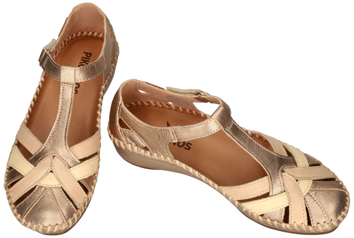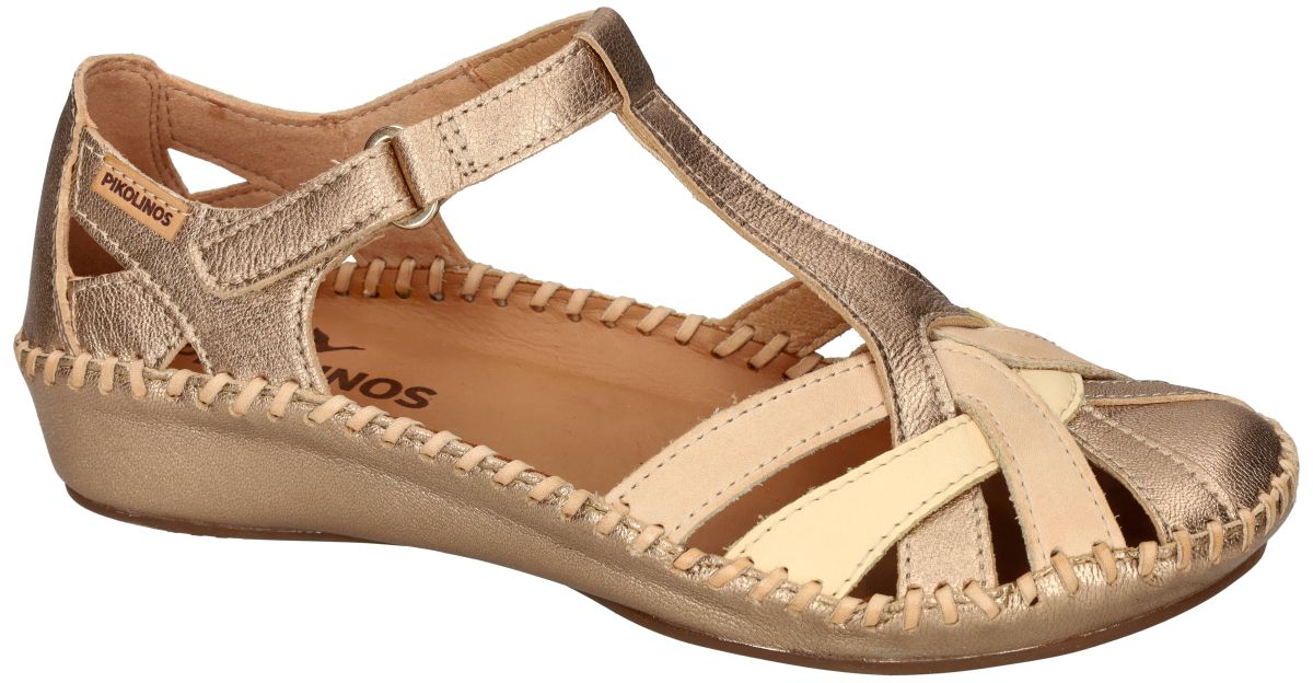 Deze gesloten sandalen van het Spaanse schoenenmerk PIKOLINOS, model P. VALLARTA 655-0732CLC2 in de uitvoering Champagne, combineren comfort met ambachtelijke charme. Het bovenwerk in soepel, chroomvrij gelooid leder wordt ecologisch verantwoord geproduceerd en voelt heerlijk zacht aan de voet. Dankzij het gesloten hielstuk en de T-band met klittenbandsluiting geniet u van een stabiele en verstelbare pasvorm. Het ultra lichte gewicht maakt deze sandaal ideaal voor dagelijks gebruik, terwijl de handgestikte afwerking en de speelse combinatie van metallic goud en beige zorgen voor een authentieke, zomerse uitstraling. De opengewerkte voorvoet biedt voldoende ventilatie, terwijl de soepele zool zorgt voor een natuurlijke afrol van de voet. Een duurzame en comfortabele keuze voor wie houdt van kwaliteit, vakmanschap en zorgeloos loopcomfort. PIKOLINOS schoenen en sandalen kan men kopen in onze schoenenwinkel regio Aalst, Ninove, Geraardsbergen, Zottegem, Liedekerke of kan men online bestellen op onze webshop.
