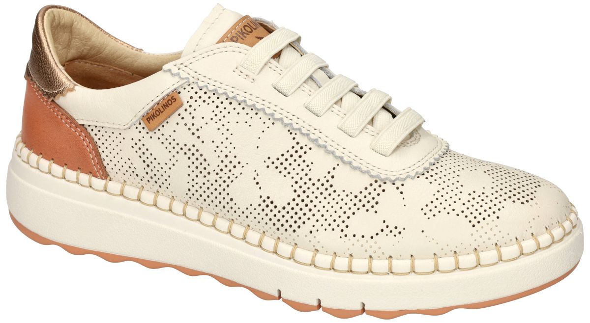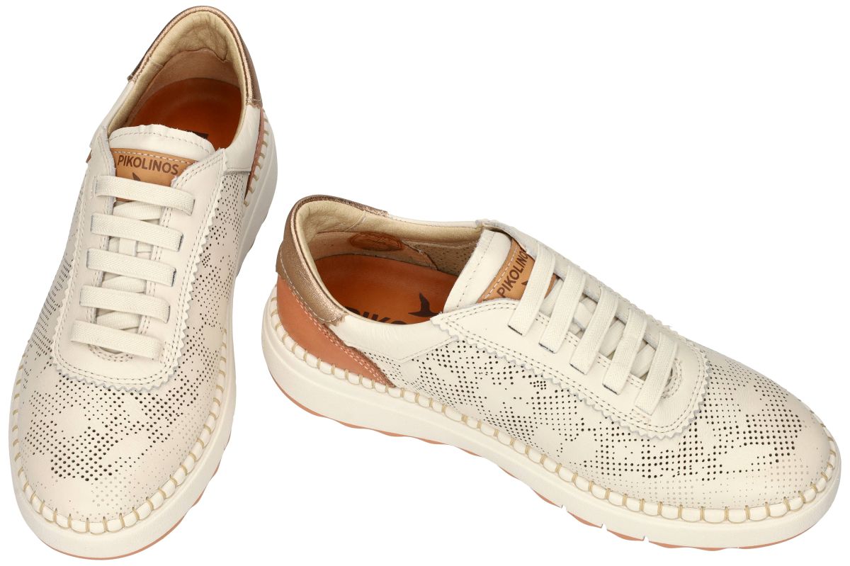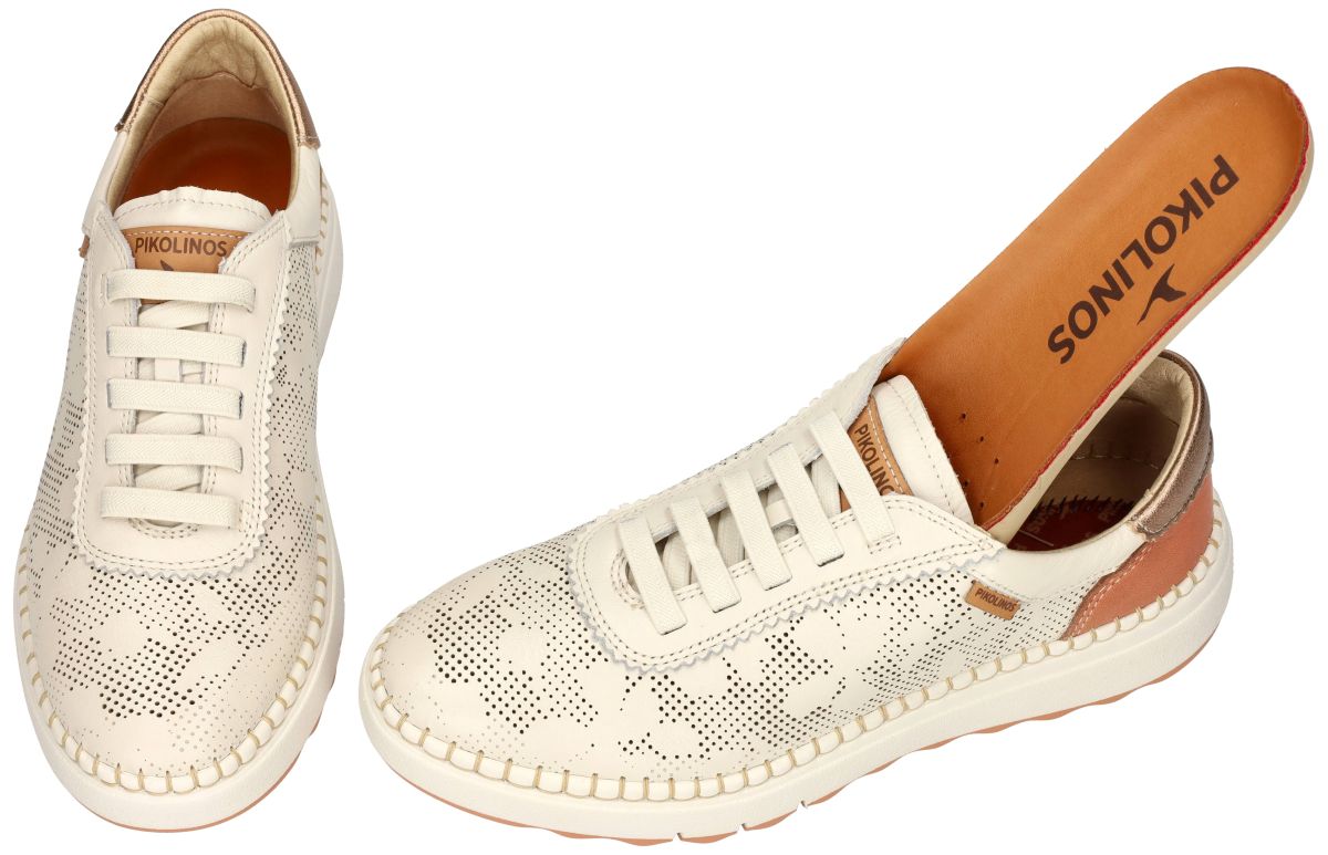 Deze slip-on sneakers van het Spaanse schoenenmerk Pikolinos, model Arenas W0C-6621C1 in de uitvoering Nata, combineren luchtig comfort met een verfijnde uitstraling. Het bovenwerk in geperforeerd crème chroomvrij gelooid leder zorgt voor optimale ventilatie en wordt ecologisch verantwoord geproduceerd. Dankzij de elastiek vetersluiting geniet u van een vlotte instap en een perfecte pasvorm. Het uitneembare voetbed biedt extra comfort en maakt deze sneaker geschikt voor eigen steunzolen. Het ultra lichte gewicht en de soepele, licht verhoogde zool zorgen voor een aangename demping en een natuurlijke afrol van de voet. De subtiele metallic accenten aan de hiel en de fijne perforaties geven deze sneaker een moderne, zomerse look. Een ideale keuze voor wie stijl, duurzaamheid en dagelijks draagcomfort moeiteloos wil combineren. PIKOLINOS schoenen en sandalen kan men kopen in onze schoenenwinkel regio Aalst, Ninove, Geraardsbergen, Zottegem, Liedekerke of kan men online bestellen op onze webshop.
