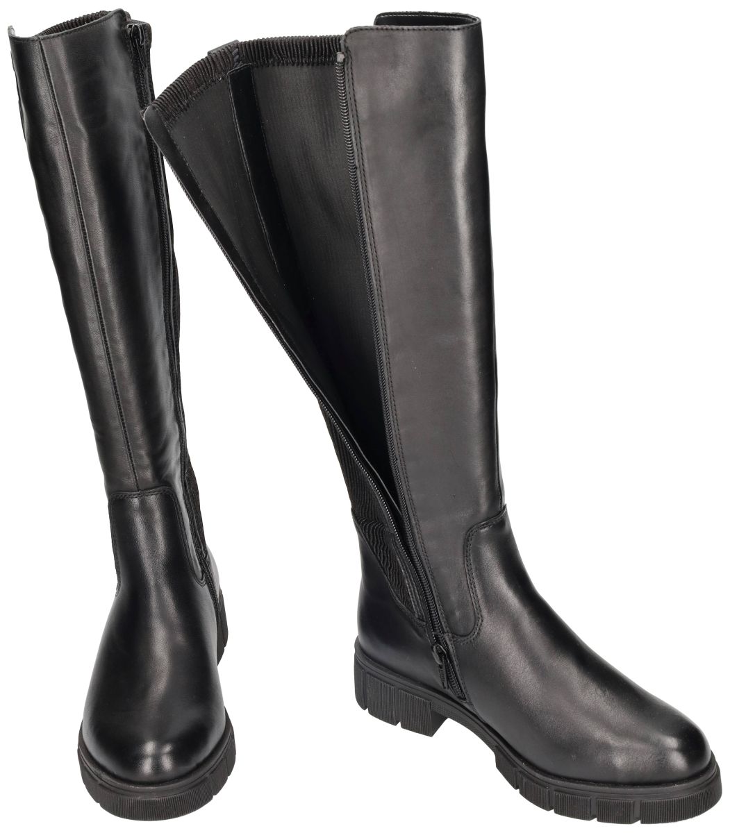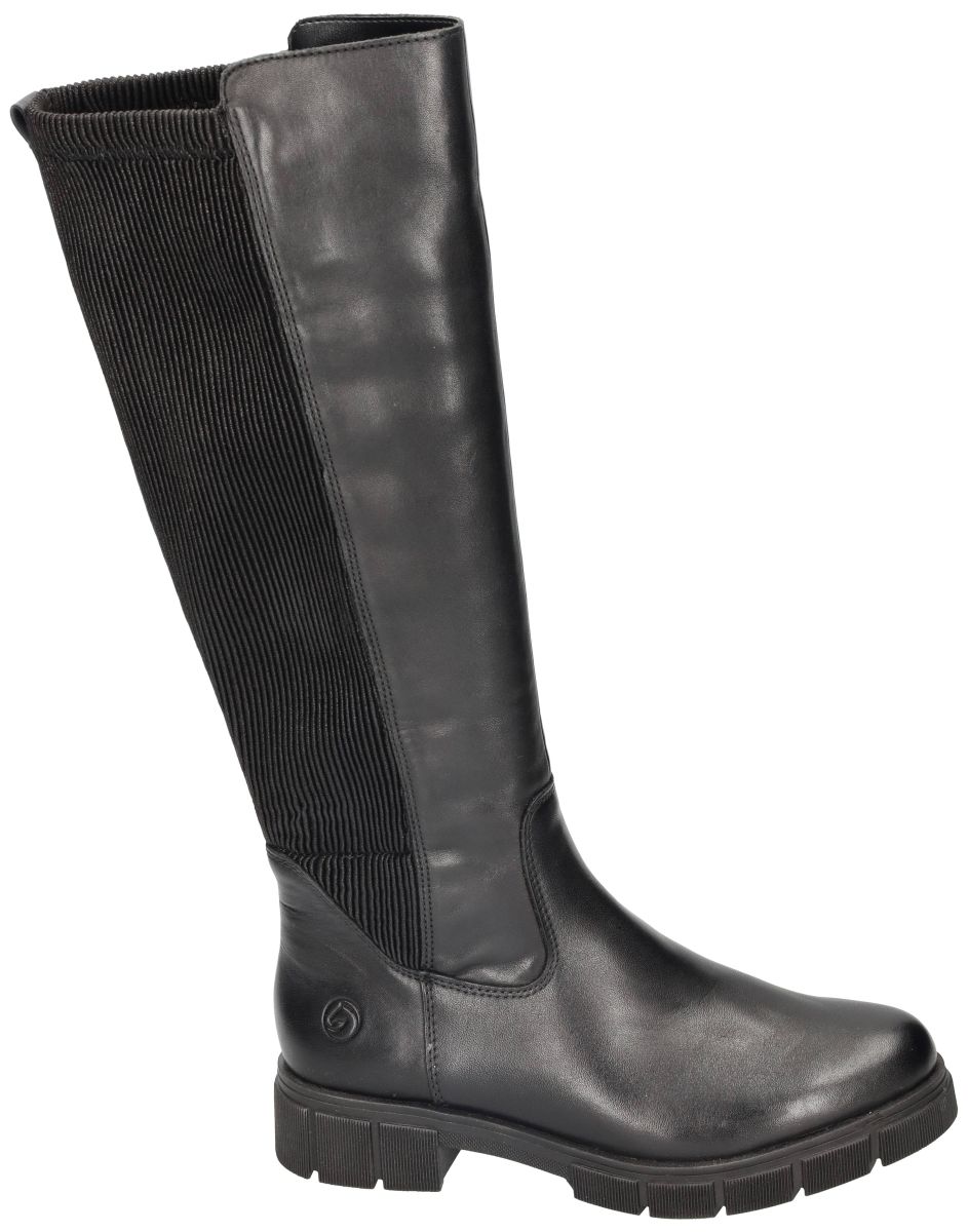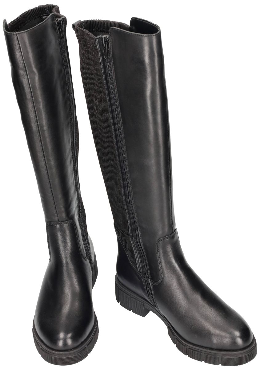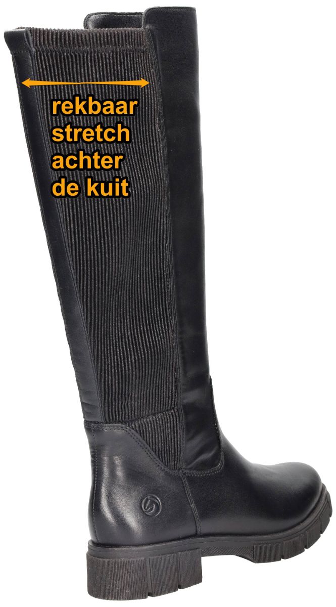 Remonte D2S74-00 Schwarz – elegante stretch rijlaars met warme voering . Deze hoge zwarte stretch rijlaarzen uit de nieuwe herfst/wintercollectie van Remonte, model D2S74-00, combineren tijdloze elegantie met optimaal draagcomfort. Dankzij hun moderne plateauzool en rekbare schacht passen ze zich moeiteloos aan elke kuitvorm aan. Het bovenwerk is uitgevoerd in zwart gladleder aan de voorzijde, terwijl de achterzijde van de schacht bestaat uit rekbaar ribstretch textiel. Dit elastische materiaal zorgt ervoor dat de laars zich mooi vormt naar het onderbeen en comfortabel aansluit — ook bij vollere kuiten of met een broek erin. De schachthoogte van ca. 40 cm reikt tot net onder de knie, waardoor deze laars zowel elegant als praktisch oogt. De ritssluiting aan de binnenzijde maakt het aan- en uittrekken bijzonder vlot. Binnenin zorgt een warme fleece voering voor aangename warmte tijdens koude dagen, terwijl het uitneembaar voetbed extra demping biedt en eventueel vervangen kan worden door eigen steunzolen. De dikke, geprofileerde plateauzool met 2 cm blokhak biedt niet alleen een stoere look, maar ook uitstekende grip dankzij de diepe antislip-ribbels op het loopvlak. Deze Remonte stretch laarzen zijn de perfecte keuze voor wie comfort en stijl wil combineren. Dankzij hun rekbare schacht passen ze zich aan elk vrouwenbeen aan, terwijl de warme voering en stevige zool zorgen voor een betrouwbaar draaggevoel de hele winter lang. Ideaal onder jurken, rokken of over een smalle broek voor een tijdloze en verzorgde winterlook. Remonte laarzen vindt men in onze schoenenwinkel regio Aalst, Ninove, Geraardsbergen, Zottegem, Liedekerke of kan men online bestellen via onze webshop.