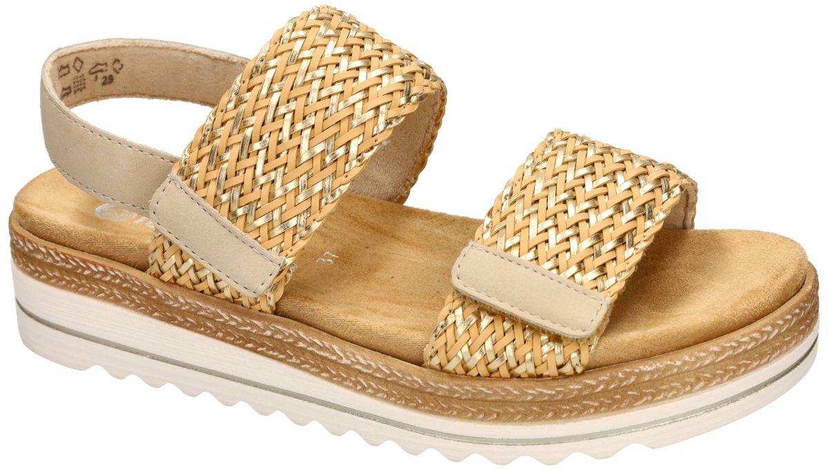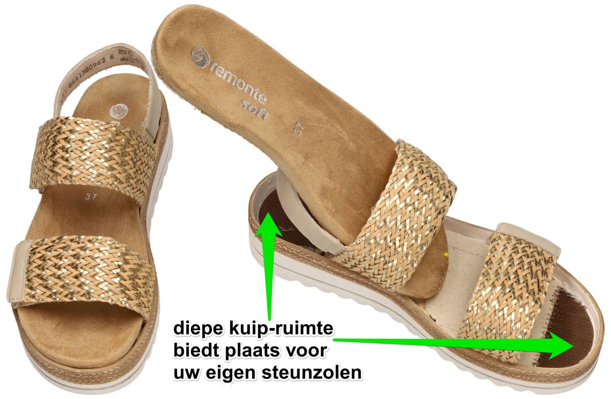 Remonte D0Q63-90 sandalen – stijlvol comfort met een speelse leder met metallic vlechtwerk . Geef je zomergarderobe een stijlvolle upgrade met deze modieuze plateauzool sandalen van het merk Remonte, artikelnummer D0Q63 in de kleurvariant 90 natur-gold/perle. Deze opvallende sandalen combineren comfort met een creatief design dat meteen in het oog springt. De blikvanger zijn de brede, gevlochten banden over de voorvoet en de wreef in en prachtig vlechtwerk van beige leder met goud metallic fijne bandjes. Dit speelse vlechtwerk zorgt niet alleen voor een modieuze uitstraling, maar geeft de sandaal ook een elegante en zomerse flair. De sandalen zijn voorzien van een comfortabele plateauzool met een dikte van 3 tot 5 cm en een subtiele hakhoogte van 2 cm, wat zorgt voor een lichte verhoging zonder in te leveren op draagcomfort. De gelaagde zool is stijlvol afgewerkt met een espadrille-koordomranding en een haaientandprofiel voor een sportieve look en extra grip. Binnenin zorgen het zachte, uitneembare “soft” voetbed en de F½-leest voor een aangename pasvorm voor gemiddelde voeten. Het voetbed is dik en dempend, en biedt ook de mogelijkheid om het te vervangen door eigen steunzolen – ideaal voor wie extra ondersteuning nodig heeft. De verstelbare klittenbandsluitingen boven voorvoet en enkel zorgen voor een gemakkelijke instap en een stevige pasvorm, zonder gedoe met gespen. Of je ze nu draagt onder een zomerjurk, een linnen broek of een short – deze Remonte sandalen geven elke outfit een stijlvolle, moderne touch met een vleugje glam. Perfect voor wie houdt van comfort met een creatief en vrouwelijk accent. Remonte dames pantoffels, slippers en sandalen vindt men in onze schoenenwinkel regioAalst, Ninove, Liedekerke, Geraardsbergen of kan men online bestellen op onze webshop.