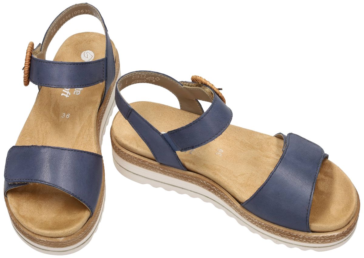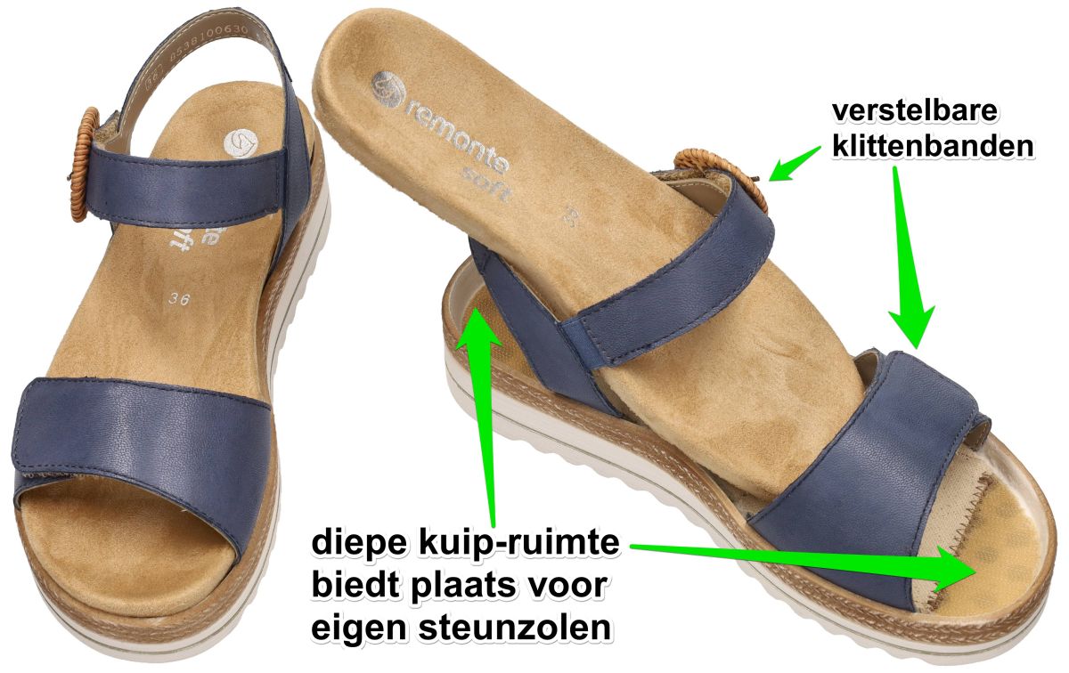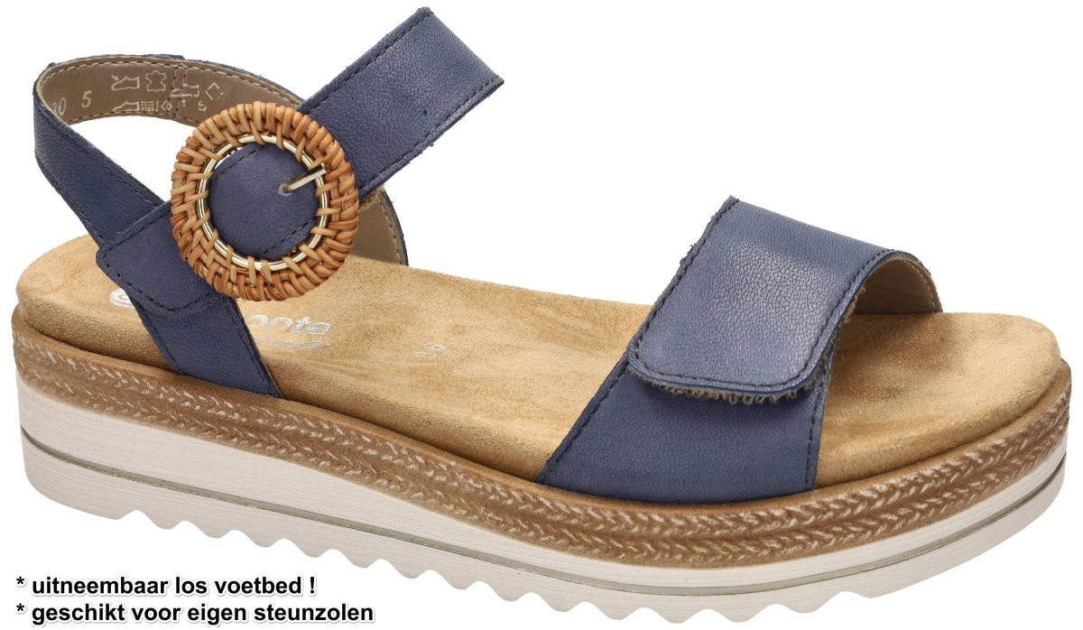 Deze Remonte dames sandalen met plateauzool uit de nieuwe lente/zomercollectie combineren modern design met uitgesproken comfort en stabiliteit. Dit model D0Q52 in de uitvoering denim blauw is ontworpen voor vrouwen die een modieuze zomersandaal zoeken met extra ondersteuning en een aangenaam draaggevoel, ook bij langer stappen. De stugge plateauzool van ca. 3 cm dik biedt een uitstekende stabiliteit en is bewust niet tors- of plooibaar, een eigenschap die sterk wordt aanbevolen door podologen en orthopedisten. Dankzij deze vaste opbouw wordt de voet correct ondersteund en krijgt het afrollen extra controle. De licht verhoogde zool zorgt bovendien voor een subtiele lift zonder het evenwicht te verstoren. Het dikke, zachte en veerkrachtige voetbed is uitneembaar en kan indien gewenst vervangen worden door eigen steunzolen. De diepe kuipvorm biedt voldoende ruimte en stabiliteit voor de voet, wat deze sandaal ook geschikt maakt voor wie extra ondersteuning nodig heeft. De upper is uitgevoerd in jeansblauw gladleder en oogt fris, zomers en tijdloos. De sandaal is voorzien van twee verstelbare klittenbandsluitingen: één over de voorvoet en één rond de hiel, waardoor de pasvorm eenvoudig en individueel kan worden aangepast. De ronde, riet-gevlochten gesp aan de zijkant is een decoratief detail dat het geheel een natuurlijke, zomerse uitstraling geeft. De binnenbekleding in fijn leder draagt bij aan een aangenaam klimaat en extra comfort, zelfs op warme dagen. Opvallend zijn verder de lichte, contrasterende tussenzool, het anti-slip loopvlak en de harmonieuze combinatie van materialen en kleuren, die deze Remonte sandalen zowel functioneel als stijlvol maken. Remonte dames pantoffels, slippers en sandalen vindt men in onze schoenenwinkel regioAalst, Ninove, Liedekerke, Geraardsbergen of kan men online bestellen op onze webshop.