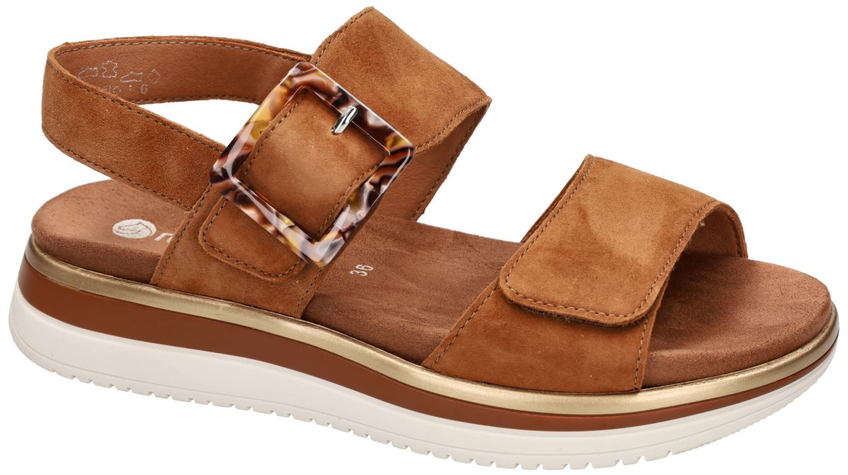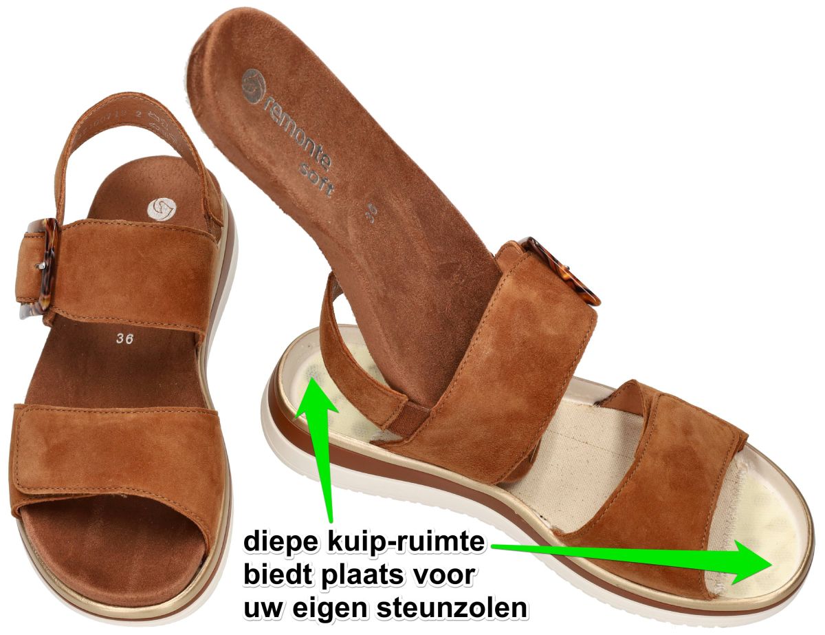 Ontdek het comfort van deze damessandalen van Remonte, model D1J62-22 in de warme uitvoering noccia goatsuede. Deze sandaal is uitgevoerd in zacht ree-bruin suède dat een luxueuze en natuurlijke uitstraling geeft. Dankzij de twee praktische klittenbandsluitingen – één over de voorvoet en één met decoratieve gesp aan de wreef – past u de sandaal moeiteloos aan uw voet aan. Het uitneembare voetbed zorgt voor extra flexibiliteit en maakt deze sandaal perfect geschikt voor eigen steunzolen. De diepe kuipvorm biedt daarbij extra stabiliteit en comfort. De stevige, gelaagde zool met subtiele sleehak combineert een sportieve look met uitstekende schokdemping en ondersteuning bij elke stap. Een ideale keuze voor wie stijl, comfort en functionaliteit wil combineren tijdens warme dagen. Remonte dames pantoffels, slippers en sandalen vindt men in onze schoenenwinkel regio Aalst, Ninove, Liedekerke, Geraardsbergen, Zottegem of kan men online bestellen op onze webshop