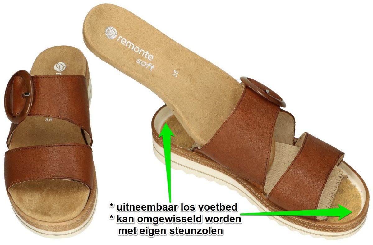 REMONTE artikel/model D0Q51-82 zijn bruine damesschoenen comfort slippers, instappers of muiltjes van de Duitse schoenenfabrikant Remonte. Deze super comfortabele damesslippers staan op een 3 cm dikke plateauzool en zijn uitgevoerd in een donker cognacbruin leder met een grote ronde bruine gesp en zijn door de brede velcro of klittenbandsluitingen aanpasbaar aan elke voet. Deze super comfortabele Remonte slipper heeft een uitermate aangenaam zacht memory voetbed dat desgewenst ook kan worden uitgenomen (los voetbed) om indien nodig te vervangen door uw eigen steunzolen. Remonte schoenen en sandalen kan men kopen in onze schoenenwinkel regio Aalst, Ninove, Geraardsbergen, Zottegem, Liedekerke of online bestellen op onze webshop.