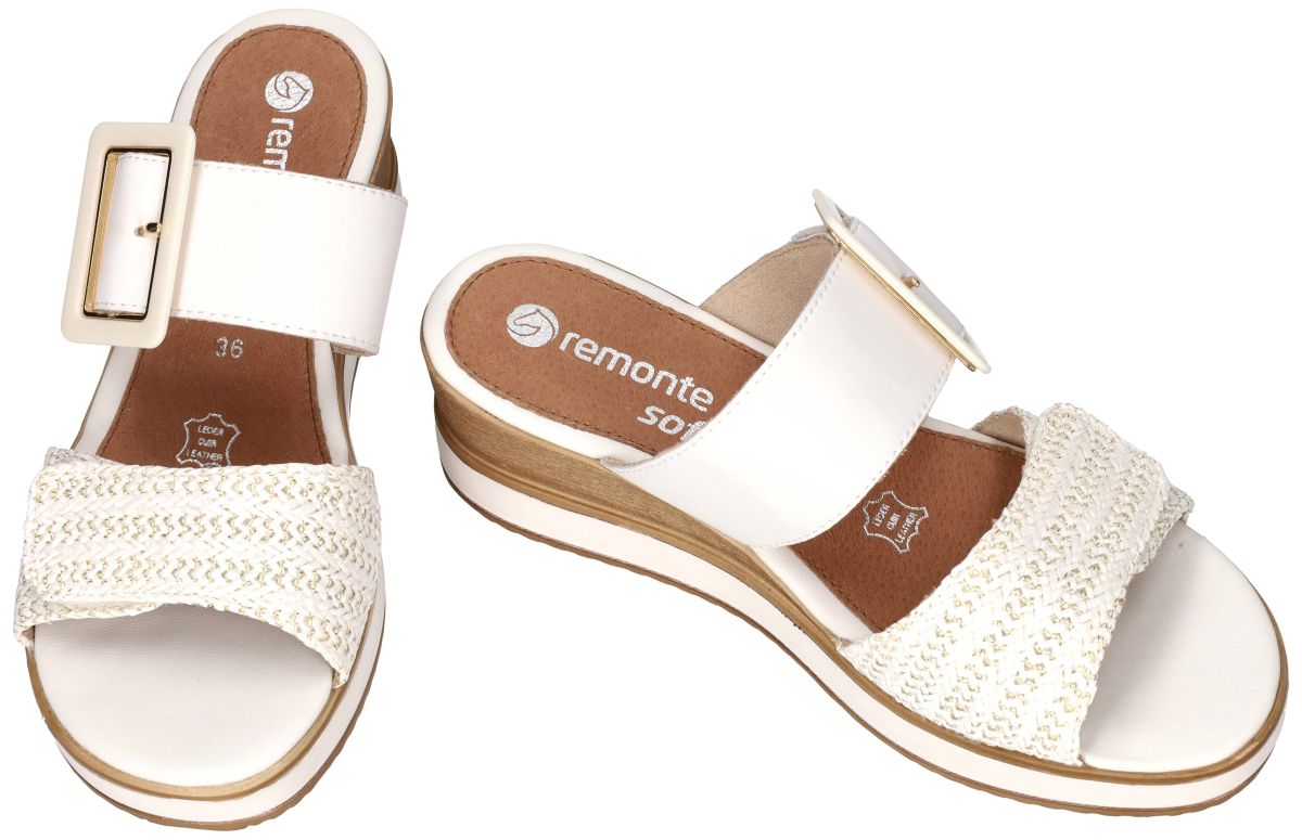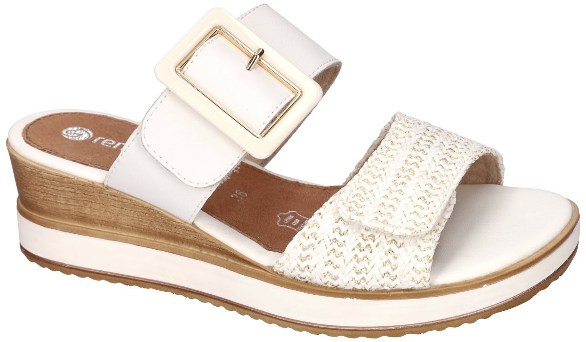Remonte D6463-80 – Weiss Gold zijn trendy slipper muiltjes met sleehak. Deze stijlvolle slipper muiltjes uit de nieuwe lente/zomercollectie van Remonte combineren zomerse elegantie met het vertrouwde comfort waar het merk om bekend staat. Het model D6463-80 in de uitvoering weiss-gold is een frisse en modieuze keuze voor dames die houden van lichte tinten met een subtiele luxetoets. Comfortabele plateauzool met sleehak. De sandaal is opgebouwd op een 2 cm dikke plateauzool, afgewerkt met een natuurlijke houtlook rand. Daarboven zorgt een geïntegreerde sleehak die de hiel 3 cm oplift voor een vrouwelijke, licht verhogende pasvorm zonder in te boeten aan stabiliteit. Deze combinatie geeft u net dat beetje extra lengte, terwijl de voet mooi ondersteund blijft over de volledige lengte van de zool. Twee verstelbare klittenbanden. Voor een optimale pasvorm is dit model voorzien van twee verstelbare klittenbandsluitingen. Zowel over de wreef als over de voorvoet kan u de slipper eenvoudig aanpassen aan uw voet. De grote witte lakgesp met goudkleurig detail op de bovenste band is louter decoratief en geeft de sandaal een modieuze, opvallende uitstraling zonder dat u hoeft te werken met een echte gesp. Zomers design in wit en goud. Het ontwerp straalt zachtheid en klasse uit. De bovenste brede band is uitgevoerd in wit gladleder met een elegante, licht glanzende afwerking. De voorste band is vervaardigd uit een gevlochten of geweven materiaal in wit, subtiel doorweven met goudkleurige accenten. Dit zorgt voor een speels textuureffect en een zomerse, bijna mediterrane uitstraling. Het voetbed heeft een warme cognackleurige tint die mooi contrasteert met het witte bovenwerk, terwijl de combinatie van wit, beige en goud in de zool zorgt voor een harmonieuze en verfijnde look. De licht gekartelde loopzool onderaan biedt extra grip tijdens het wandelen. De Remonte D6463-80 weiss-gold is de perfecte slipper voor wie comfort en stijl wil combineren tijdens warme dagen. Dankzij de plateauzool, subtiele sleehak en verstelbare klittenbanden geniet u van een stabiele, comfortabele pasvorm in een elegant zomers design. Een veelzijdige must-have voor uw lente- en zomergarderobe. Remonte slippers, muiltjes en sandalen kan men kopen in onze schoenenwinkel regio Aalst, Ninove, Geraardsbergen, Zottegem, Liedekerke of online bestellen op onze webshop.
