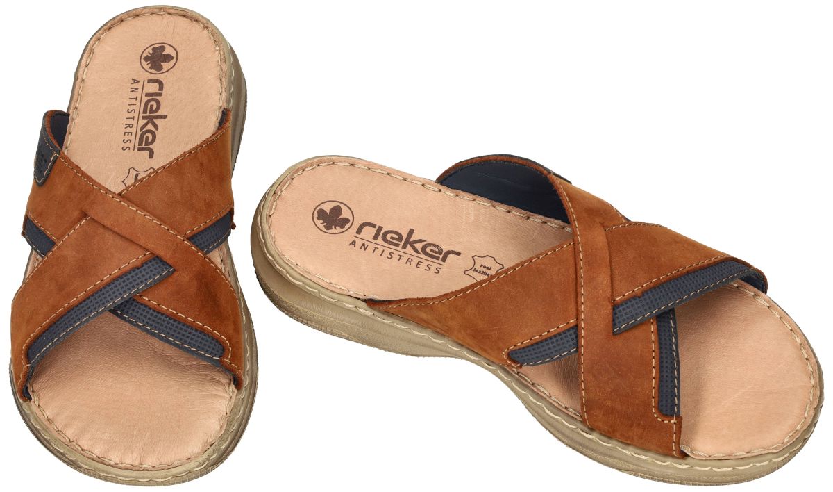 Deze comfortabele heren sloffen of slippers van Rieker antistress zijn ontworpen voor mannen die waarde hechten aan gemak, ondersteuning en een verzorgde casual uitstraling. Model 21493-22 in de uitvoering pazifik/noce combineert warme natuurtinten met functioneel draagcomfort. De upper in hazelnootbruin suède wordt stijlvol geaccentueerd met marineblauwe lederen details, wat deze slipper een sportief-verzorgde look geeft. Het kruisende bandontwerp over de wreef zorgt voor een goede voetomsluiting en extra stabiliteit tijdens het stappen, terwijl de open teenconstructie zorgt voor ventilatie op warme dagen. Binnenin is deze Rieker slipper voorzien van een zacht, met leder bekleed voetbed dat aangenaam aanvoelt en de voet optimaal ondersteunt. De G½-wijdte leest biedt extra comfort voor de gemiddelde tot iets bredere voet. De schokabsorberende antistress-zool vangt impact op en vermindert de belasting op gewrichten, wat deze slipper geschikt maakt voor zowel binnen- als buitenshuis gebruik. Dankzij de lichte, flexibele zool en de zorgvuldig afgewerkte stiknaden is dit een duurzame en comfortabele heren slipper voor dagelijks gebruik, vakantie of ontspanning. Een betrouwbare keuze voor wie het vertrouwde comfort van Rieker antistress weet te appreciëren. Rieker heren slippers en pantoffels vindt men in onze schoenenwinkel regio Aalst, Ninove, Geraardsbergen, Zottegem, Liedekerke of kan men online bestellen via onze webshop.