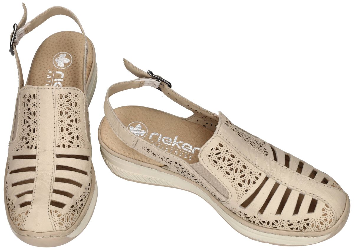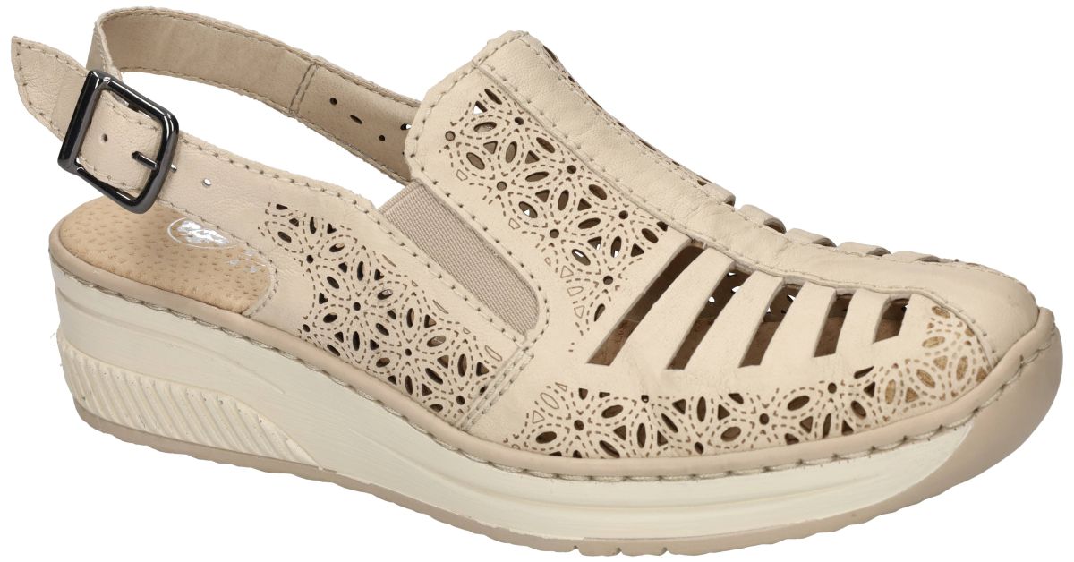 Deze Rieker slingback sandalen artikel 48763-60 in de kleur crema (beige) zijn de ideale zomerschoen voor dames die luchtigheid, comfort en een verzorgde uitstraling willen combineren. Het ontwerp met gesloten neus biedt extra bescherming aan de tenen, terwijl de openingen en verfijnde afwerking zorgen voor een aangenaam fris draaggevoel op warme dagen. De zandkleurig beige lederen upper is rijkelijk voorzien van fantasierijke, uitgelaserde perforaties, die niet alleen voor ventilatie zorgen maar deze sandaal ook een elegante, vrouwelijke en ook mediterane uitstraling geven. Dankzij de plateauzool wordt de hiel subtiel ongeveer 2 cm opgelift, wat het loopcomfort verhoogt zonder in te boeten aan stabiliteit. Binnenin is deze Rieker sandaal uitgerust met een kussenzacht voetbed, typerend voor het merk, dat elke stap dempt en langdurig comfort biedt. De ultralichte zoolconstructie maakt deze slingback bijzonder aangenaam om de hele dag te dragen, zowel binnenshuis als buitenshuis. De verstelbare gesp aan de hielriem zorgt bovendien voor een persoonlijke en veilige pasvorm. Deze Rieker 48763-60 is een perfecte keuze voor wie op zoek is naar een comfortabele zomersandaal met gesloten teen, ideaal voor wandelingen, vakanties of dagelijks gebruik. Een tijdloos, licht en vrouwelijk model dat moeiteloos combineert met zomerse outfits en bekendstaat om zijn betrouwbare Rieker-kwaliteit. Rieker dames pantoffels, slippers en sandalen vindt men in onze schoenenwinkel regioAalst, Ninove, Liedekerke, Geraardsbergen of kan men online bestellen op onze webshop.