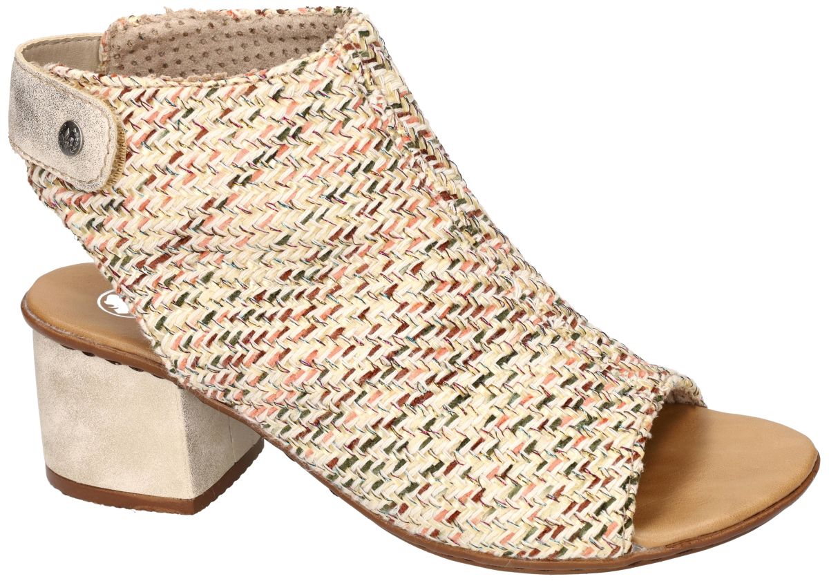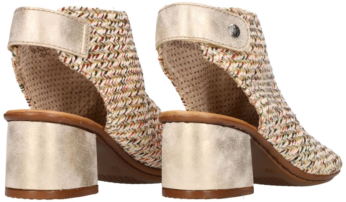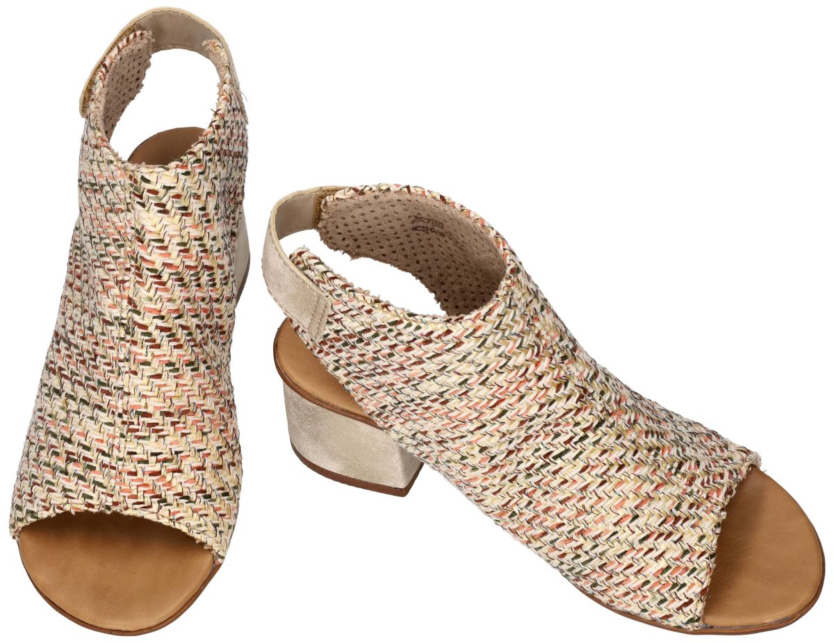 Maak kennis met deze unieke peep-toe sandaal met enkellaars-allure uit de nieuwe lente/zomer collectie van Rieker Antistress, model 64670-62 in de uitvoering San Marino / Alula beige / muschel. Dit bijzondere ontwerp is een stijlvolle kruising tussen een enkellaarsje en een sandaal – vrouwelijk, elegant en tegelijk comfortabel. De upper is uitgevoerd in een opvallend en verfijnd textielmix vlechtwerk van garen en raffia, subtiel gemêleerd in zachte tinten beige, crème, koraal, olijf en camel. Deze ambachtelijke structuur geeft de sandaal een natuurlijke, zomerse uitstraling met een modieuze twist. De wreef wordt hoog omsloten tot boven de enkel, wat niet alleen zorgt voor een elegante silhouetlijn, maar ook voorkomt dat de voet naar voren doorschuift. Hierdoor is dit model uitermate geschikt voor dames met smalle voeten die vaak stabiliteit missen in open sandalen. De voorzijde is afgewerkt met een peep-toe opening die de tenen net gepast onthult – subtiel en verfijnd, zonder te veel bloot te geven. Achteraan wordt de sandaal gesloten met een praktische klittenbandsluiting boven de enkel, mooi geïntegreerd in een licht metallic beige band met decoratieve drukknoop. De robuuste, licht gemêleerde blokhak tilt de hiel 5 cm op, wat zorgt voor een vrouwelijke houding zonder in te boeten aan comfort. De brede hakbasis garandeert stabiliteit en vertrouwen bij elke stap. Het malse voetbed en de typische Rieker Antistress-constructie zorgen voor lichtheid, flexibiliteit en schokdemping. Dit model laat zich moeiteloos combineren met een zomerse jurk, linnen broek, culotte of zelfs een elegante short. Dankzij de natuurlijke kleurstelling en het speelse vlechtwerk vormt deze sandaal een stijlvolle blikvanger binnen elke zomergarderobe. Een uitgesproken maar draagbaar design – voor dames die comfort en mode perfect willen verenigen. Rieker sandalen vindt men in onze schoenenwinkel regio Aalst, Ninove, Geraardsbergen, Zottegem, Liedekerke of kan men online bestellen op onze webshop.