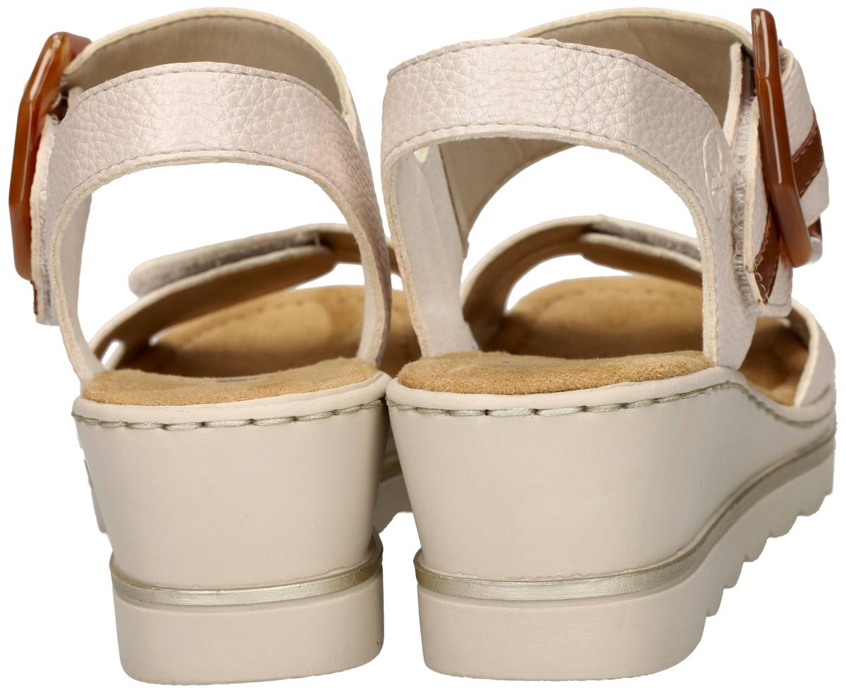 Rieker Antistress 67176-91 zijn comfortabele plateau sleehak sandalen in parelmoer-wit leder met stijlvolle gesp. Deze Rieker Antistress sleehak sandalen (67176-91) combineren stijl, comfort en functionaliteit in één tijdloos ontwerp. De ecru-wit met parelmoerglans grof generfd lederen afwerking straalt elegantie uit en past moeiteloos bij zowel casual als geklede outfits. Een Cayenne bruine achthoekige gesp voegt een verfijnde, decoratieve touch toe, terwijl de sandalen dankzij de twee praktische klittenbandsluitingen perfect verstelbaar zijn voor een optimale pasvorm. Het zachte, met nubuck beklede voetbed zorgt voor een aangenaam gevoel bij elke stap, ideaal voor lange zomerdagen. De lichte sleehak met een subtiele 3 cm hiellift biedt extra steun en een vrouwelijke uitstraling zonder in te boeten op comfort. Rieker's innovatieve Antistress-technologie zorgt voor een schokabsorberend effect en maximale flexibiliteit, waardoor deze sandalen een uitstekende keuze zijn voor dagelijks gebruik. Met hun tijdloze design en zeer democratische prijs zijn deze sandalen een must-have voor iedereen die mode en comfort wil combineren. Perfect voor zomerse dagen, stedentrips of gewoon als elegante aanvulling op je schoenencollectie. Bestel nu en ervaar het verschil van Rieker Antistress! Rieker dames pantoffels, slippers en sandalen vindt men in onze schoenenwinkel regioAalst, Ninove, Liedekerke, Geraardsbergen of kan men online bestellen op onze webshop.