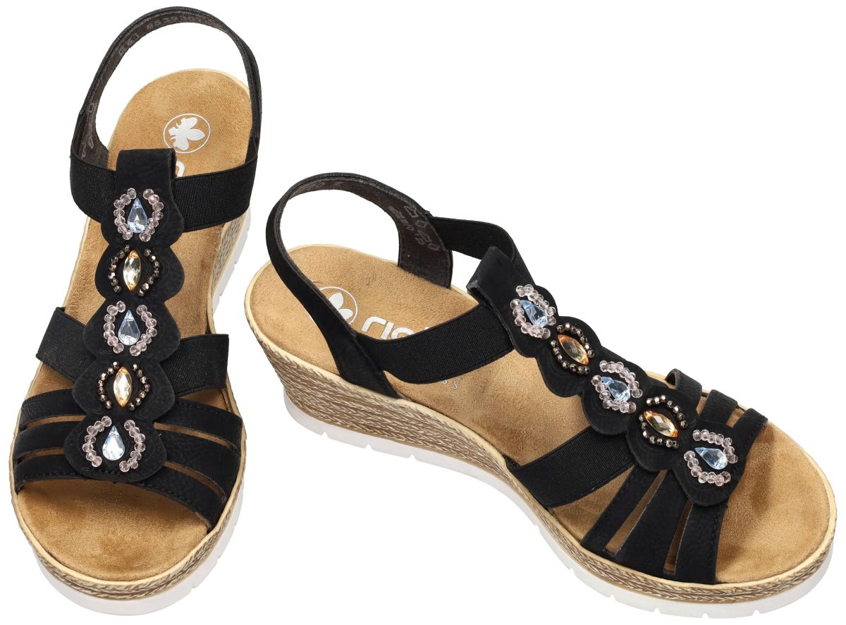 Deze elegante Rieker Antistress sleehak sandalen voor dames combineren zomerse vrouwelijkheid met het gekende comfort waar Rieker om bekend staat. Dit model met artikelnummer 619B2-00, uitgevoerd in schwarz, is een ideale keuze voor wie een comfortabele wedge sandaal zoekt met een verfijnde, modieuze uitstraling. Het bovenwerk bestaat uit zwarte, elastiek banden die mooi over de voorvoet lopen en centraal worden samengebracht door een decoratieve applicatie met fonkelende siersteentjes of imitatie edelstenen. De combinatie van helder kristal, warm goudkleurig accent en subtiele parelglans geeft deze sandaal een luxueuze uitstraling en maakt ze perfect geschikt voor zowel dagelijkse zomerse outfits als feestelijkere gelegenheden. De elastische inzetstukken zorgen ervoor dat de sandaal zich vlot aanpast aan de voet en makkelijk aan- en uit te trekken is. Zoals u van Rieker mag verwachten, is ook dit model uitgerust met de Antistress-technologie: licht van gewicht, flexibel en voorzien van een zacht, dempend voetbed dat de druk op de voeten vermindert en het loopcomfort aanzienlijk verhoogt. De sleehakzool heeft een natuurlijke kurklook met decoratief reliëf en wordt onderaan afgewerkt met een lichte, schokabsorberende loopzool die extra stabiliteit en grip biedt. De wedge tilt de hiel 4 cm op, wat zorgt voor een elegante houding zonder in te boeten aan comfort. Extra noemenswaardig zijn de zachte binnenafwerking, de stabiele hielband en de comfortabele pasvorm die deze sandaal bijzonder geschikt maken voor langere zomerdagen. Deze zwarte Rieker Antistress wedge sandalen zijn de perfecte balans tussen comfort, elegantie en gebruiksgemak – een betrouwbare en stijlvolle zomersandaal voor vrouwen die zorgeloos willen stappen. Rieker dames pantoffels, slippers en sandalen vindt men in onze schoenenwinkel regioAalst, Ninove, Liedekerke, Geraardsbergen of kan men online bestellen op onze webshop.