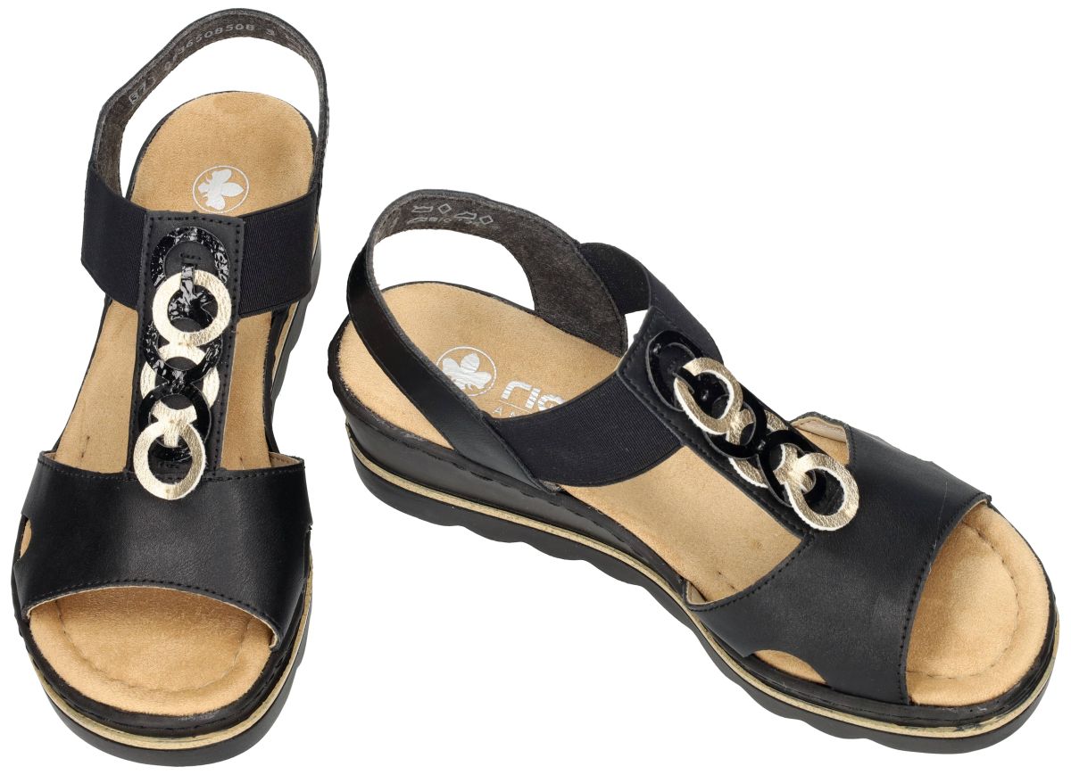 Deze Rieker antistress wedge sandalen uit de nieuwe lente/zomercollectie combineren moeiteloos comfort, gebruiksgemak en een elegante uitstraling. Dit model met artikelnummer 67498 in de uitvoering schwarz / lightgold is ideaal voor vrouwen die een stabiele zomersandaal zoeken die snel aan- en uitgaat, zonder in te boeten aan stijl. Dankzij de elastische banden rond de wreef en hiel trek je deze sandaal vlot aan en uit, volledig zonder gespen of klittenbanden. De elastieken passen zich soepel aan de voet aan en zorgen voor een veilige, comfortabele fixatie, ook bij licht wisselend voetvolume. De sandaal is opgebouwd op een 2 cm dikke plateauzool, gecombineerd met een sleehak die de hiel ongeveer 3 cm subtiel omhoog brengt. Deze combinatie zorgt voor een stabiele stand, een mooie houding én een aangename ontlasting van voeten en rug tijdens het stappen. De licht golvende loopzool draagt bij aan een natuurlijke afrol en extra loopcomfort. Het zachte microvelour voetbed voelt fluweelachtig aan en verhoogt het draagcomfort, zelfs op warme dagen of bij langer gebruik. Zoals je van Rieker antistress mag verwachten, ligt de nadruk op lichtgewicht materialen, schokdemping en een ontspannen pasvorm. Het design is uitgevoerd in zwart glad leder, gecombineerd met zwarte elastiekbanden en verfijnde lichtgouden, glanzende details op de wreef. Deze kleine accenten geven de sandaal een elegante, vrouwelijke toets zonder opzichtig te worden. De open teen en luchtige belijning maken dit model perfect voor zomerse dagen, zowel casual als iets gekleder. Deze Rieker sleehak sandalen zijn een uitstekende keuze voor wie comfort, eenvoud en een elegante look wil combineren in één zomers model. Rieker dames pantoffels, slippers en sandalen vindt men in onze schoenenwinkel regioAalst, Ninove, Liedekerke, Geraardsbergen of kan men online bestellen op onze webshop.