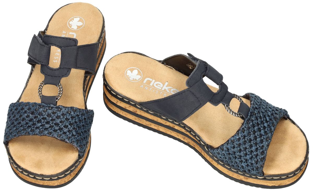 Deze plateauzool slippers van Rieker, model 62943-14 in de kleur pazifik blauw, combineren zomerse stijl met het gekende Antistress comfort. De brede voorband in gevlochten en geknoopt raffia zorgt voor een luchtige uitstraling, terwijl de bovenste band in zacht nubuck-look voorzien is van een praktische klittenbandsluiting voor een perfecte pasvorm. Het zachte, licht dempende voetbed biedt aangenaam comfort bij elke stap. De lichtgewicht plateauzool met subtiele sleehak zorgt voor extra ondersteuning en een stabiel loopgevoel, ideaal voor dagelijks gebruik. De combinatie van kurklook en donkere accenten geeft deze slipper een moderne, natuurlijke uitstraling. Een comfortabele en stijlvolle keuze voor warme dagen, perfect te combineren met elke casual zomerse outfit. Rieker slippers en sandalen kan men kopen in onze schoenenwinkel regio Aalst, Ninove, Geraardsbergen, Zottegem, Liedekerke of kan men online bestellen op onze webshop.