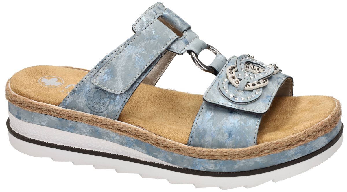 Deze stijlvolle Rieker Antistress slippers V7986-12 in de uitvoering heaven/fog-silver combineren zomerse elegantie met het gekende draagcomfort van Rieker. Een modieuze damesslipper op plateauzool die niet alleen licht aanvoelt, maar ook perfect verstelbaar is dankzij de praktische klittenbandsluitingen. De upper is uitgevoerd in een zacht gemêleerde blauwgrijze tint – heaven/fog – met een subtiele zilverachtige nuance die het geheel een frisse, zomerse uitstraling geeft. De brede voorste band is afgewerkt met een decoratief, overlappend sierelement in zilverkleur met fijne studs. Dit geeft de slipper een speelse, vrouwelijke toets zonder overdadig te worden. De wreefband is verstelbaar met klittenband, wat zorgt voor een optimale pasvorm en eenvoudig aan- en uittrekken. Het metalen ringdetail tussen de banden versterkt het modieuze karakter en zorgt tegelijk voor extra flexibiliteit tijdens het stappen. Binnenin geniet u van het typische Rieker Antistress comfort: Lichtgewicht en flexibel ontwerp. Schokdempende zool . Extra ruimte voor een aangename pasvorm. Het zachte, suède-achtige voetbed voelt aangenaam aan en ondersteunt de voet tijdens warme zomerdagen. De plateauzool is afgewerkt met een natuurlijke touwrand (espadrille-look), wat zorgt voor een zomerse, casual uitstraling. De witte loopzool met licht profiel biedt stabiliteit en grip, terwijl de subtiele verhoging in de zool zorgt voor een elegante lift zonder in te boeten aan comfort. Dankzij de combinatie van het licht verhoogde plateau, de verstelbare klittenbanden en het zachte voetbed is deze slipper ideaal voor dagelijks gebruik, vakanties of lange zomerse wandelingen. Rieker V7986-12 heaven/fog-silver is de perfecte keuze voor dames die een modieuze plateau slipper zoeken met verstelbaar comfort en een verfijnde, zomerse uitstraling. Een veelzijdige must-have voor het nieuwe seizoen. Rieker slippers en sandalen vindt men in onze schoenenwinkel regio Aalst, Ninove, Geraardsbergen, Zottegem, Liedekerke of kan men online bestellen op onze webshop.