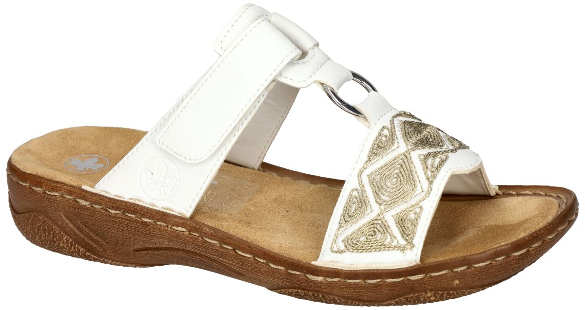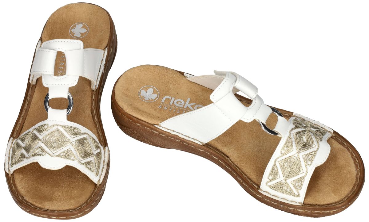 Rieker Dames Slippers V2864-80 Alabama weiss – Comfort en Stijl in Perfecte Harmonie. Deze Rieker dames slippers, model V2864-80 Alabama weiss, combineren comfort en elegantie in een clean wit leder met goud stiksel broderie. Ontworpen met oog voor detail, biedt deze Rieker vrouwen slipper een uitstekende keuze voor warme zomerdagen en relaxte momenten. Stijlvolle Details: Het bovenwerk van deze slippers is uitgevoerd in hoogkwalitatief bleek goud metallic borduurwerk. De brede band vooraan is voorzien van sierlijke goud borduurwerk in een ruiten patroon. Het metalen ringdetail zorgt voor een moderne touch, terwijl het geheel een vrouwelijke uitstraling behoudt. Ongeëvenaard Comfort: De slippers hebben een zacht gevoerde binnenzool van textiel die zorgt voor een aangenaam draagcomfort gedurende de hele dag. De flexibele en lichte zool biedt optimale demping, terwijl de stevige antislip-loopzool stabiliteit garandeert op diverse ondergronden. Praktisch en Functioneel: Met een handige klittenbandsluiting zijn de slippers eenvoudig aan te passen aan de voet, waardoor een perfecte pasvorm wordt verzekerd. Het ontwerp biedt voldoende ondersteuning, ideaal voor dagelijkse activiteiten of een ontspannen wandeling. Met deze witte Rieker slippers straalt u moeiteloos stijl uit zonder concessies te doen aan comfort. Ideaal voor casual outfits en zomerse gelegenheden. Voeg deze veelzijdige slippers vandaag nog toe aan uw collectie en geniet van de perfecte balans tussen mode en functionaliteit. Rieker dames pantoffels, slippers en sandalen vindt men in onze schoenenwinkel regioAalst, Ninove, Liedekerke, Geraardsbergen of kan men online bestellen op onze webshop.