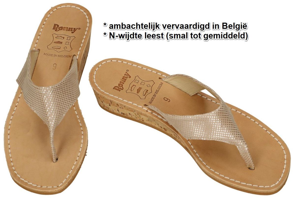 RONNY artikel/model 823 3N 411/crist camel zijn beige/camel met stippenprint damesschoenen slippers meer bepaald teenslippers uit de nieuwe lente/zomer 2023 collectie van de Belgische schoenenfabrikant Ronny. Deze comfortabele Ronny teenslippers of insteker muiltjes hebben een smalle tot normale N-wijdte leest zijn uitgevoerd met een bovenwerk zacht beige nubuck met fijne taupe lak stipjes bedrukt en het voetbed is 100% natuurlijk kalfsleder. De wedge of sleehak van 3 cm hoog is van natuurkurk en de antislip loopzool is uit rubber gemaakt. De Belgische Ronny teenslippertjes zijn gekend en bestaan al decenia lang en hebben vele fans die zweren bij deze super comfortabele aansteker muiltjes. Ronny slippers en muiltjes kan men kopen in onze schoenenwinkel regio Aalst, Ninove, Geraardsbergen of kan men online bestellen op onze webshop. Is uw maat, hakhoogte, breedte-leest niet op voorraad? Contacteer ons dan proberen we u alsnog te helpen.