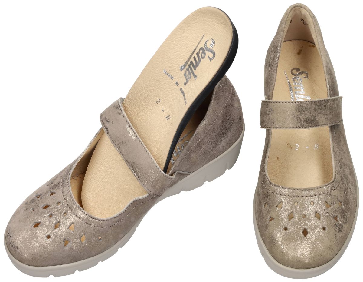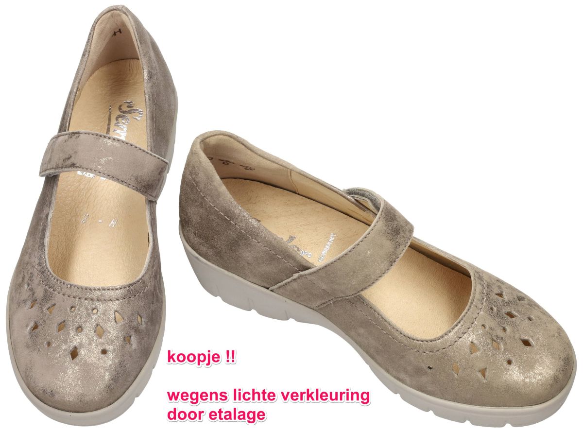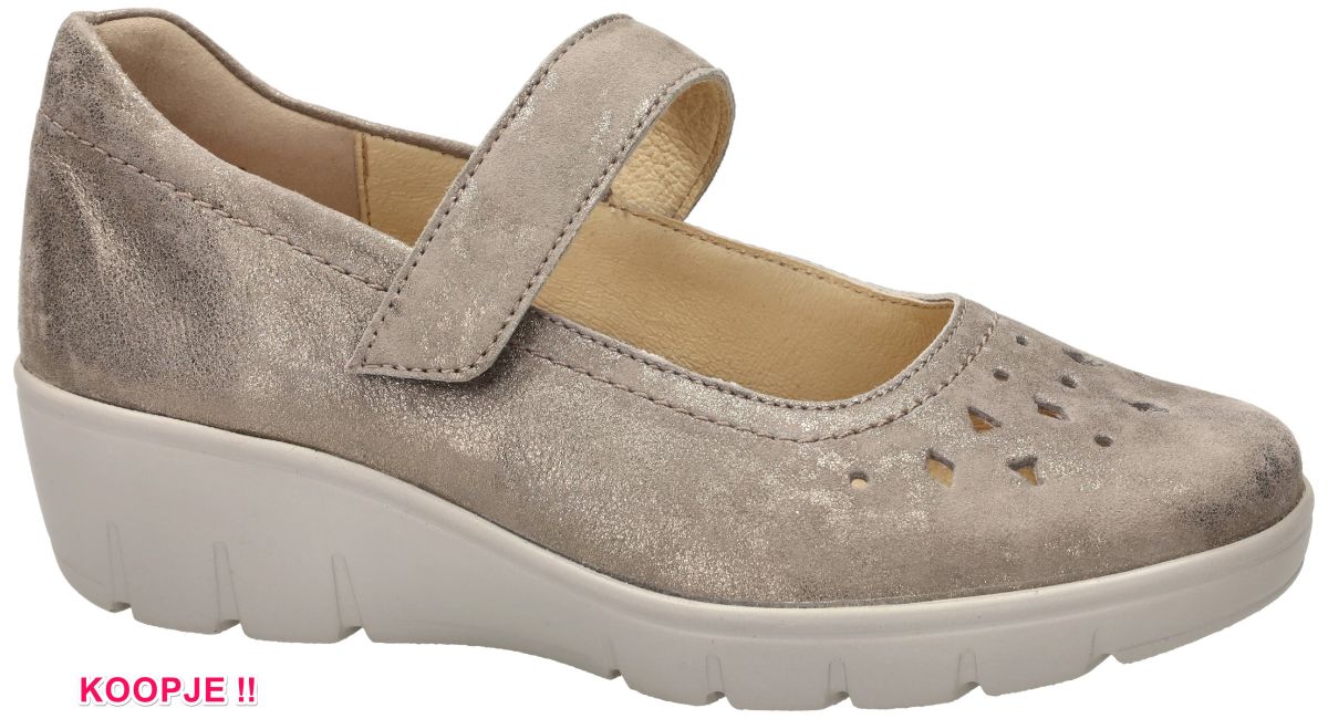 Semler J7095 Judith Metallic-Velour panna – laatste paar maat 34½ aan -80% korting! Een unieke kans voor wie een kleine maat zoekt én houdt van verfijnde comfortstijl. Deze luxe klittenband ballerina van Semler, model J7095 Judith, is uitgevoerd in oud-goud Metallic-Velours nubuck met subtiele glans en decoratieve perforaties op de voorvoet. De ballerina staat op een sleehak met 4 cm hielhoogte. Door lichte verkleuring tussen linker en rechter schoen door etalage-blootstelling, wordt dit laatste paar aangeboden aan maar liefst -80% korting – een echt koopje! Daarnaast valt op dat het model een gesloten hiel en afgeronde neus heeft, wat extra stabiliteit biedt. De binnenvoering is volledig in leer uitgevoerd, waardoor uw voeten kunnen ademen en extra zacht omsloten worden. Een buitenkansje voor een klein voetje dat groots comfort verdient! Voor wie maat 34½ nodig heeft, is dit een uitzonderlijke vondst én een superkoopje dankzij de 80% korting. Ideaal voor dagelijks gebruik, stadse wandelingen of gewoon als verzorgde, comfortabele zomer-schoen. Wacht niet – weg = weg!