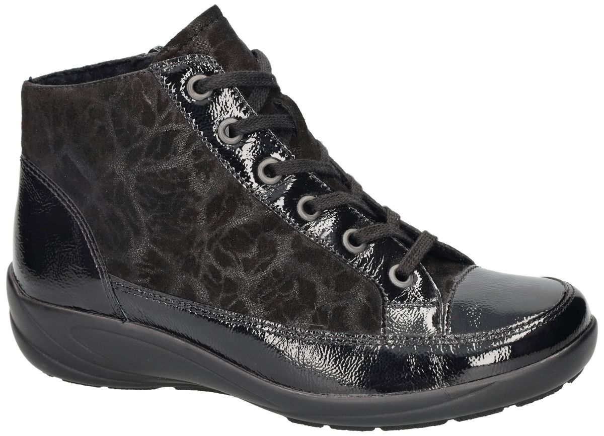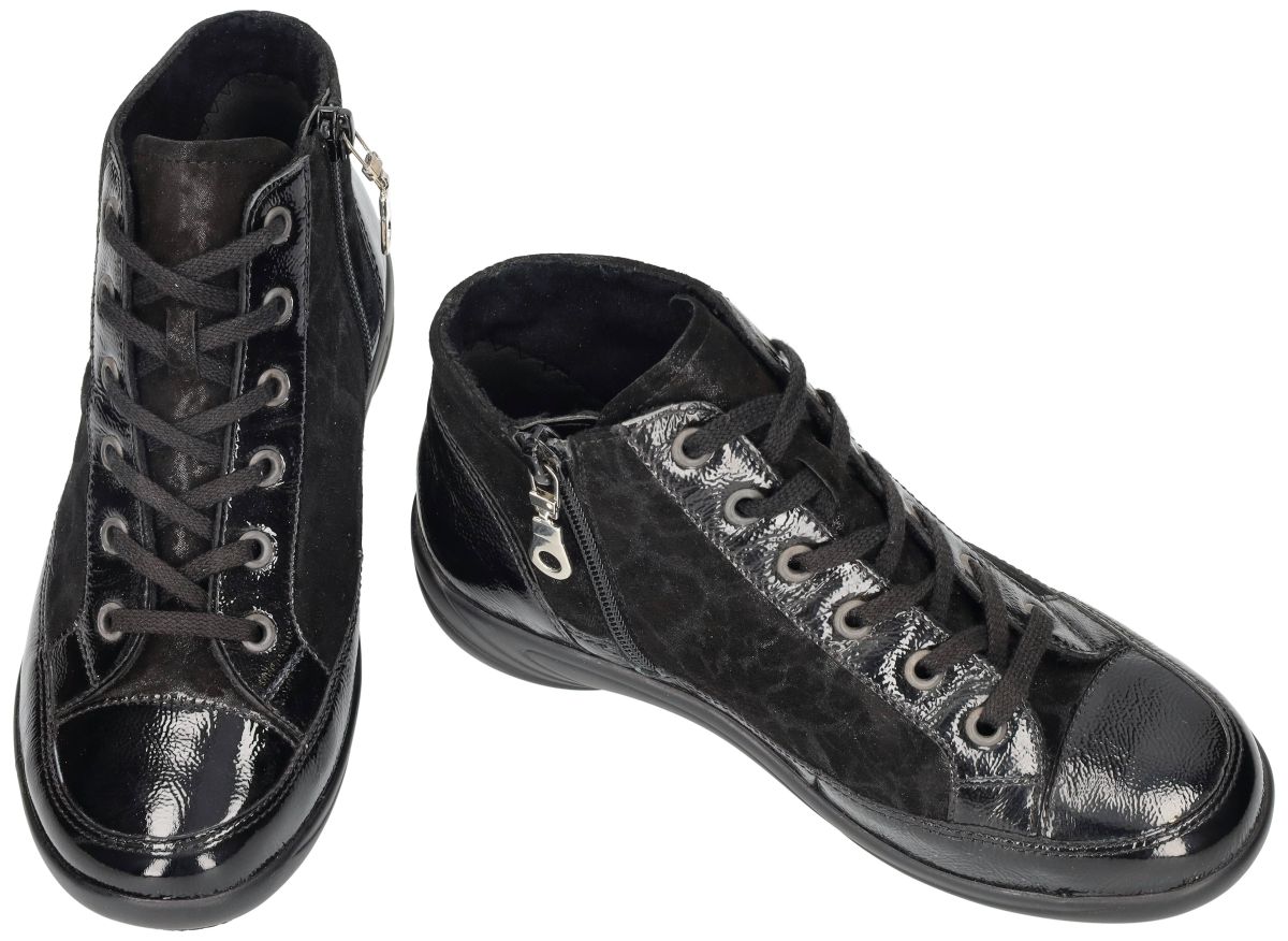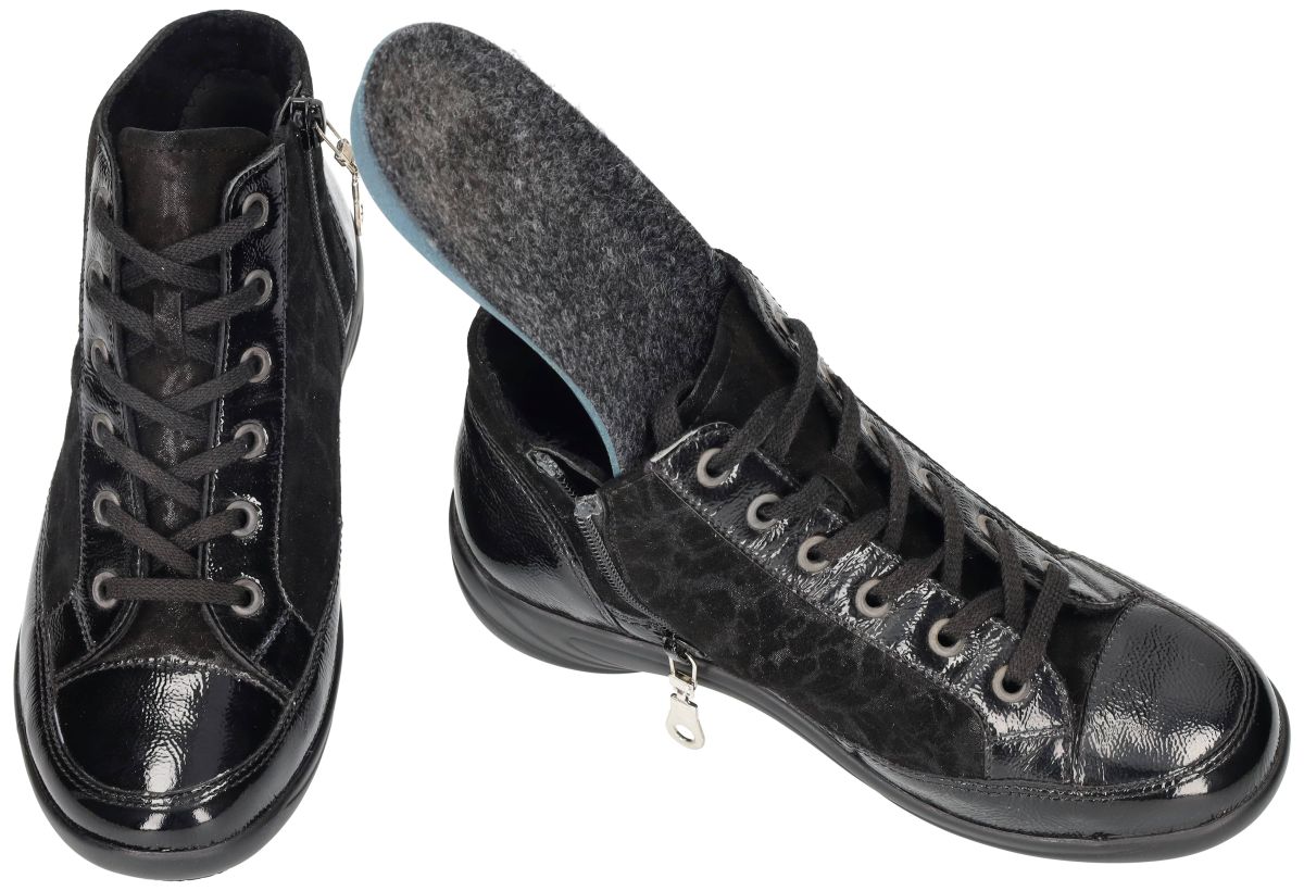 Semler dames boots B71853 – exclusief laatste paar in maat 35! Op zoek naar comfortabele én stijlvolle hoge sneakers in een uitzonderlijk kleine maat? Deze Semler boots met artikelnummer B71853 zijn een echt buitenkansje: het allerlaatste paar beschikbaar in maat 35 (UK 2½). Mis je maat zelden in modieuze comfortmerken? Dan is dit jouw kans! Deze sportieve enkelboots combineren premium materialen met Semler’s gekende pasvorm. De uitvoering is bijzonder verfijnd: – Zwart kreukellak leder zorgt voor een chique glans. – Glinsterend suède met subtiele fantasieprint geeft de schoen een luxueuze, zachte uitstraling. Voor dagelijks draagcomfort werd niets aan het toeval overgelaten. De uitzonderlijk schokdempende zool vangt impact uitstekend op, ideaal voor wie gevoelige voeten heeft of langdurig staat en wandelt. Dankzij de ruimere H-wijdte leest genieten ook iets bredere voeten van een ontspannen pasvorm. Binnenin vind je een dik, uitneembaar voetbed dat zorgt voor extra demping en warmte. Indien gewenst kun je dit eenvoudig vervangen door eigen steunzolen, wat deze Semler boots perfect maakt voor wie extra ondersteuning nodig heeft. De schacht die mooi boven de enkel uitkomt biedt stabiliteit, terwijl de praktische rits gecombineerd met vetersluiting zorgt voor een makkelijke instap én een precies af te stellen draagcomfort. Stijlvol, comfortabel en uniek in maat – deze Semler B71853 boots zijn een echte koopkans voor wie een kleine schoenmaat heeft en kwaliteit zoekt. Perfect voor dagelijks gebruik en combineerbaar met zowel casual outfits als een trendy city look. Wacht niet te lang – zulke pareltjes zijn snel weg!