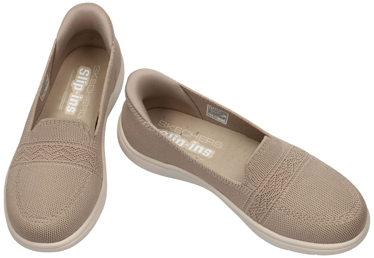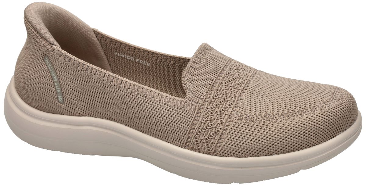 SKECHERS On-The-Go Flex Radiant-Sloane 138435 Taupe. Elegante dames instappers – Luxe comfort en moeiteloos draaggemak. Maak kennis met de SKECHERS On-The-Go Flex Radiant-Sloane in de stijlvolle taupe uitvoering (artikelnummer 138435), een moderne en comfortabele instapper die comfort, gemak en een verfijnde look combineert. Dit model behoort tot de populaire On-The-Go Flex lijn ontworpen voor dames die geen concessies willen doen aan comfort én stijl. Handenvrij instappen hét gemak van Slip-Ins. Dankzij het slimme Hands Free Slip-Ins systeem stap je deze hippe instappers zonder handen aan te trekken gewoon in. Geen gedoe met veters of ritsen, perfect voor onderweg, tijdens het winkelen of voor een stijlvolle casual look. De verstevigde hielconstructie houdt de voet stevig op zijn plek en zorgt voor een aangename, veilige pasvorm. Flexibel comfort bij elke stap. Het interieur van deze Sloane instappers is uitgerust met een Air-Cooled Goga Mat voetbed, dat zich vormt naar je voet en zorgt voor zachte demping en uitstekende steun. De ventilatie van het Air-Cooled voetbed houdt je voeten fris en comfortabel, zelfs bij langere wandelingen of warme dagen. De flexibele On-The-Go Flex zool ondersteunt een natuurlijke loopbeweging en maakt elke stap licht en soepel. Elegante taupe uitstraling . De Radiant-Sloane combineert een tijdloze taupe kleur met een subtiel geweven structuur die er chic en modern uitziet. De klassieke loafer-achtige vorm met afgeronde neus en sportieve details maakt deze sneaker-instapper veelzijdig en makkelijk te combineren met diverse outfits. Of je nu een casual jeans, een rokje of een zomerjurk draagt deze Sneaker-Loafer past altijd. Deze SKECHERS On-The-Go Flex Radiant-Sloane taupe combineert comfort, gebruiksgemak en een tijdloze uitstraling of dus de perfecte instapper voor actieve vrouwen die er altijd verzorgd uit willen zien. SKECHERS damesschoenen vindt men in onze schoenenwinkel regio Aalst, Ninove, Geraardsbergen, Zottegem, Liedekerke of kan men ook gewoon online bestellen op onze webshop.