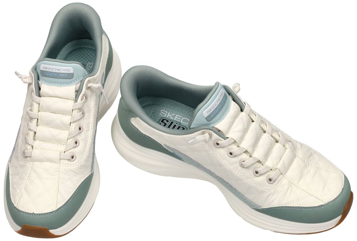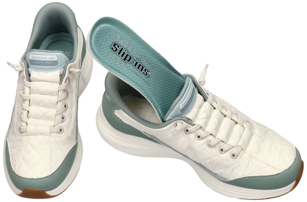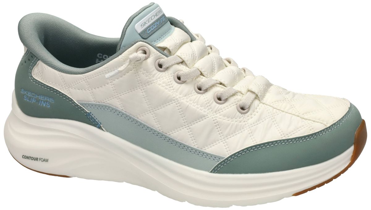 SKECHERS Slip-Ins Cozy Fit – Contour Foam 150404 Sage. Ontdek ultiem comfort met deze stijlvolle SKECHERS Slip-Ins Cozy Fit dames sneakers uit de CONTOUR FOAM lijn, artikelnummer 150404 in de frisse uitvoering white/sage. Deze handenvrije instappers combineren innovatie, design en lichtgewicht comfort in één unieke lente/zomer sneaker. Het originele en creatieve ontwerp springt meteen in het oog. De upper combineert salie-groen en lichtgroen nubuck accenten met een parelmoer-witte matelassé parachutestof met doorgestikt patroon. Dit geeft de sneaker een luxueuze, modieuze uitstraling met een subtiele sportieve toets. Het bovenwerk is gemonteerd op een ultra lichtgewicht witte zool wat zorgt voor een elegante en vrouwelijke afwerking. Dankzij het Skechers Hands Free Slip-Ins systeem stap je moeiteloos in, zonder te bukken of je veters aan te raken. Gewoon instappen en vertrekken – ideaal voor wie comfort en gebruiksgemak belangrijk vindt. Binnenin zorgt het Cozy Fit Contour Foam ontwerp ervoor dat de schoen zich perfect aanpast aan de vorm van je voet. Je voet wordt als het ware luxueus zacht ingepakt, waardoor elke stap aanvoelt alsof je op kussentjes loopt. Extra comfort wordt geboden door het Air-Cooled voetbed met ventilatiegaten, dat zorgt voor optimale luchtcirculatie en frisse voeten, zelfs op warmere dagen. Deze Skechers sneakers zijn bovendien machine wasbaar met koud water, waardoor ze hygiënisch fris blijven en bacteriën geen kans krijgen. Ben je op zoek naar een modieuze, ultra comfortabele en praktische sneaker voor dagelijks gebruik? Dan is deze SKECHERS Cozy Fit Contour Foam Slip-In zonder twijfel één van de zachtste en meest comfortabele sneakers die je ooit zult dragen. SKECHERS damesschoenen vindt men in onze schoenenwinkel regio Aalst, Ninove, Geraardsbergen, Zottegem, Liedekerke of kan men ook gewoon online bestellen op onze webshop.