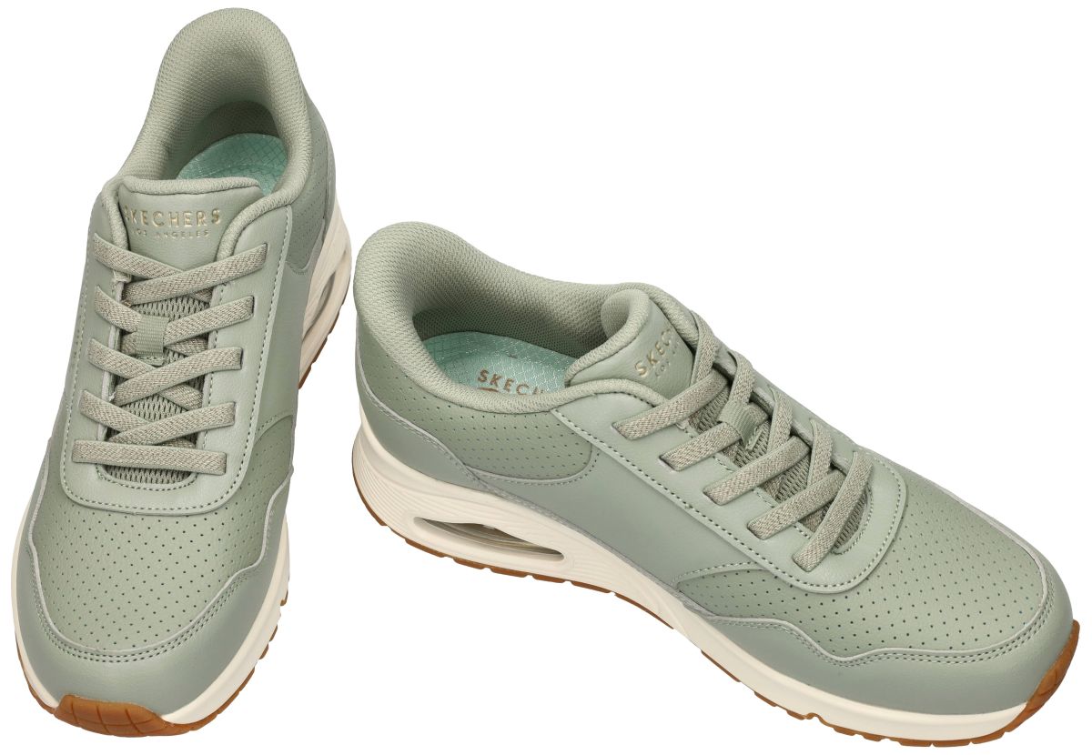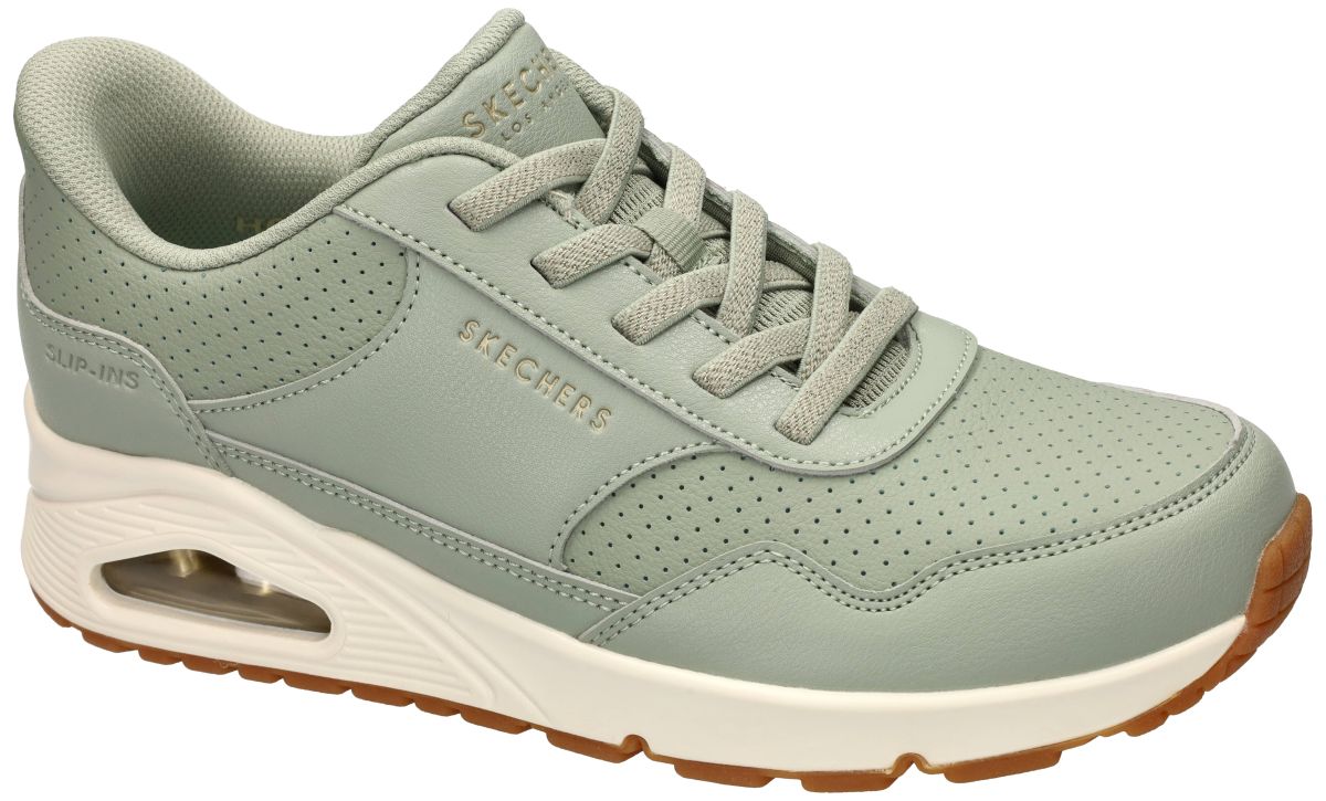 Skechers Uno Banksia Luxe – Hands Free Slip-Ins sneakers (177118 Sage). Ontdek de perfecte combinatie van comfort, gemak en stijlvolle uitstraling met deze trendy Hand Free Slip-Ins sneakers van Skechers in de zachte saliegroene (sage) kleur. De Uno Banksia Luxe art 177118 is een instapmodel dat perfect past bij een moderne, casual lifestyle én comfortgerichte dagen. Handenvrij instappen – gemak boven alles. Dankzij de innovatieve Skechers Hands Free Slip-Ins technologie stap je deze sneaker zonder moeite in, zonder te bukken of veters vast te strikken. Het ergonomische Heel Pillow houdt je voet stevig en comfortabel op zijn plaats terwijl je loopt. Comfort dat je voelt. Het voetbed is uitgerust met Skechers Air-Cooled Memory Foam, dat zorgt voor zachte demping met drukverlichting én een ademend comfort dat je de hele dag fris houdt. Of je nu door de stad wandelt of een lange dag op de been bent, deze sneakers geven je dat aangename ‘op wolken lopen’ gevoel. Skech-Air luchtgedempte tussenzool. De sneaker is voorzien van een zichtbare Skech-Air tussenzool, een luchtkussen-dempingssysteem dat extra bounce geeft bij elke stap. Dit zorgt niet alleen voor een dynamische loopervaring, maar ook voor een moderne retro-sportieve look. Trendy design met luxe details . Het bovenwerk is gemaakt van duurzaam duraleer met subtiele perforaties en saliegroene accenten. De elastische No Tie Fit veters blijven altijd netjes zitten en geven de sneaker een luxe finishing touch. De flexibele rubberen buitenzool biedt grip en stabiliteit. Deze Skechers Uno Banksia Luxe Sage is een ideale keuze voor dames die stijl en comfort willen combineren met ultiem draaggemak. Perfect voor dagelijks gebruik, casual outfits of een actieve lifestyle – elke stap voelt zacht en energiek aan. SKECHERS damesschoenen vindt men in onze schoenenwinkel regio Aalst, Ninove, Geraardsbergen, Zottegem, Liedekerke of kan men ook gewoon online bestellen op onze webshop.