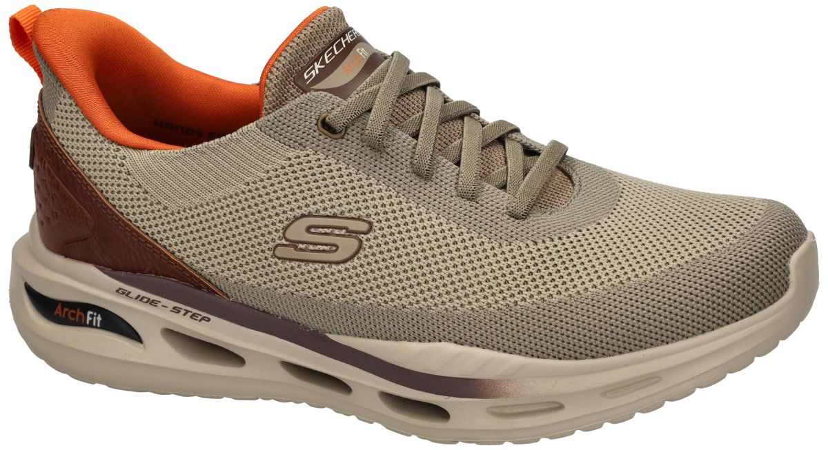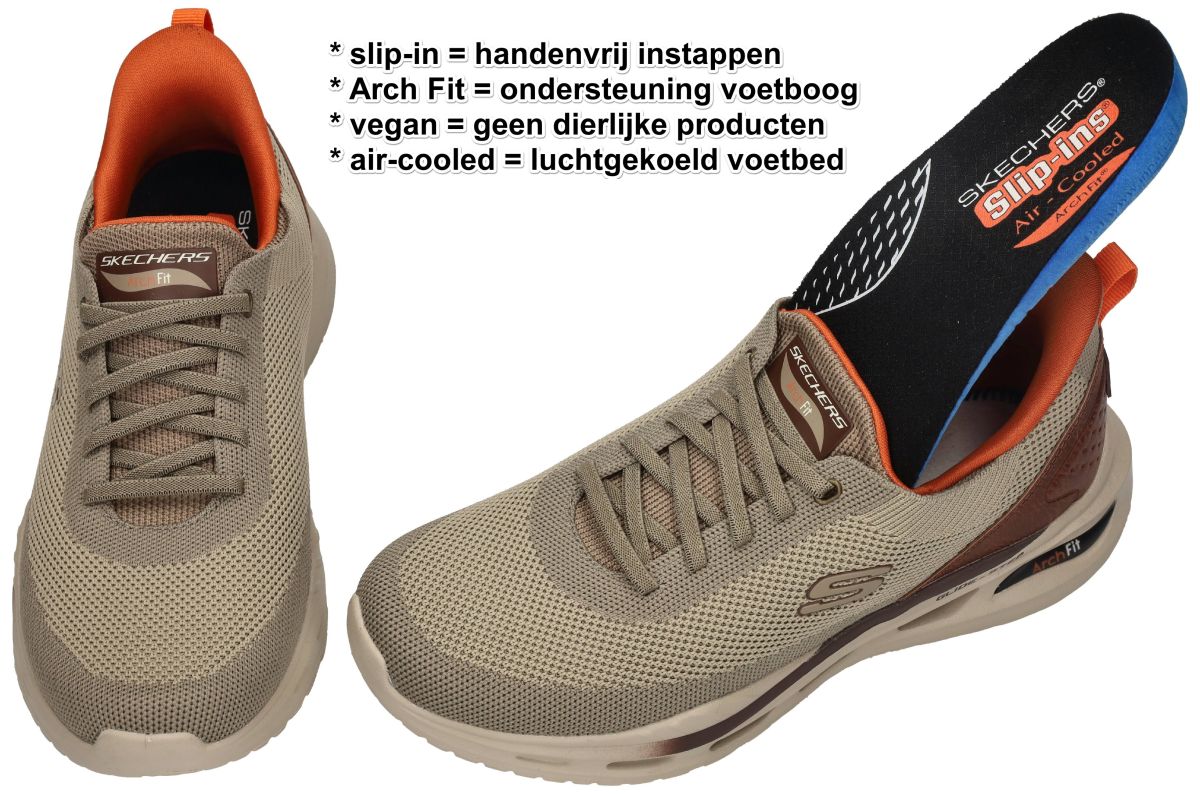 SKECHERS Arch Fit Orvan-Kincade slip-in herensneakers – taupe (artikel 210994) Deze SKECHERS Arch Fit Orvan-Kincade herensneakers combineren modern comfort met een sportief-verzorgde uitstraling. Dankzij het Slip-Ins® handsfree instapsysteem trek je deze schoenen moeiteloos aan, zonder bukken of veters strikken. Ideaal voor wie dagelijks comfort en gebruiksgemak belangrijk vindt. Het ademende engineered mesh bovenwerk in een stijlvolle taupekleur voelt licht en soepel aan en vormt zich mooi rond de voet. Binnenin zorgt het Skechers Arch Fit® voetbed, ontwikkeld in samenwerking met podologen, voor een uitstekende ondersteuning van de voetboog en een gelijkmatige drukverdeling. Het Air-Cooled ontwerp van het voetbed bevordert de ventilatie en helpt de voeten fris te houden, zelfs bij langdurig dragen. De Glide-Step® tussenzool met geometrische uitsparingen zorgt voor een veerkrachtige, dempende afwikkeling en een aangenaam loopgevoel. Dit model is uitgevoerd in Relaxed Fit®, wat extra ruimte biedt aan de voorvoet en wreef – ideaal voor mannen met iets bredere of gevoeligere voeten. Bovendien is deze sneaker volledig vegan, vervaardigd zonder dierlijke materialen. De Orvan-Kincade is een veelzijdige keuze voor dagelijks gebruik: perfect onder een jeans of chino, maar ook geschikt voor actieve dagen, citytrips of lange wandelingen waarbij comfort centraal staat. Een ideale comfortsneaker voor mannen die stijl, ondersteuning en gemak willen combineren in één moderne schoen. Skecher herenschoenen vindt men in onze schoenenwinkel regio Aalst, Ninove, Geraardsbergen, Zottegem, Liedekerke of kan men online bestellen op onze webshop.